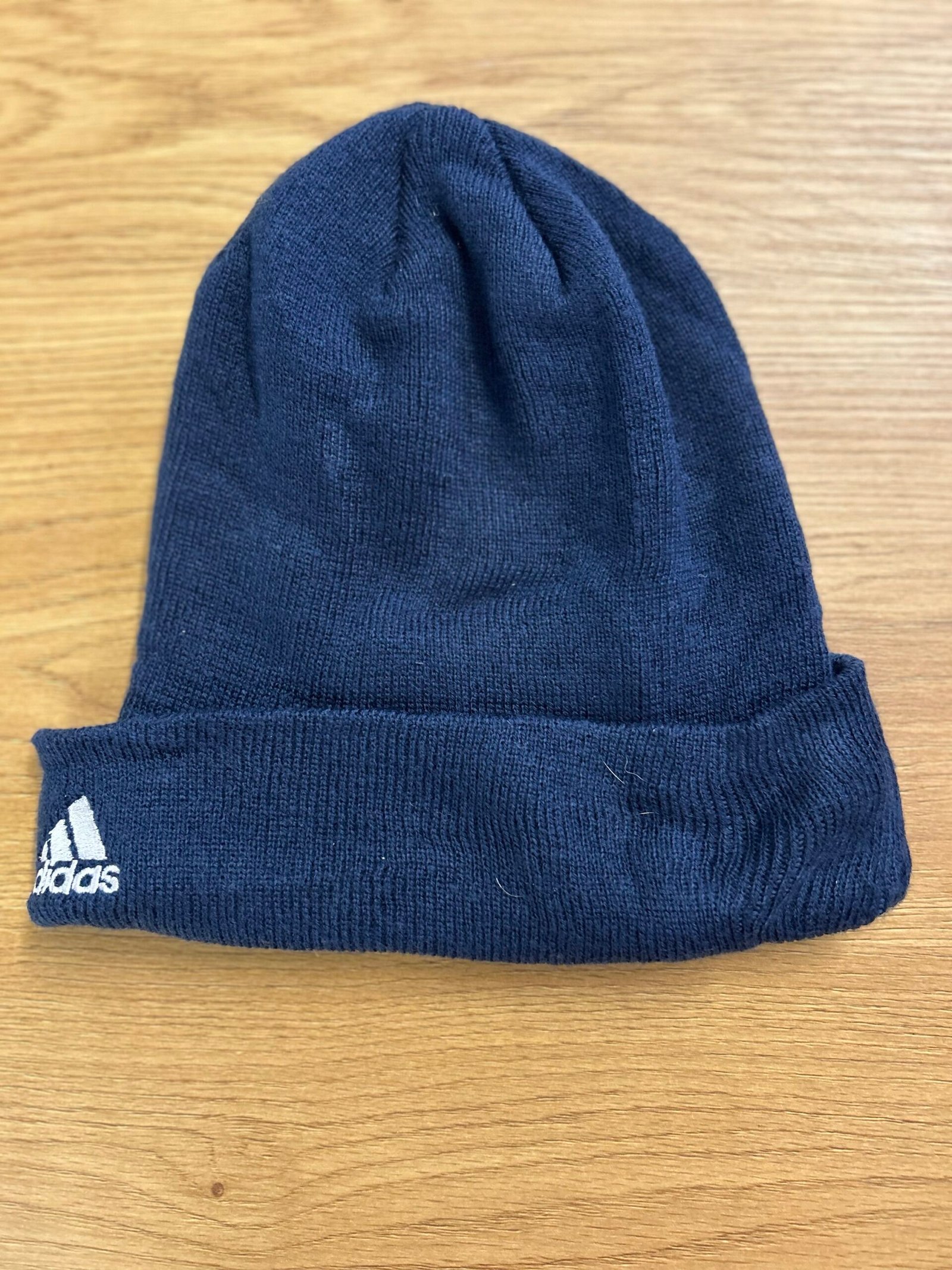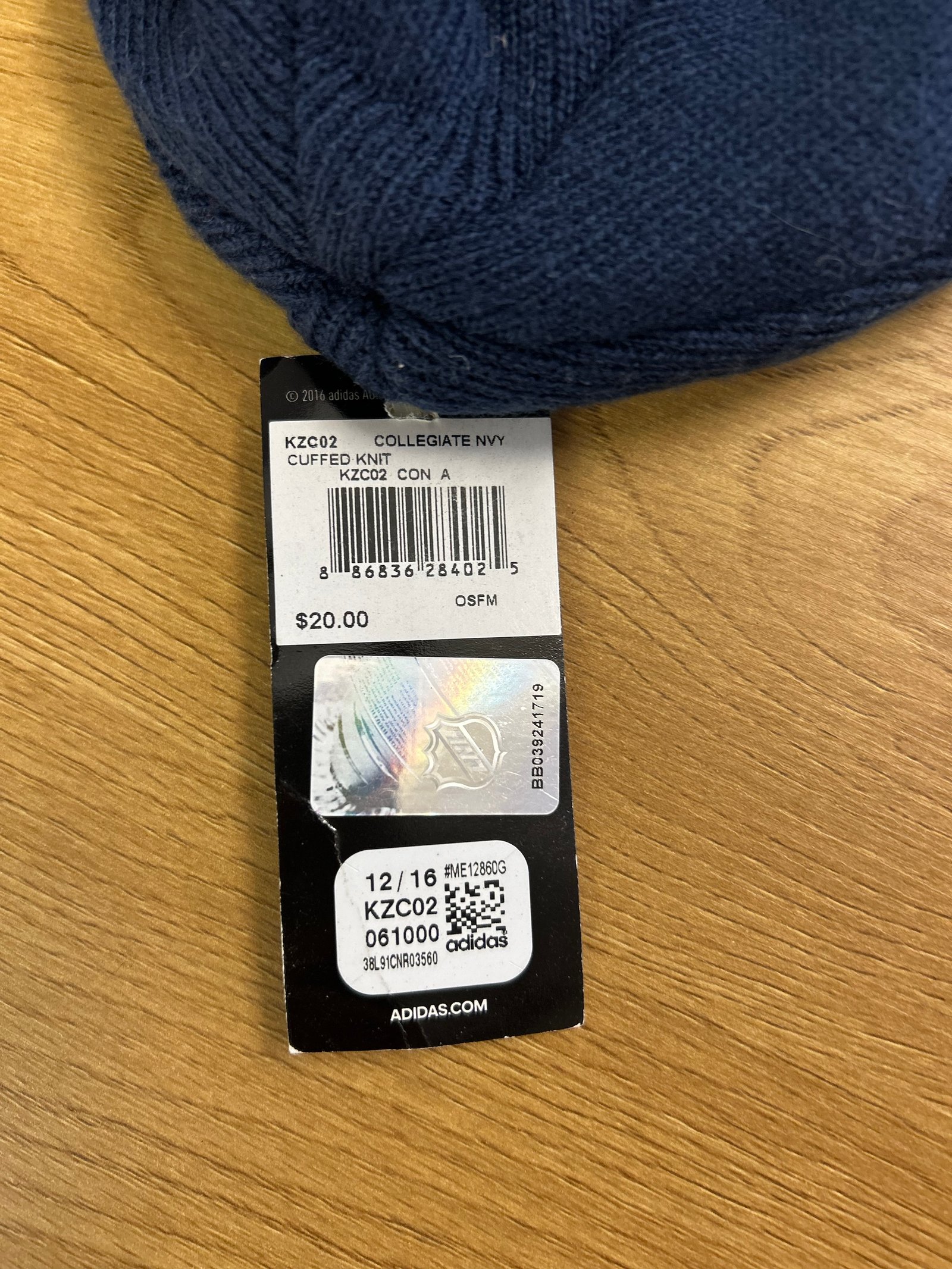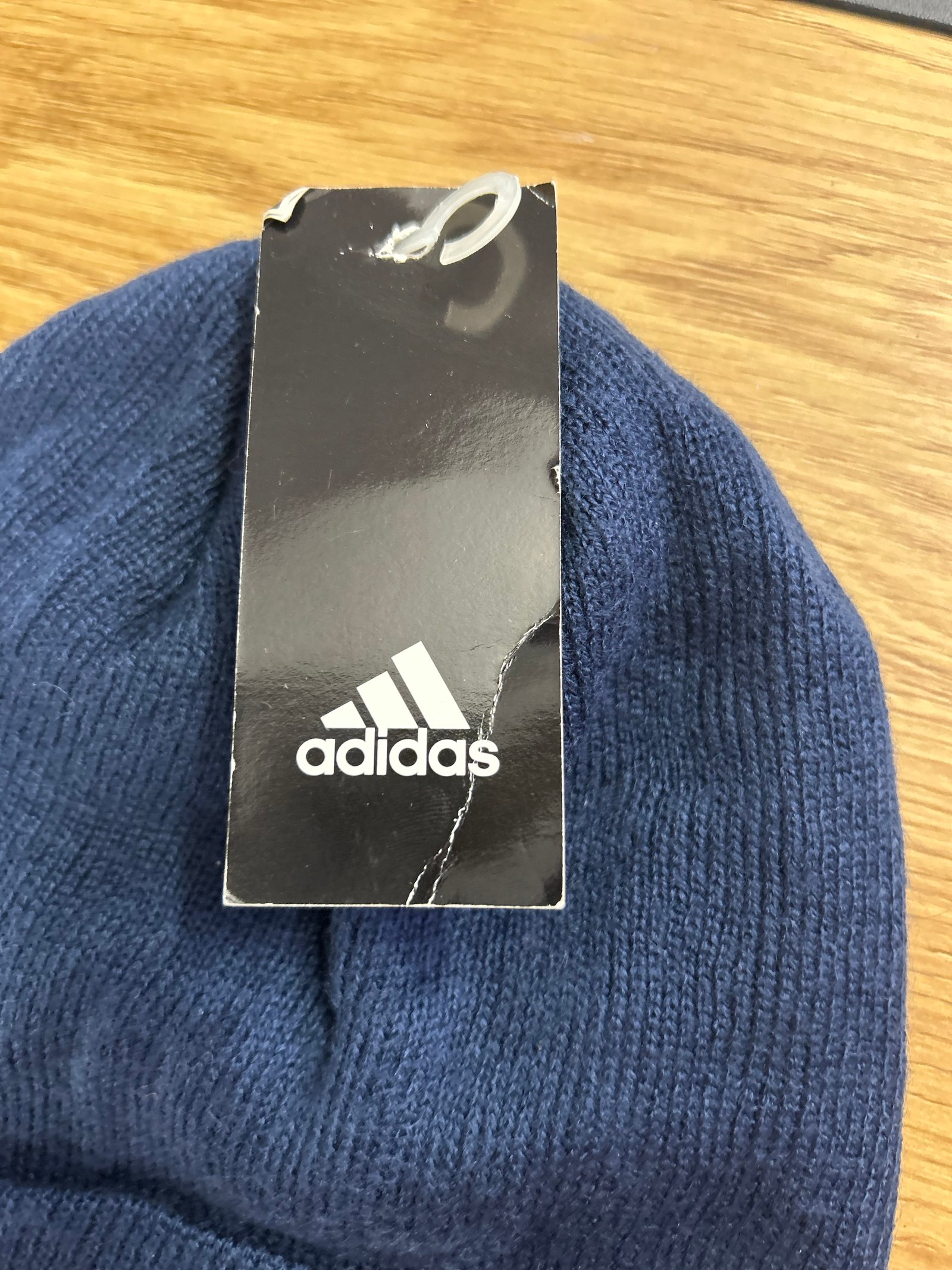 Modello beanie in tinta unita blu con stemma davanti e logo Adidas laterale