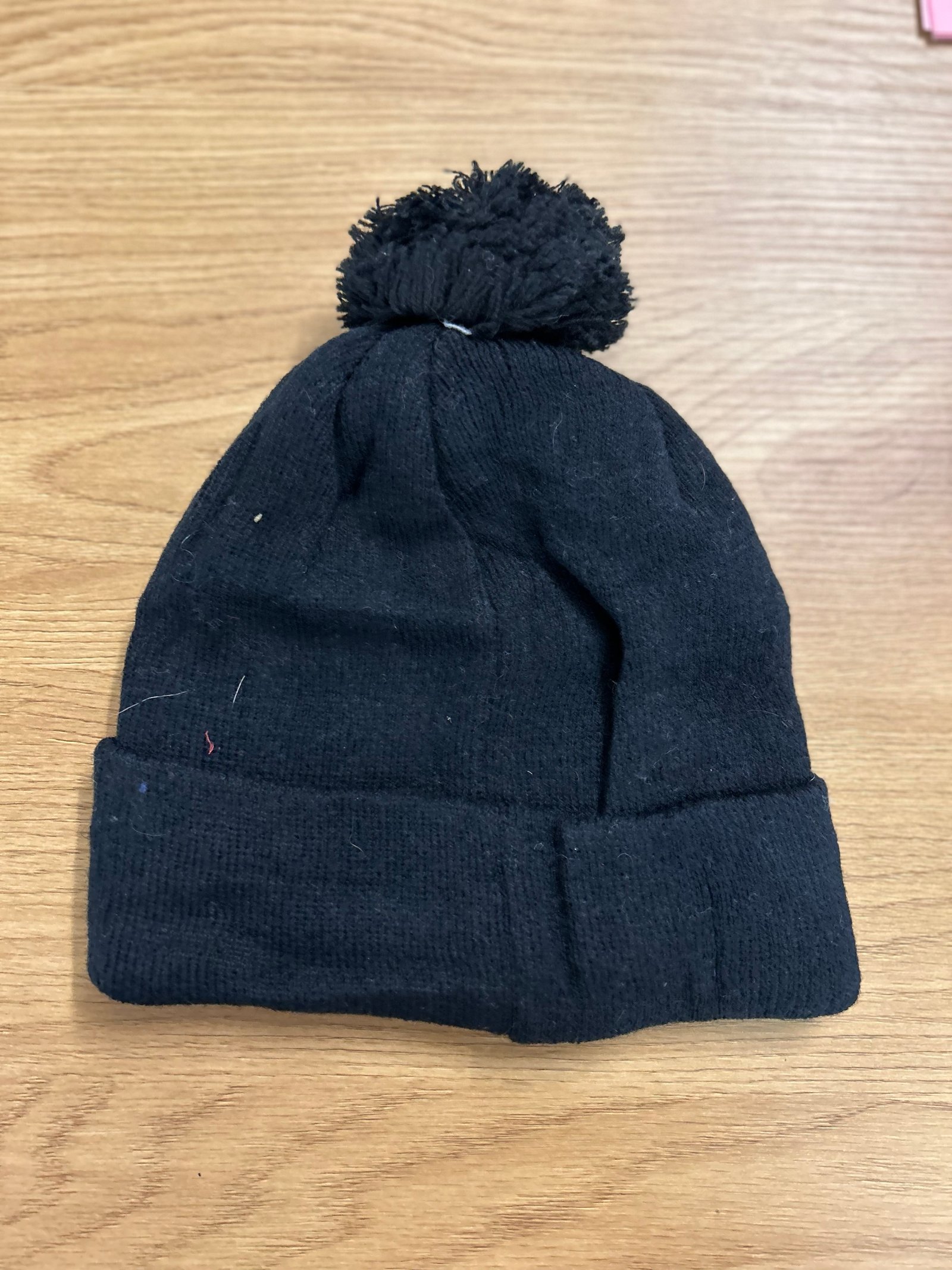 Modello con pompon in tinta unita nero con logo davanti
