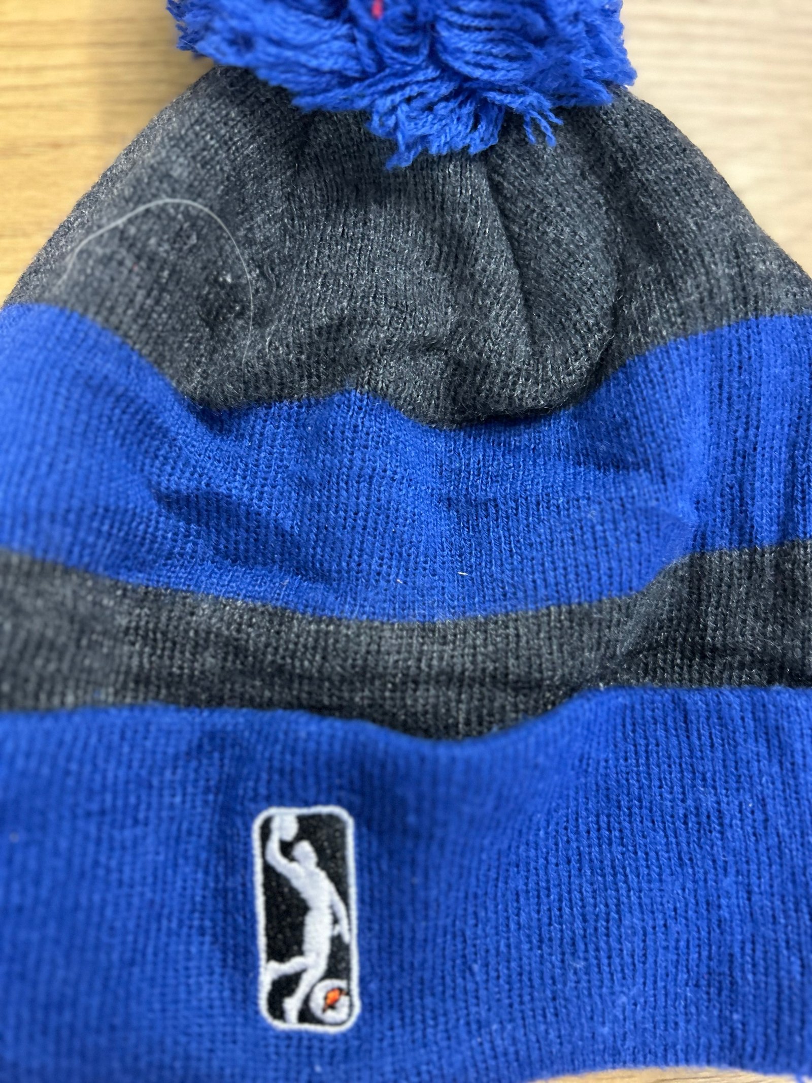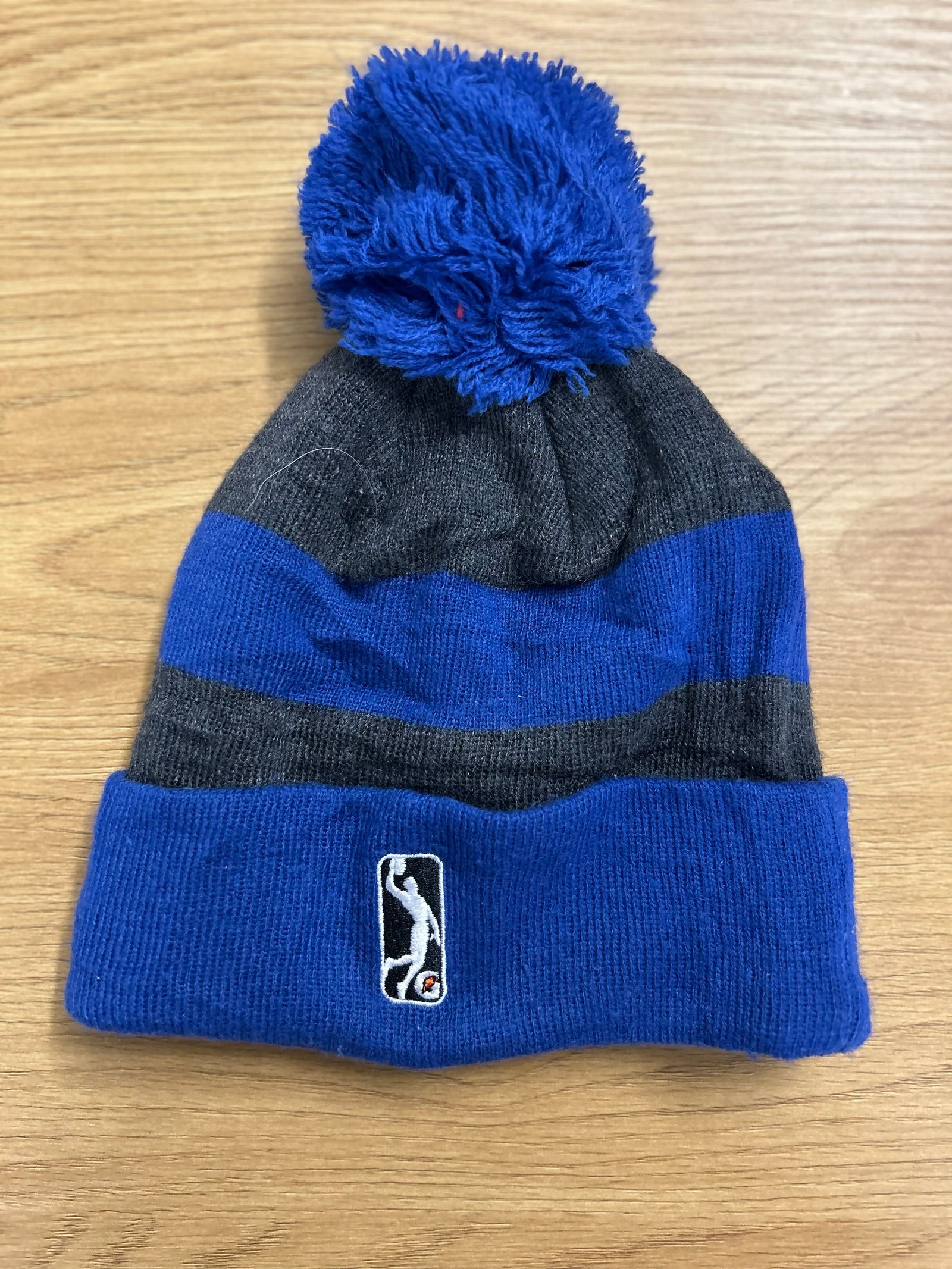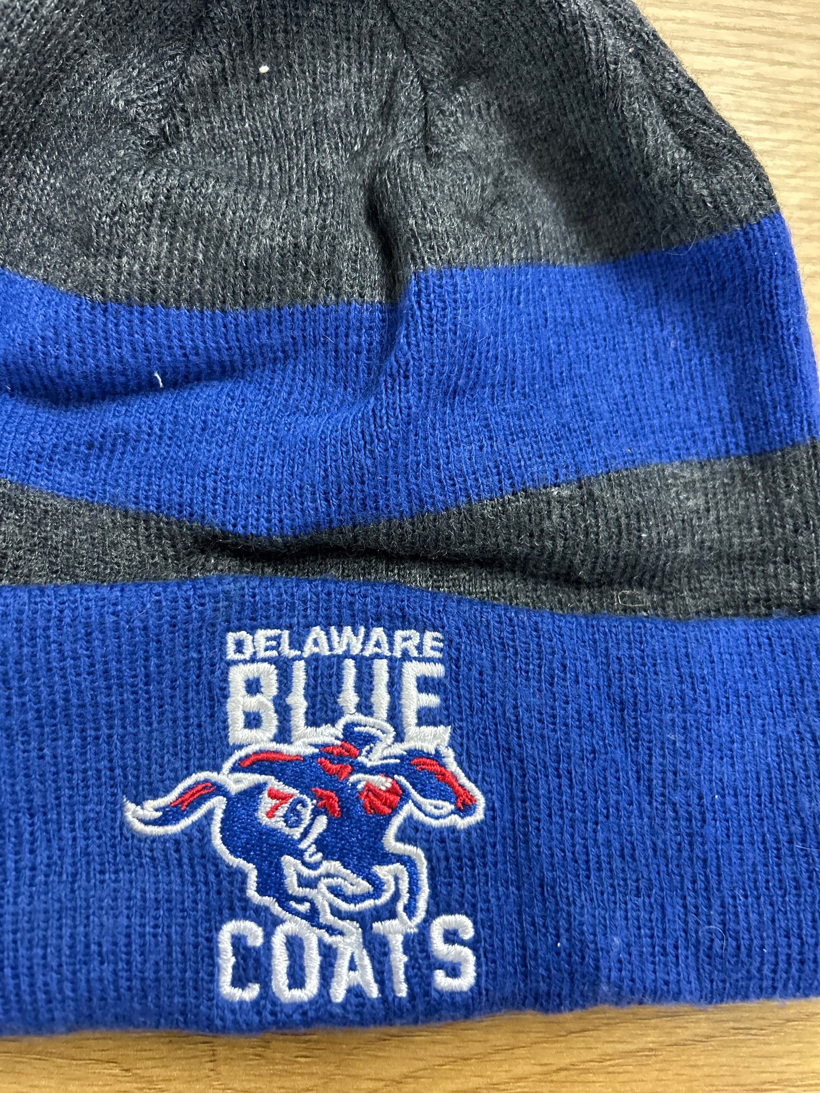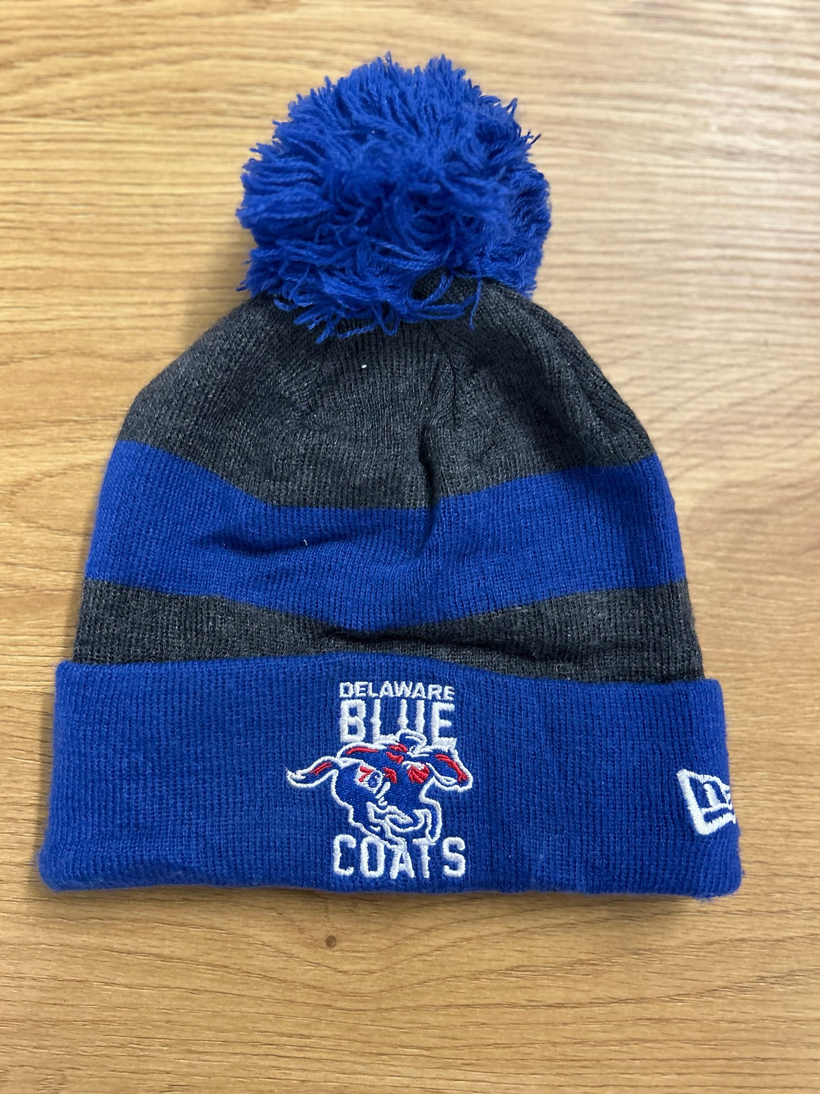 Modello con pompon a righe azzurre e grigie con logo davanti e dietro