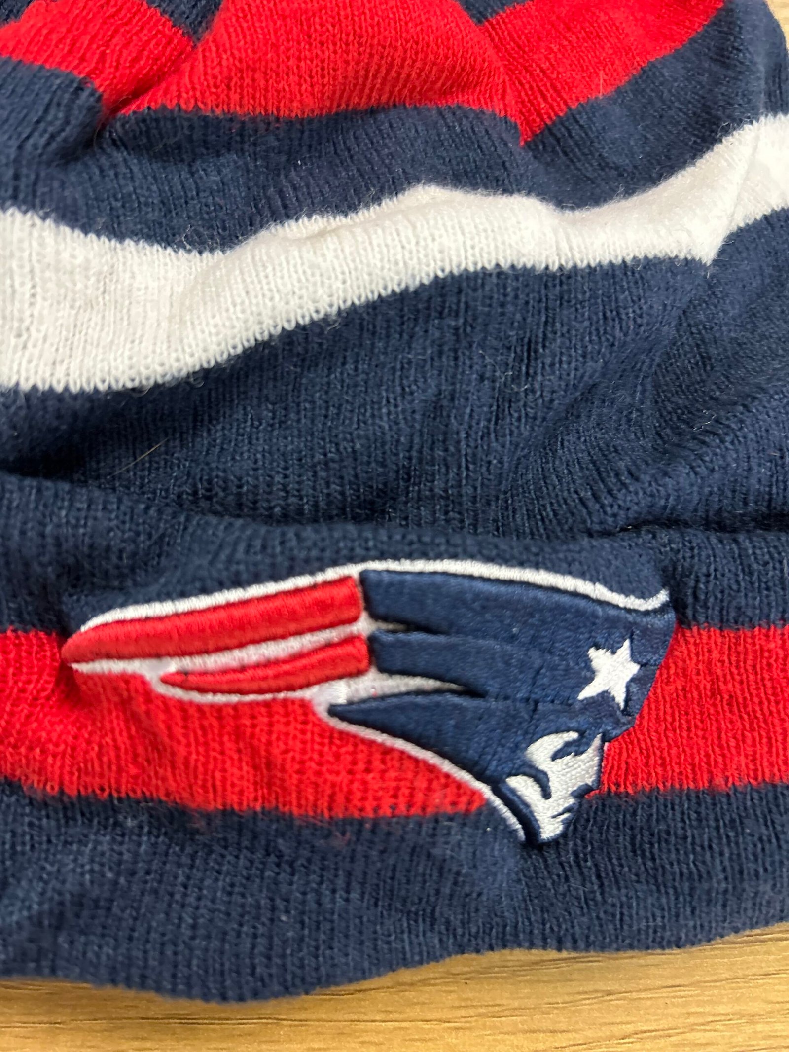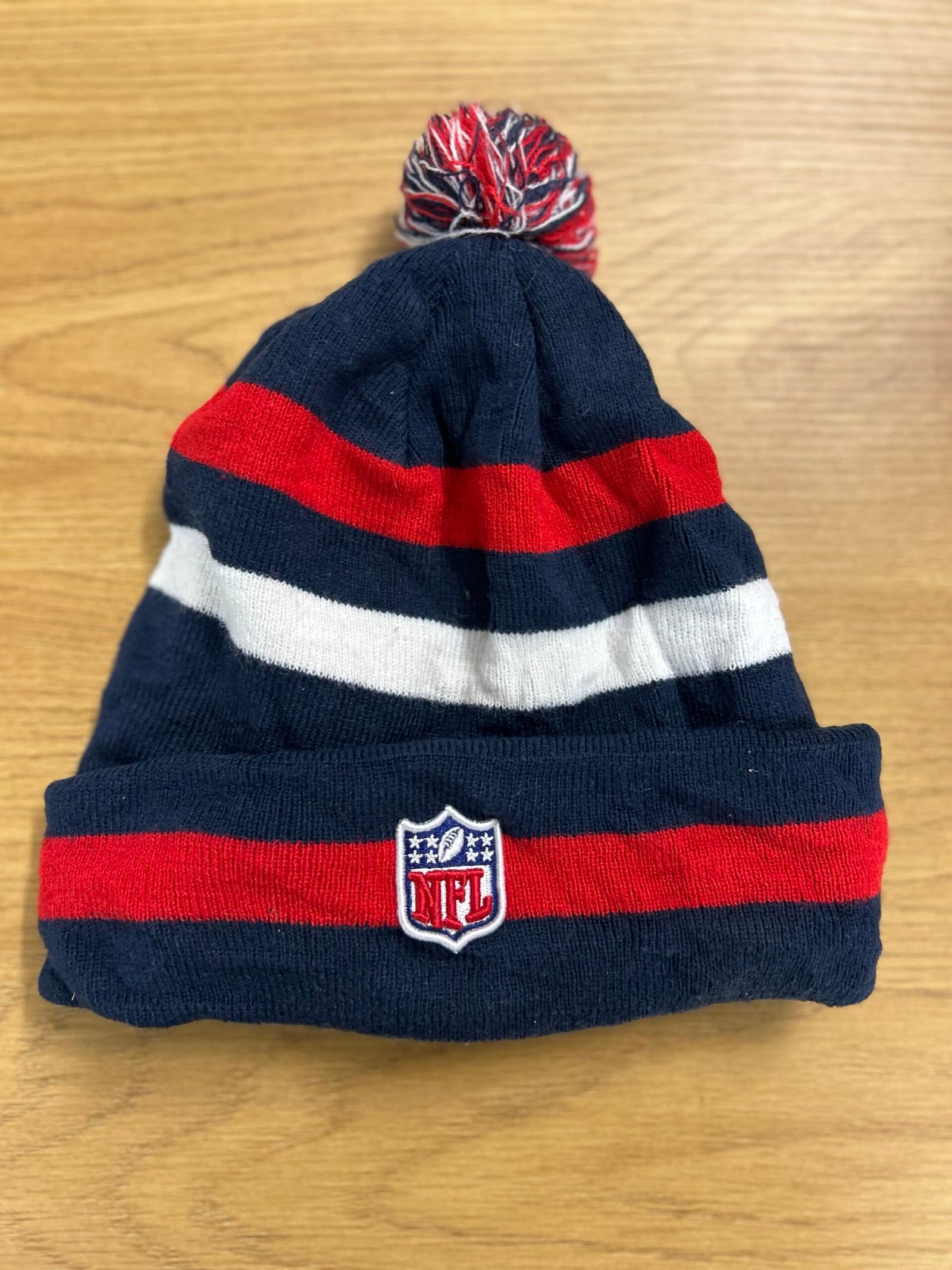 Modello con pompon a righe rosse e bianche su fondo blu, con loghi cuciti davanti e dietro sul risvolto e interno foderato in pile