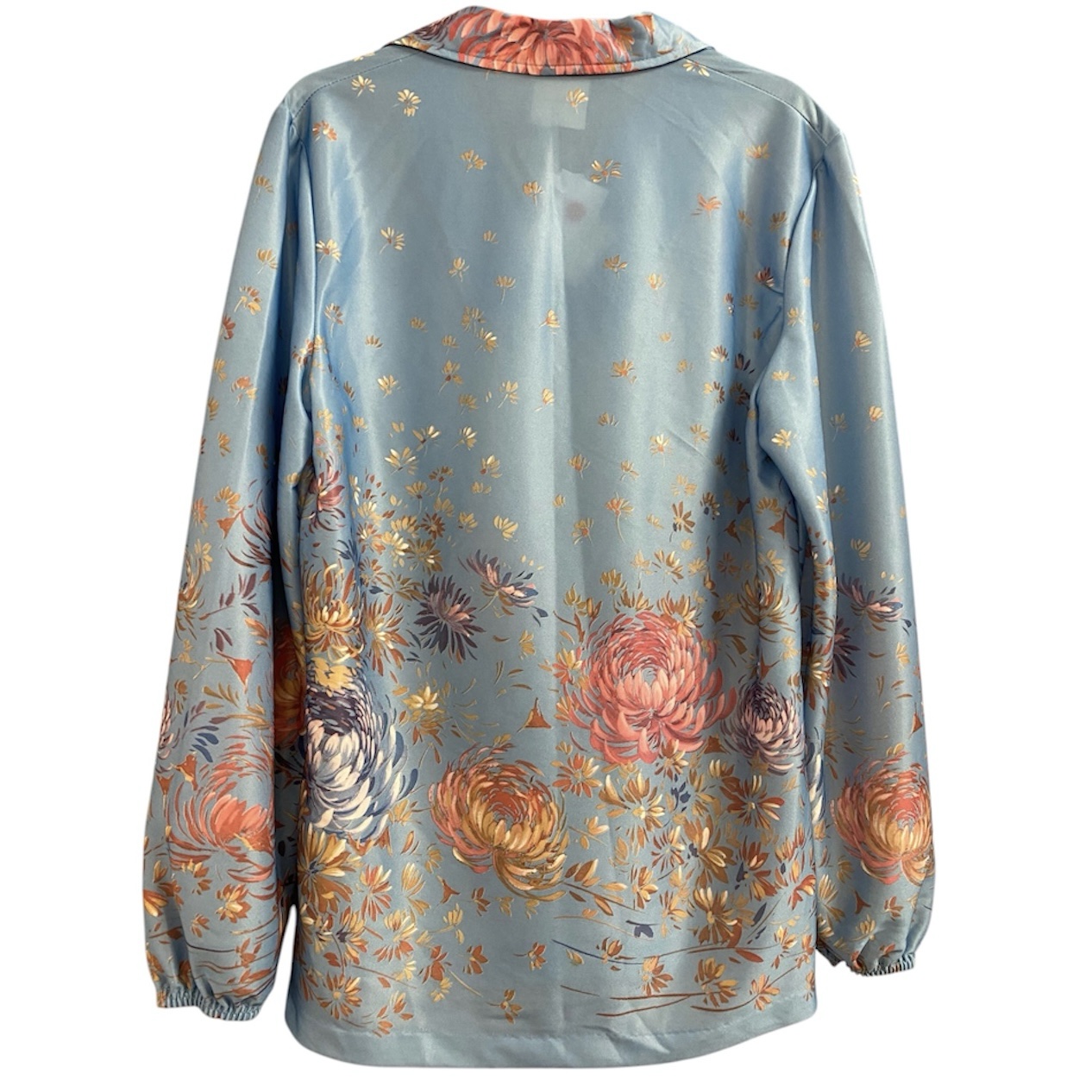 Celeste con scollo a V aperto, collo a camicia, in fantasia con ninfee su fondo celeste
