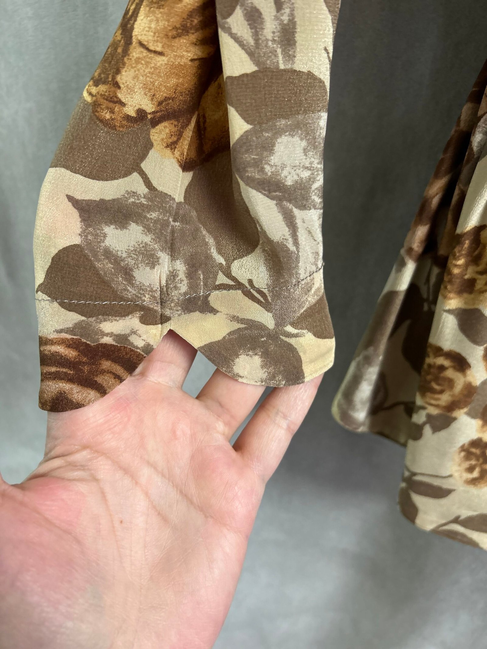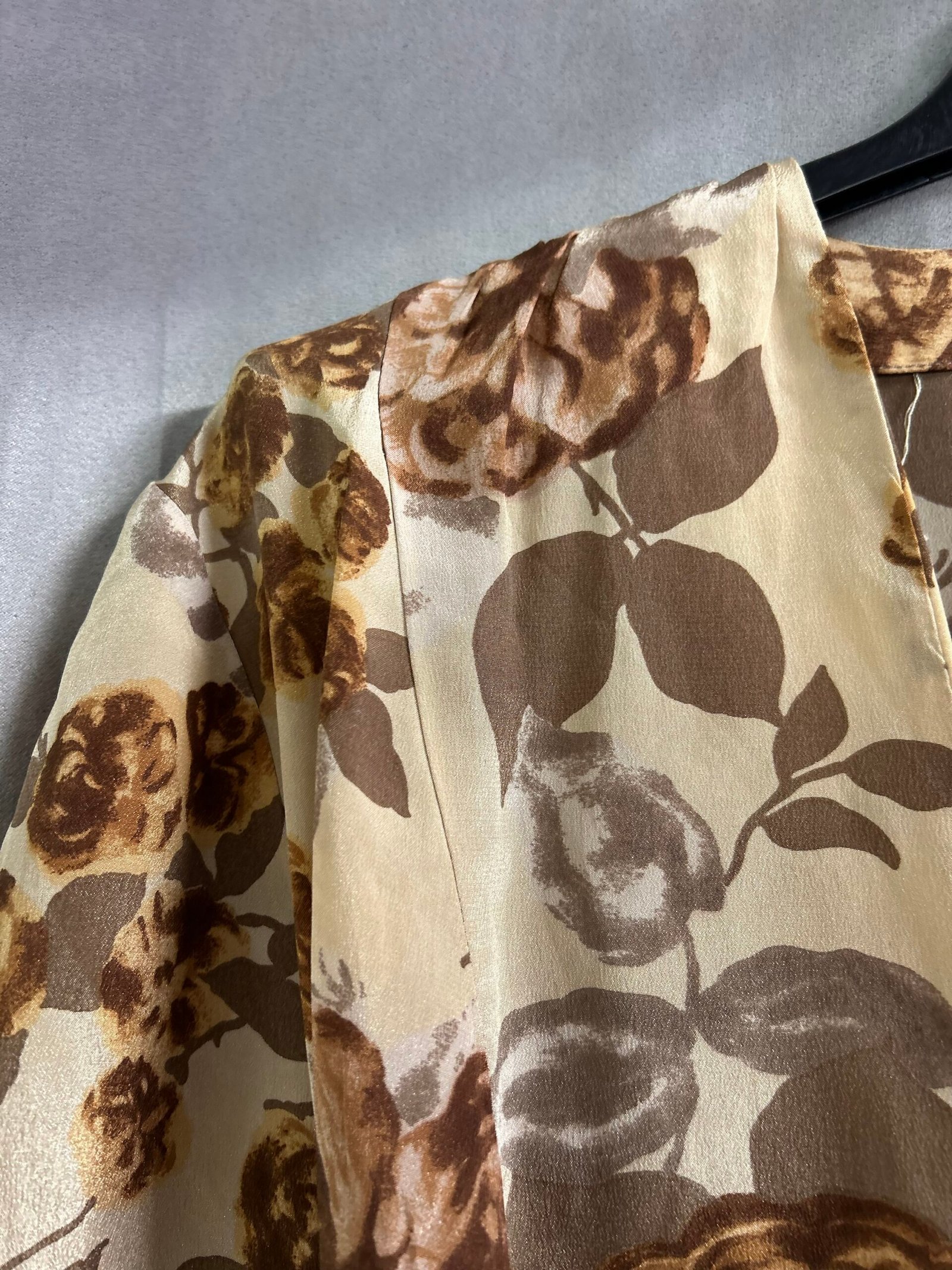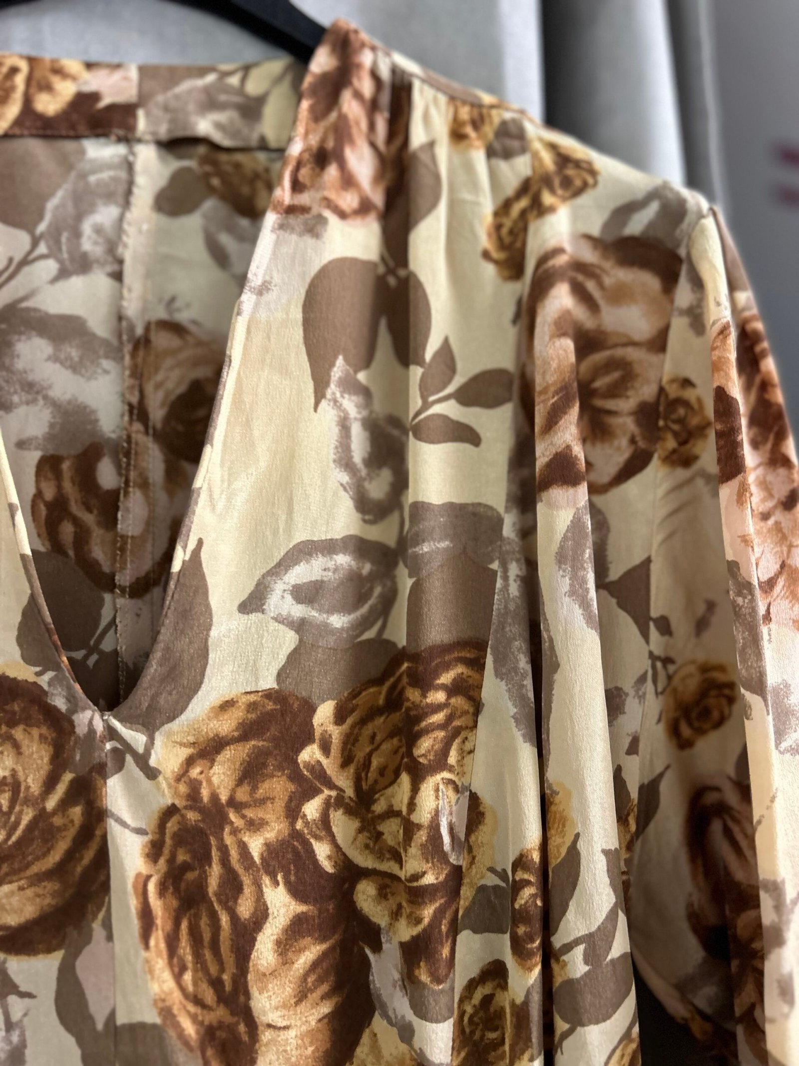 Dalla morbidezza e qualità del tessuto direi seta, taglia direi M circa, perché anche se morbida è molto drappeggiata e rischiate che tiri nelle cuciture e/o faccia difetto