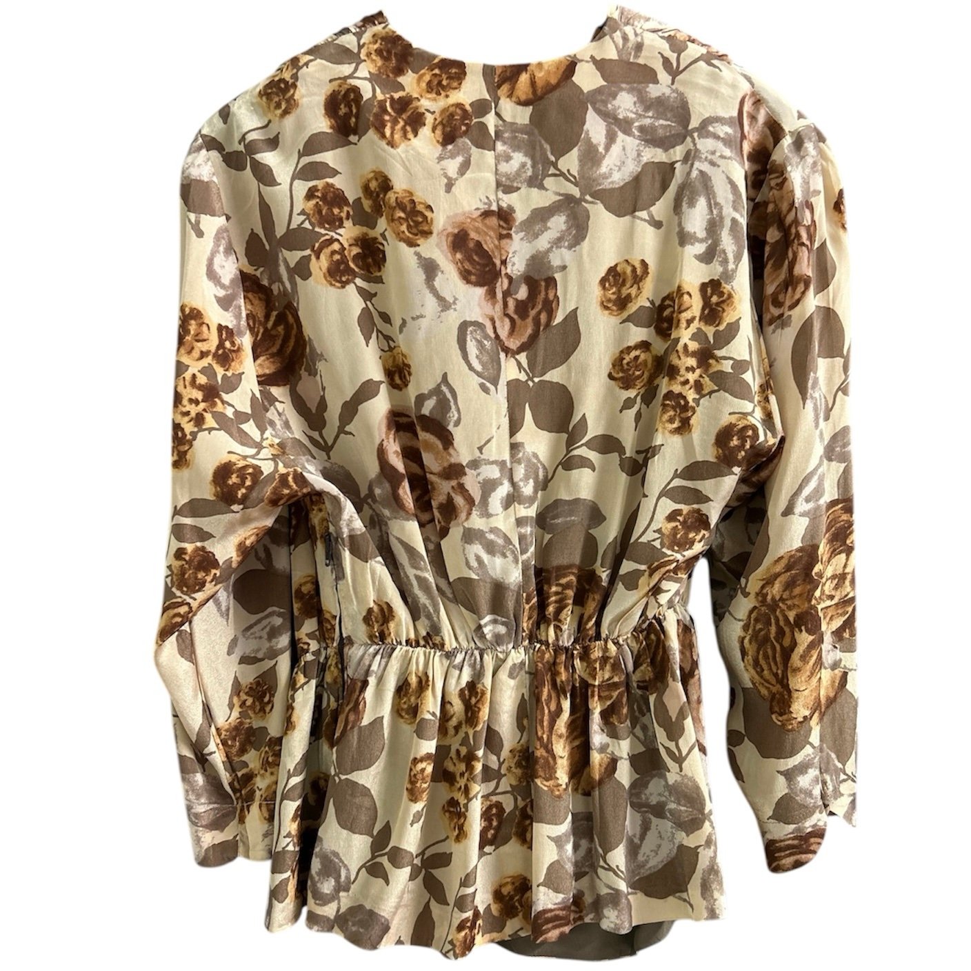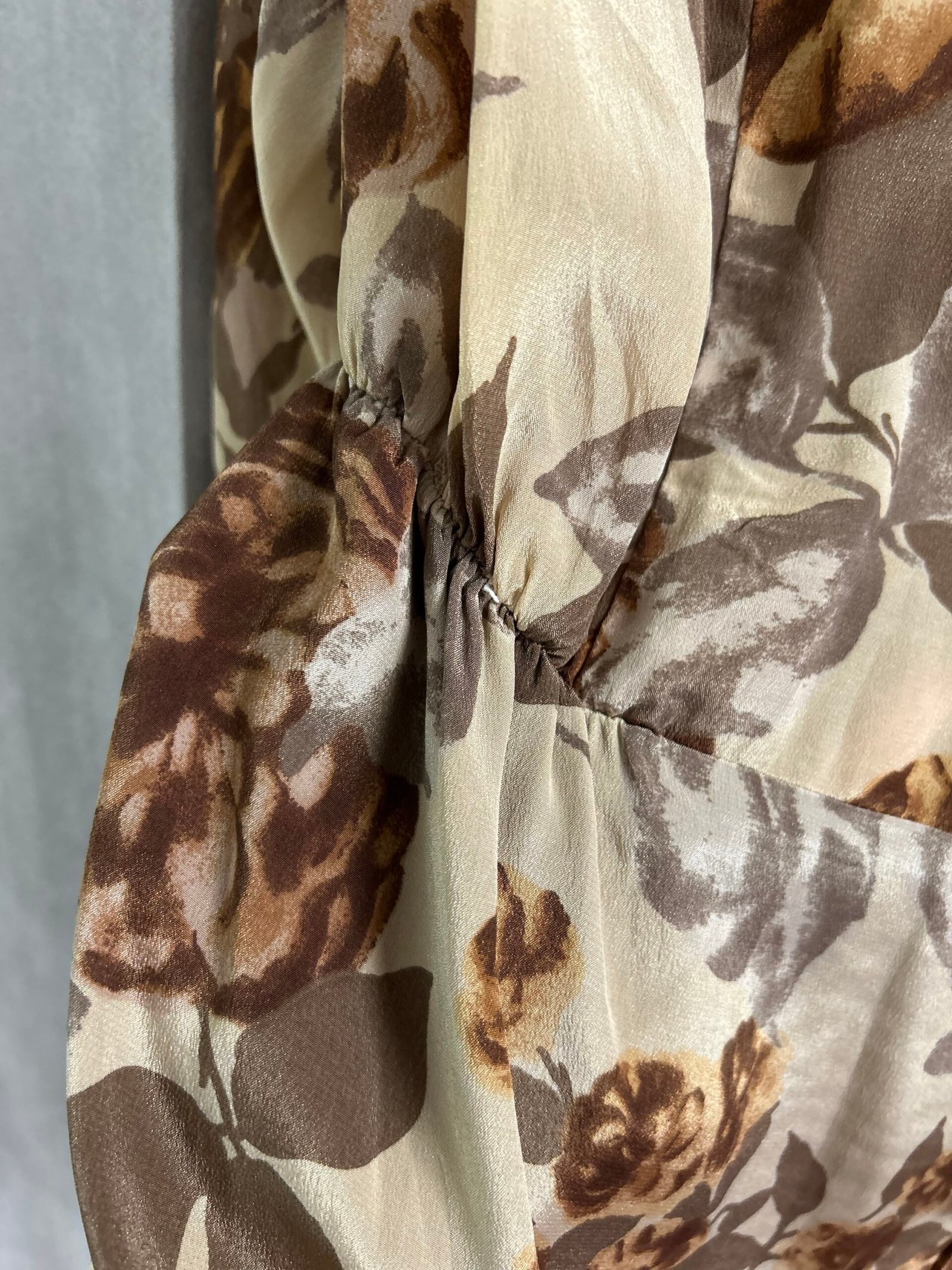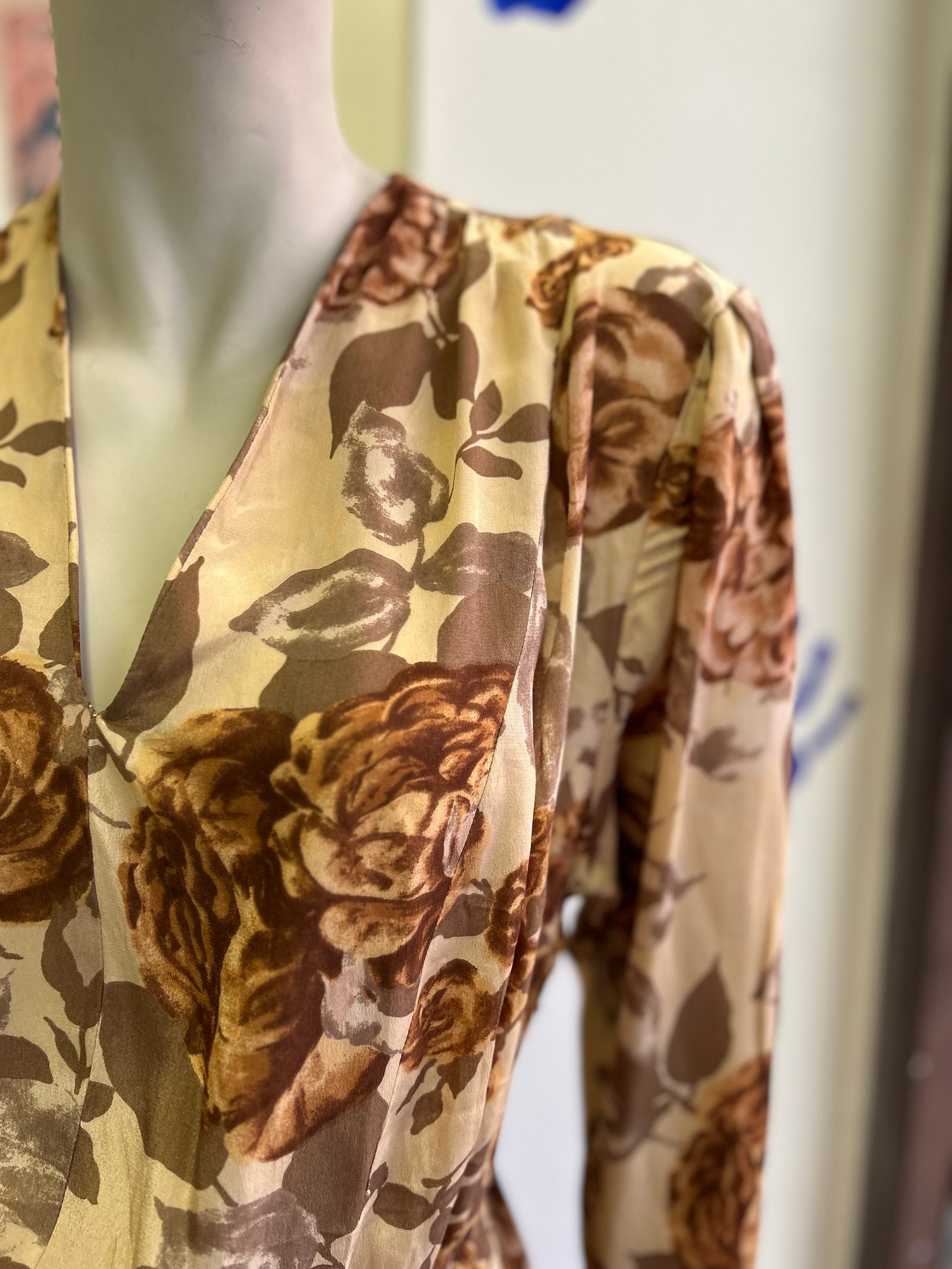 Dalla morbidezza e qualità del tessuto direi seta, taglia direi M circa, perché anche se morbida è molto drappeggiata e rischiate che tiri nelle cuciture e/o faccia difetto