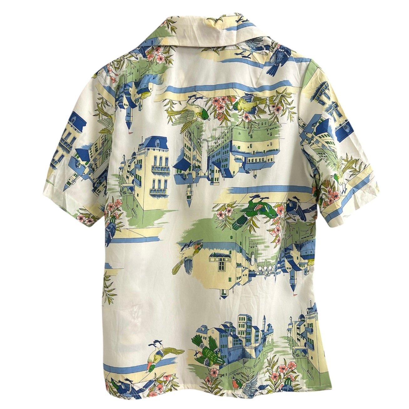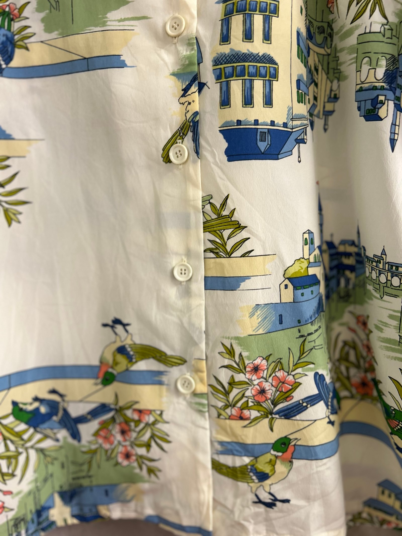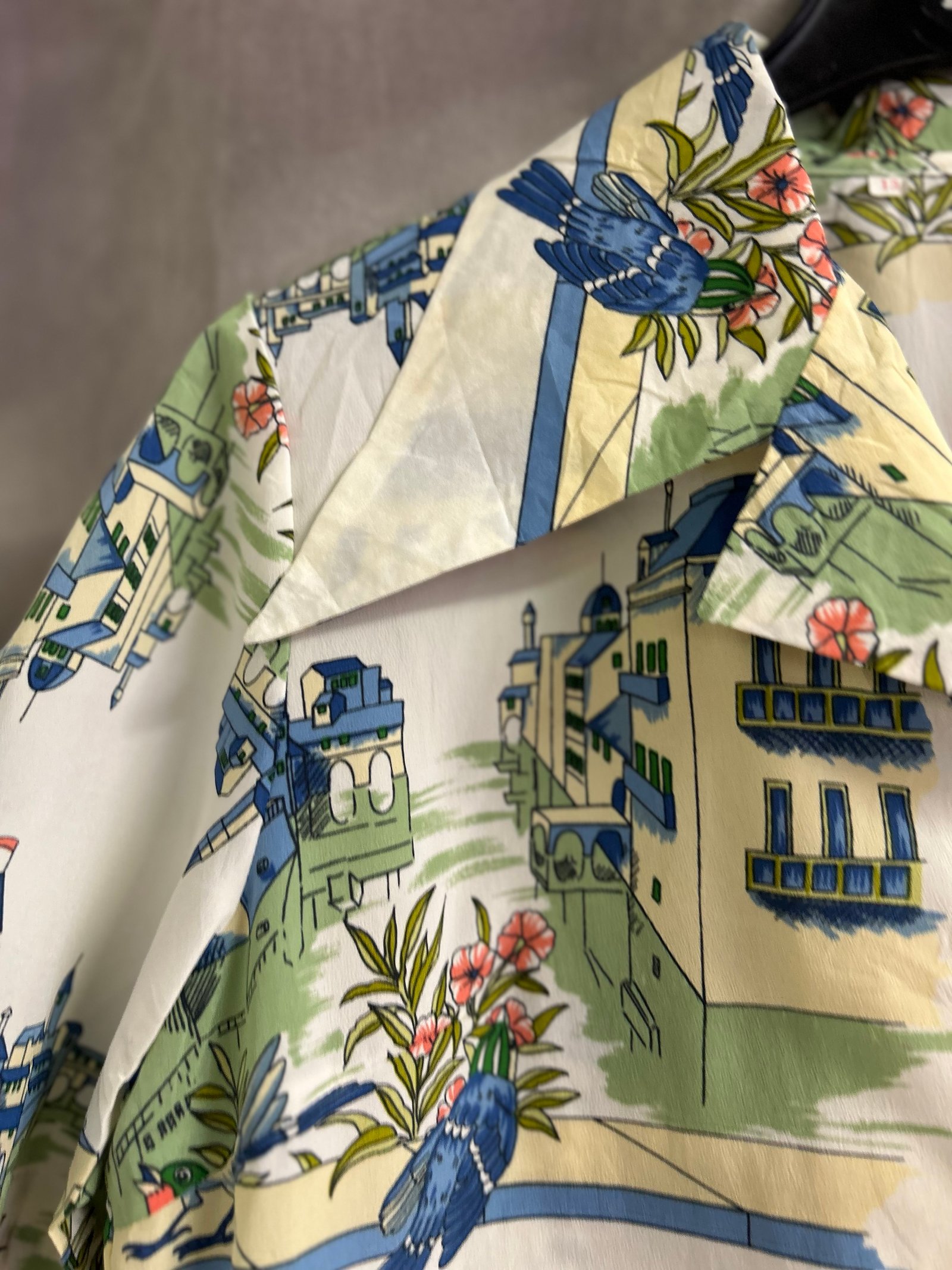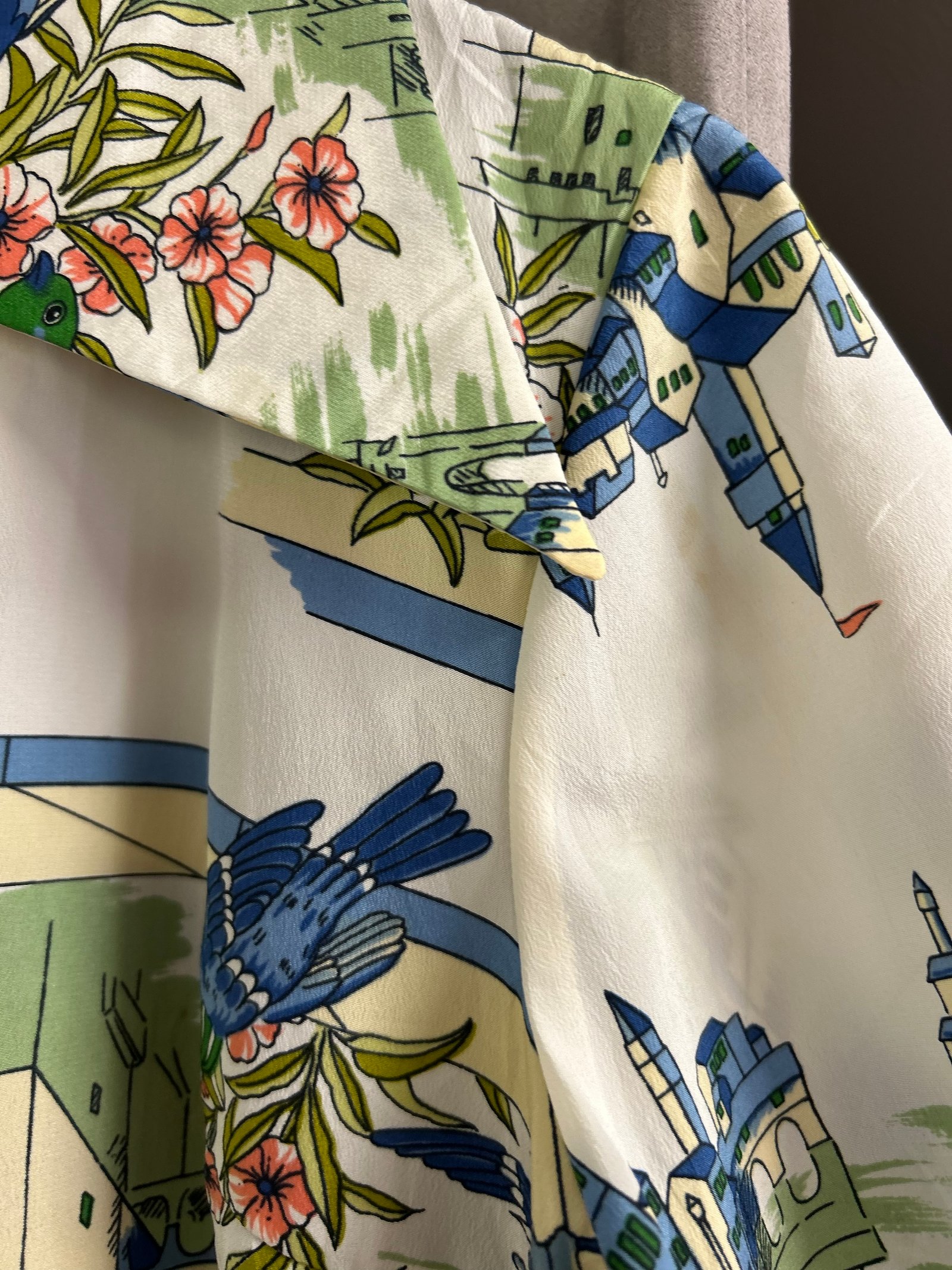 Modello anni ’70, con colletto con pinzi in fantasia con scorci di città su fondo beige