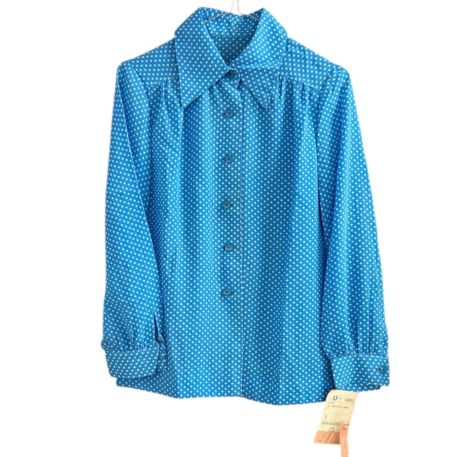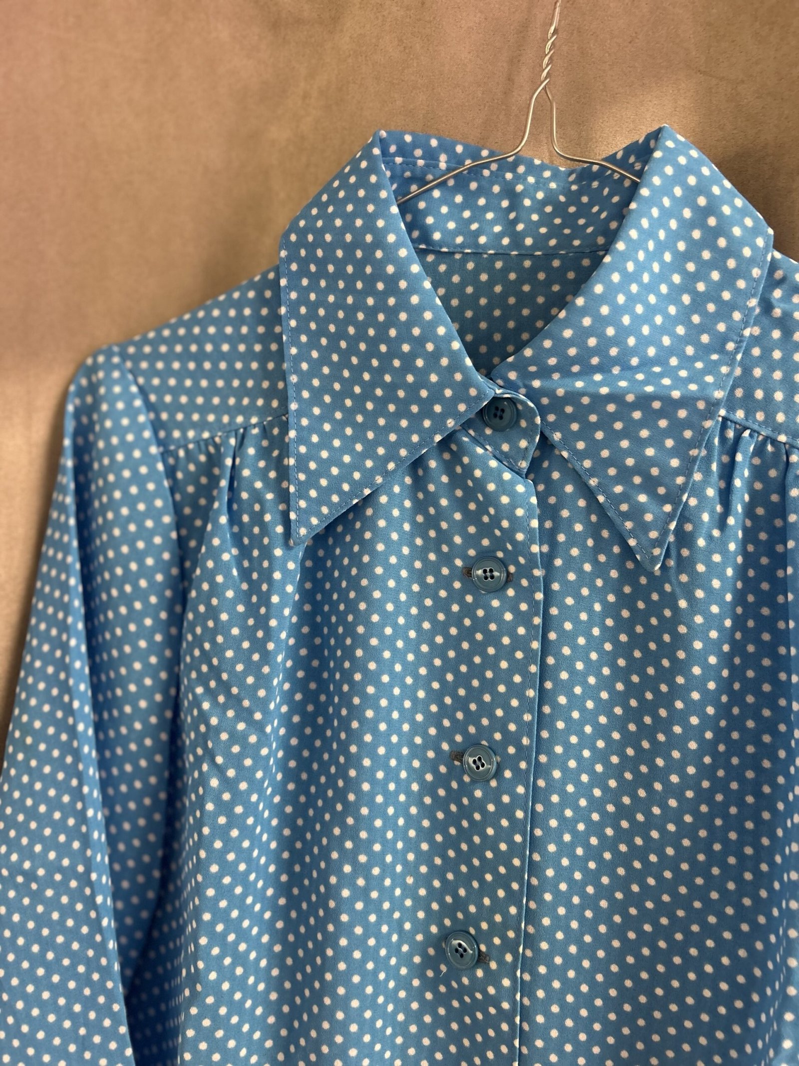 Modello anni ’70, con manica leggermente a palloncino, in fantasia a pois bianchi su fondo azzurro