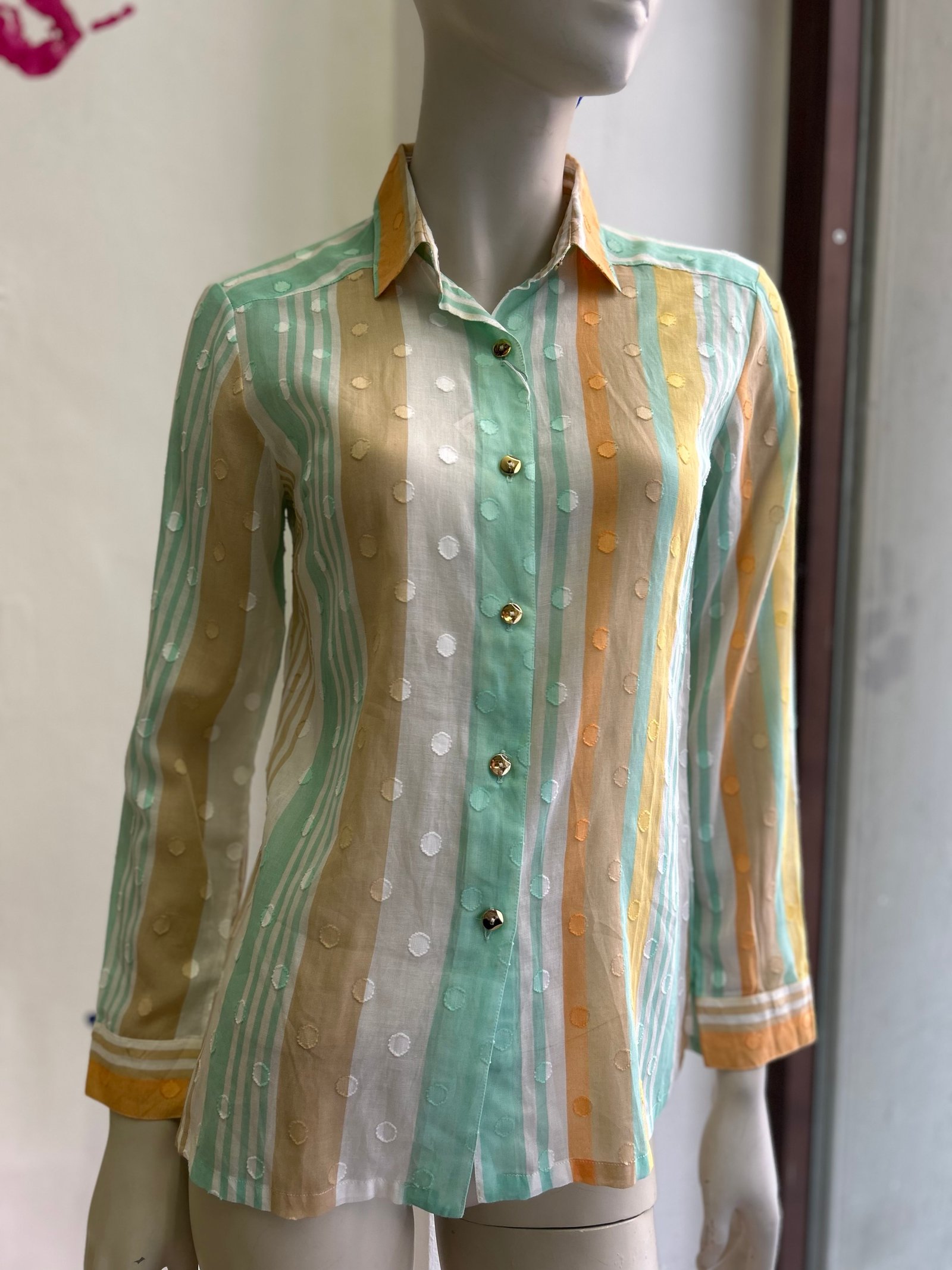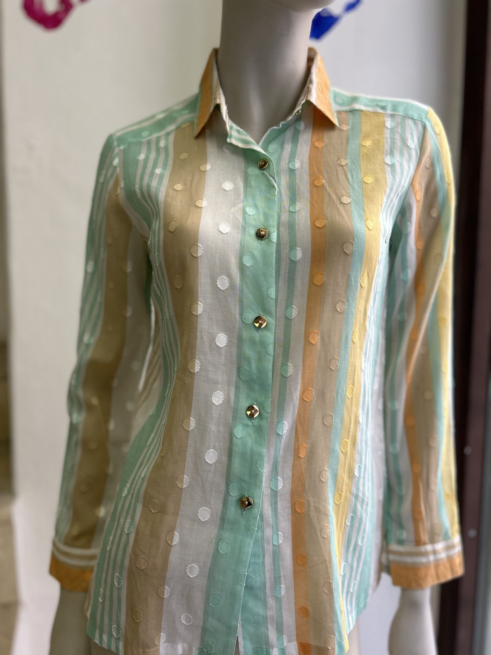 Ancora con cartellini originali, riporta taglia M, veste meno. Composizione 100% cotone, trasparente, in fantasia a righe verticali turchese gialla bianca e arancione, con pois a rilievo.