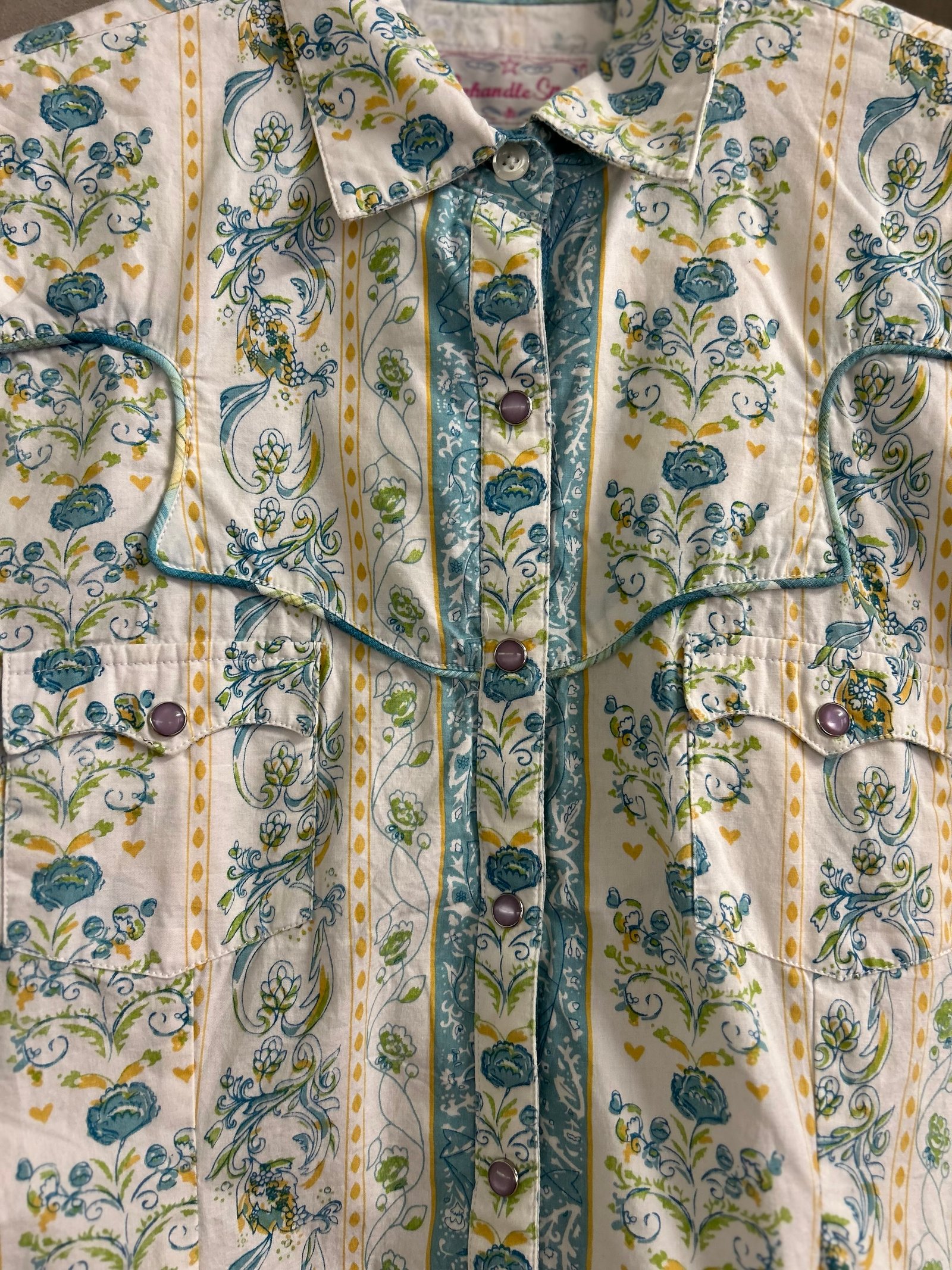 in pieno stile texano, camicia avvitata con mezza manica appena pronunciata, bottoni automatici e taschini sul petto, con ricamo a rilievo