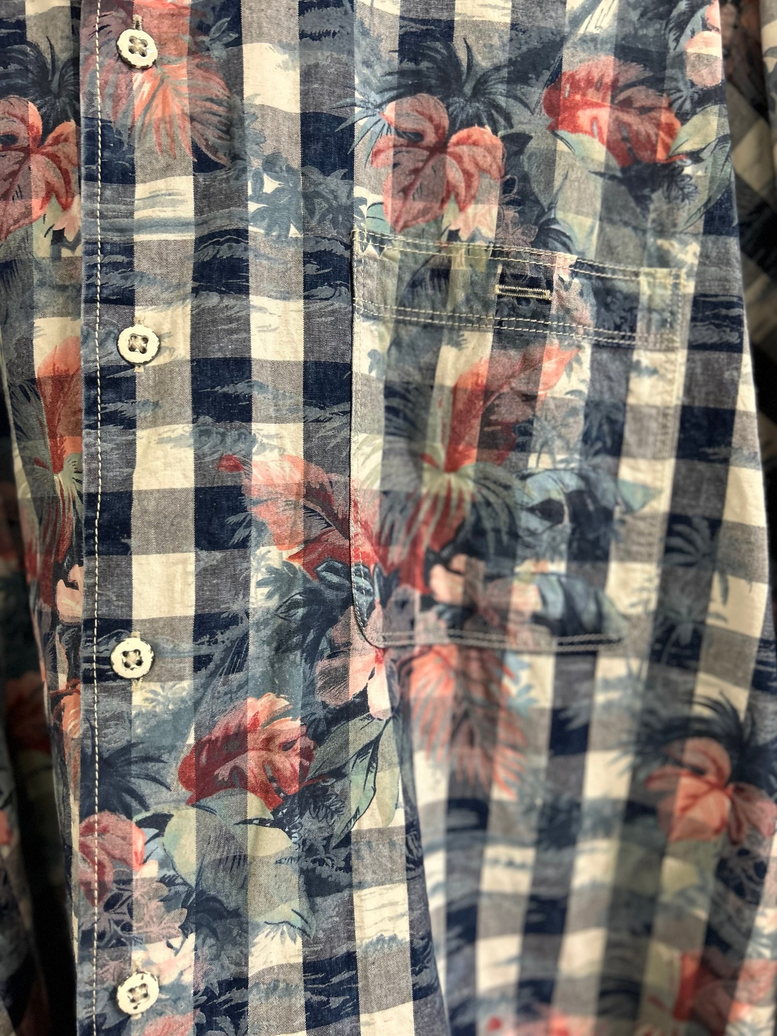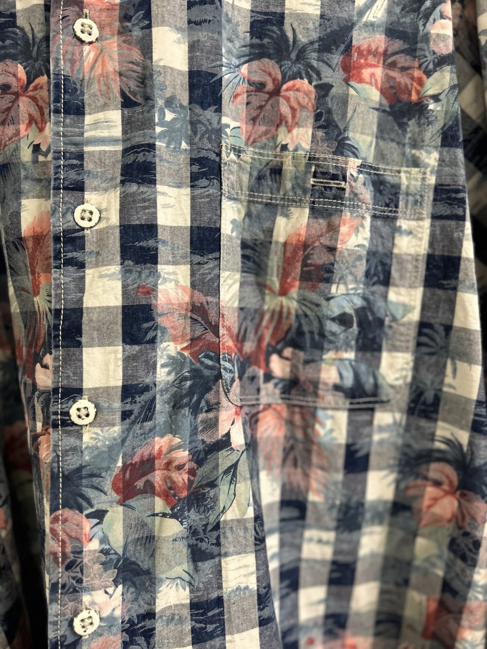 Modello classico con taschino sul petto in fantasia floreale su fondo a quadretti bianchi e blu