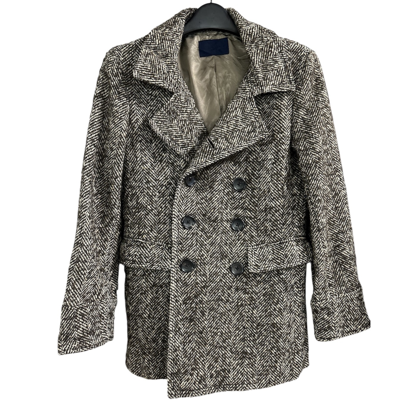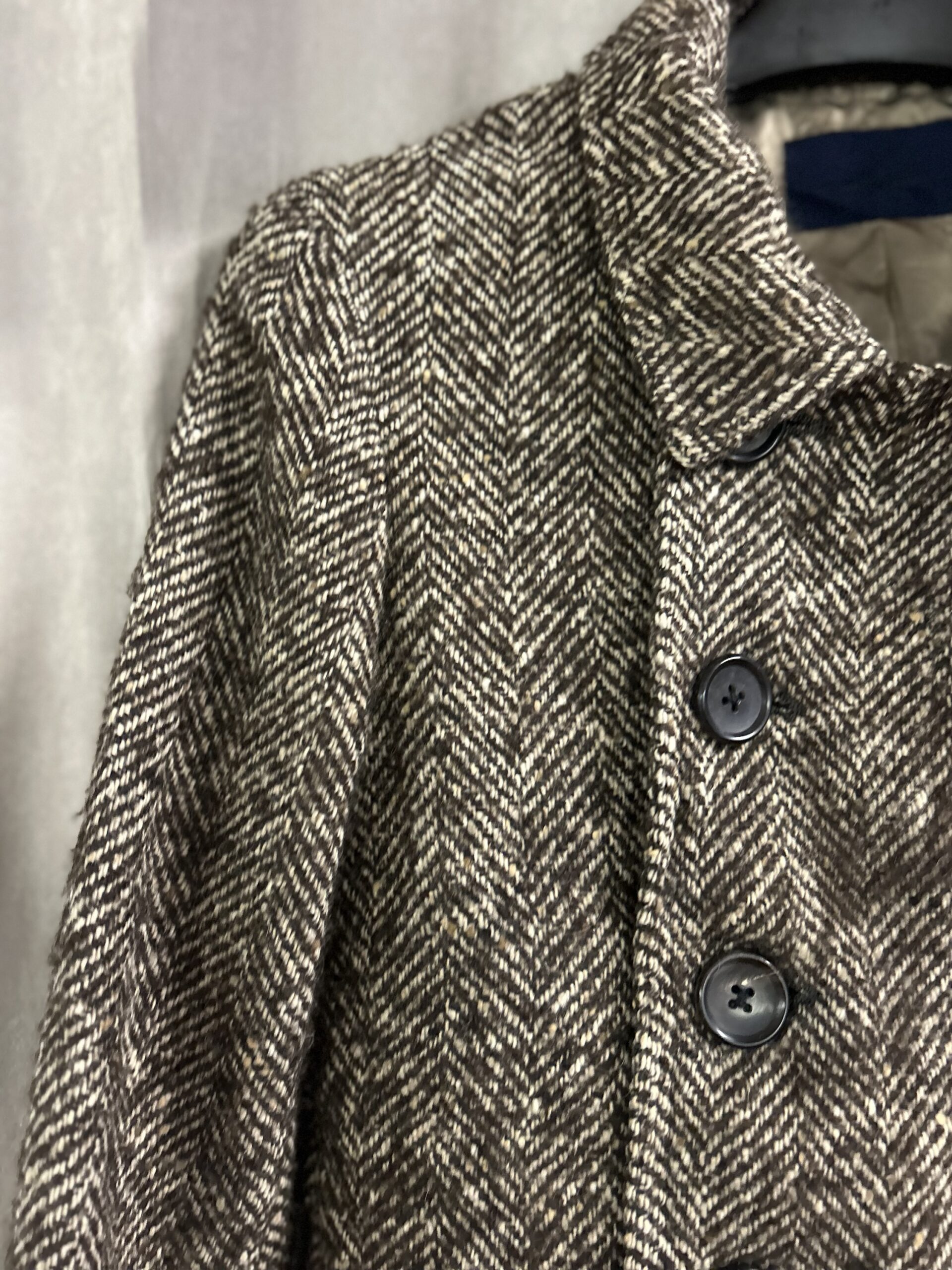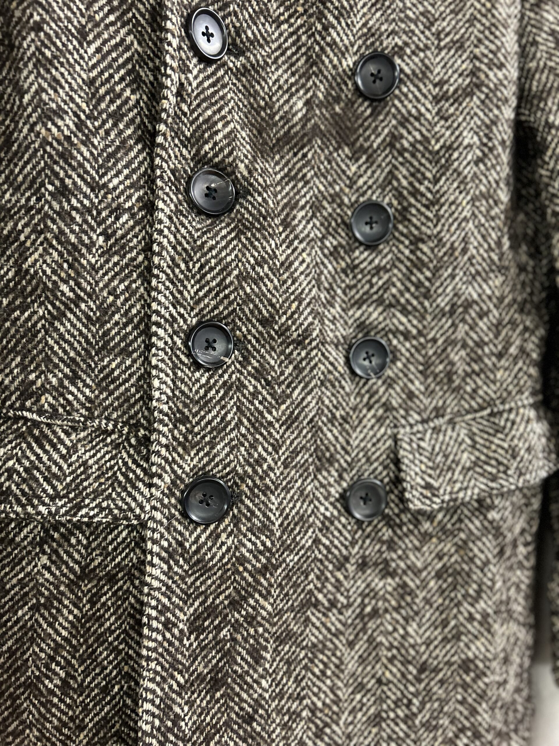 Modello doppiopetto, ma bello portato anche con revers aperti, con tasche con patta, in fantasia spigata marrone e panna melangiato