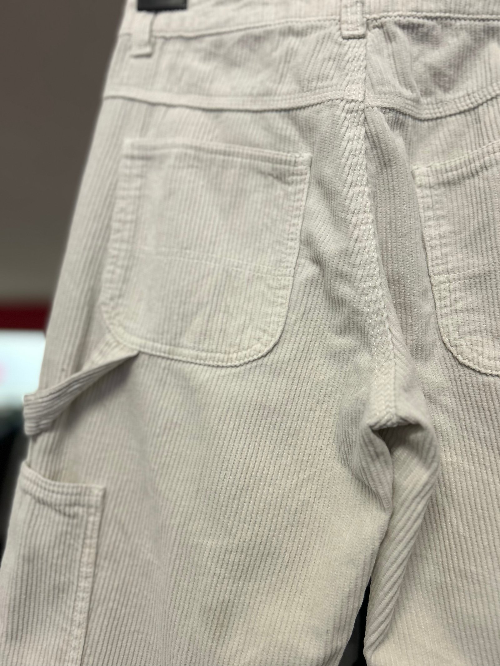 Davanti con tasche a filetto, mentre dietro ha le classiche tasche a trapezio e la “maniglia” che prima serviva per portare il martello