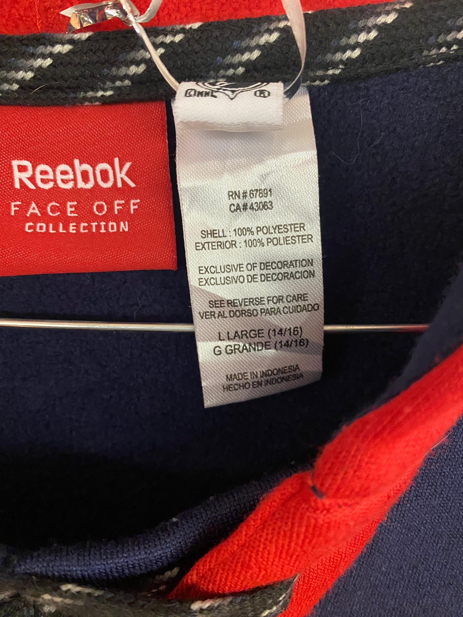Modello chiuso con cappuccio, lacci sullo scollo, in fantasia rossa e blu con ricamo davanti
