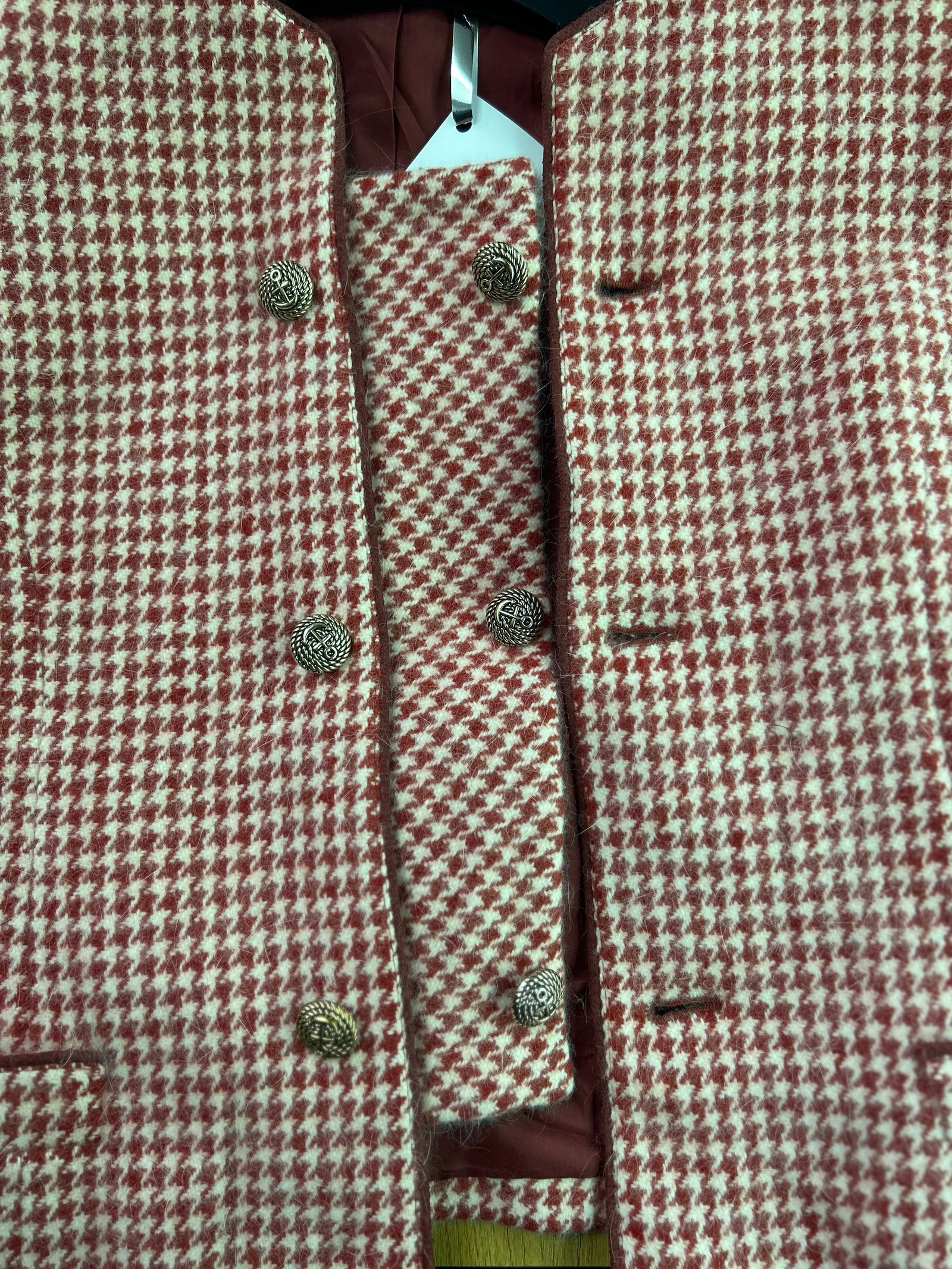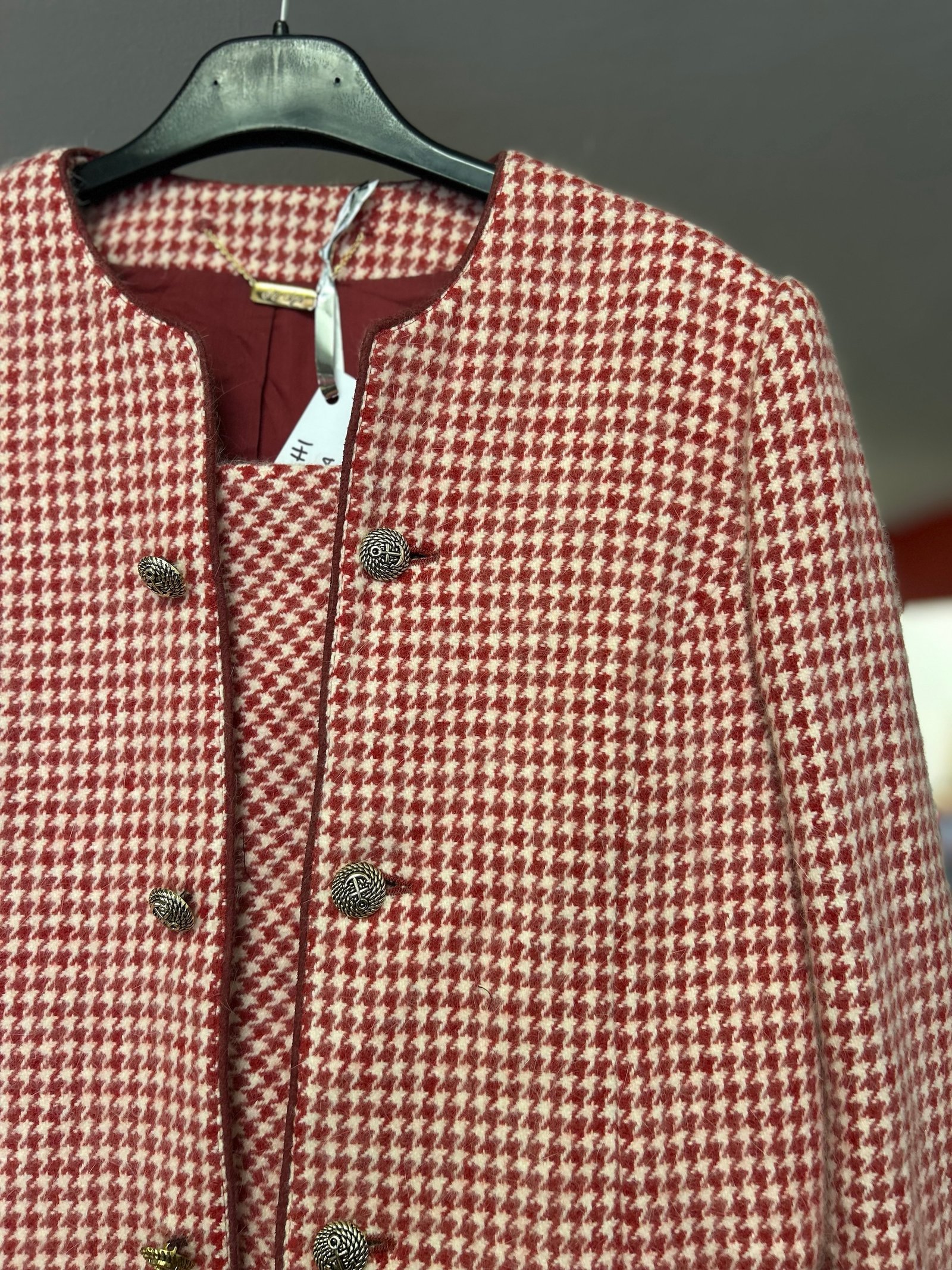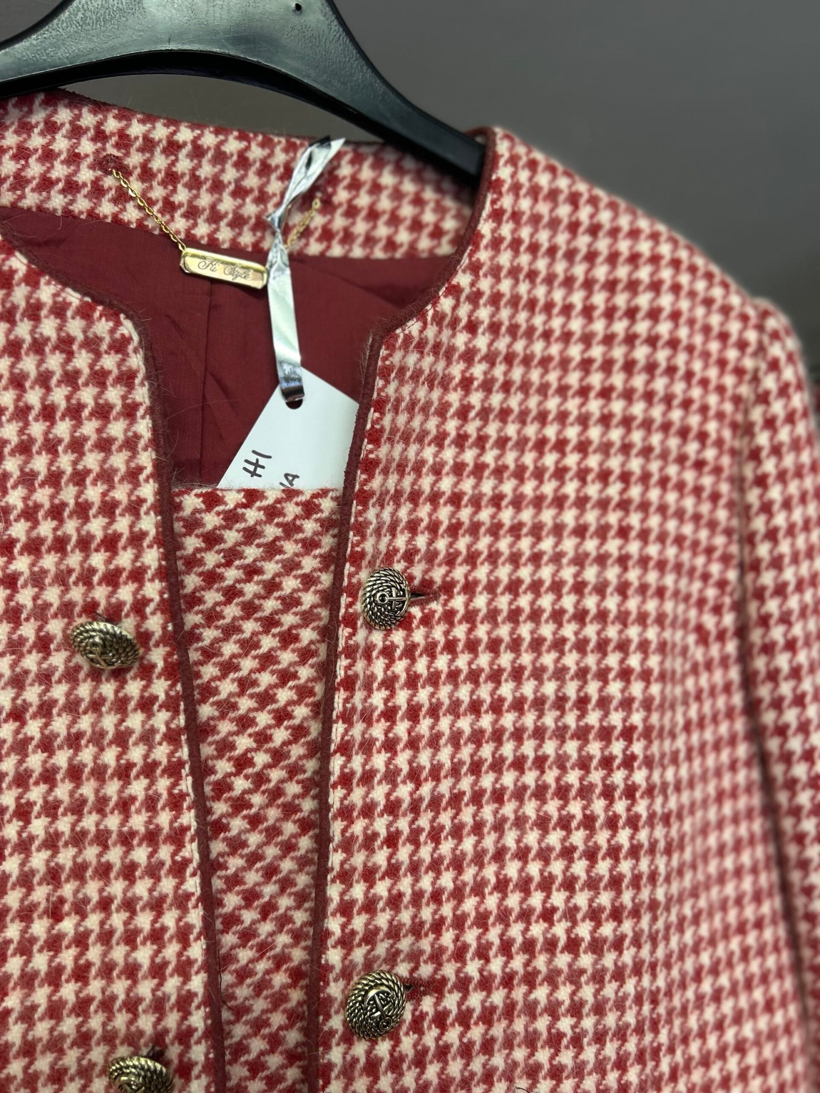 In fantasia pied de poule rossa e bianca, con taschine davanti