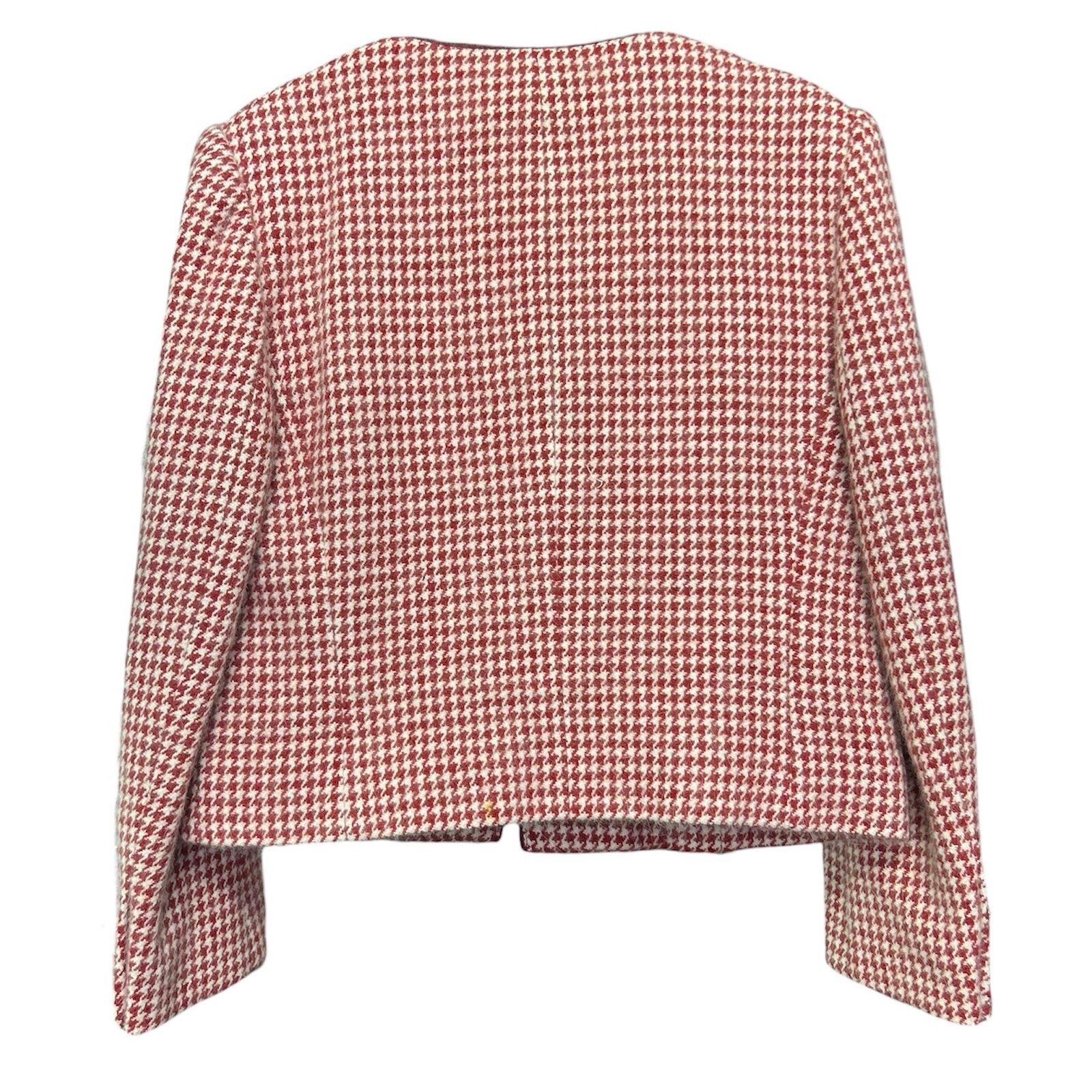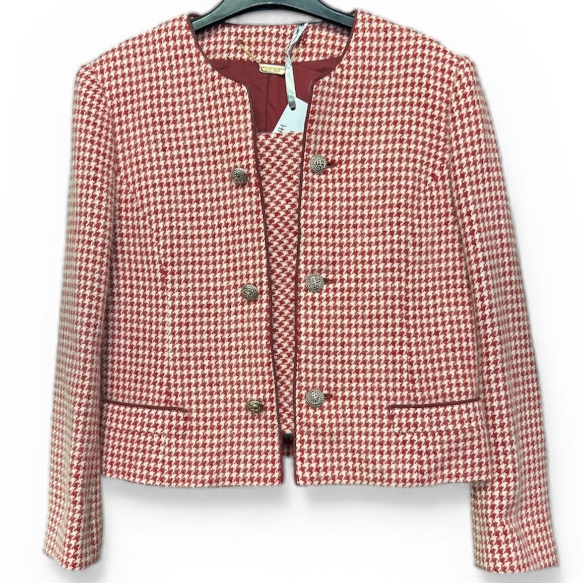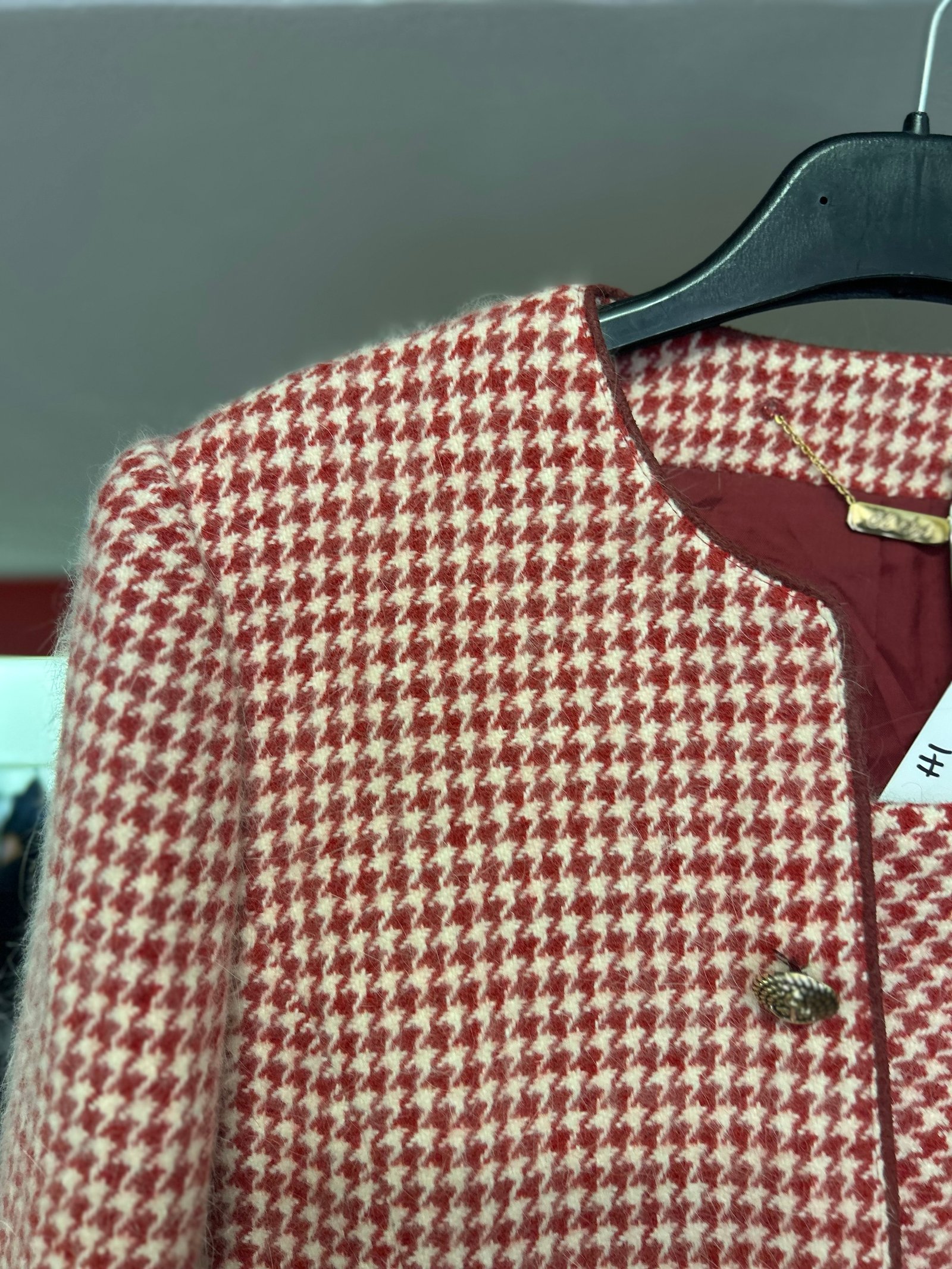 In fantasia pied de poule rossa e bianca, con taschine davanti