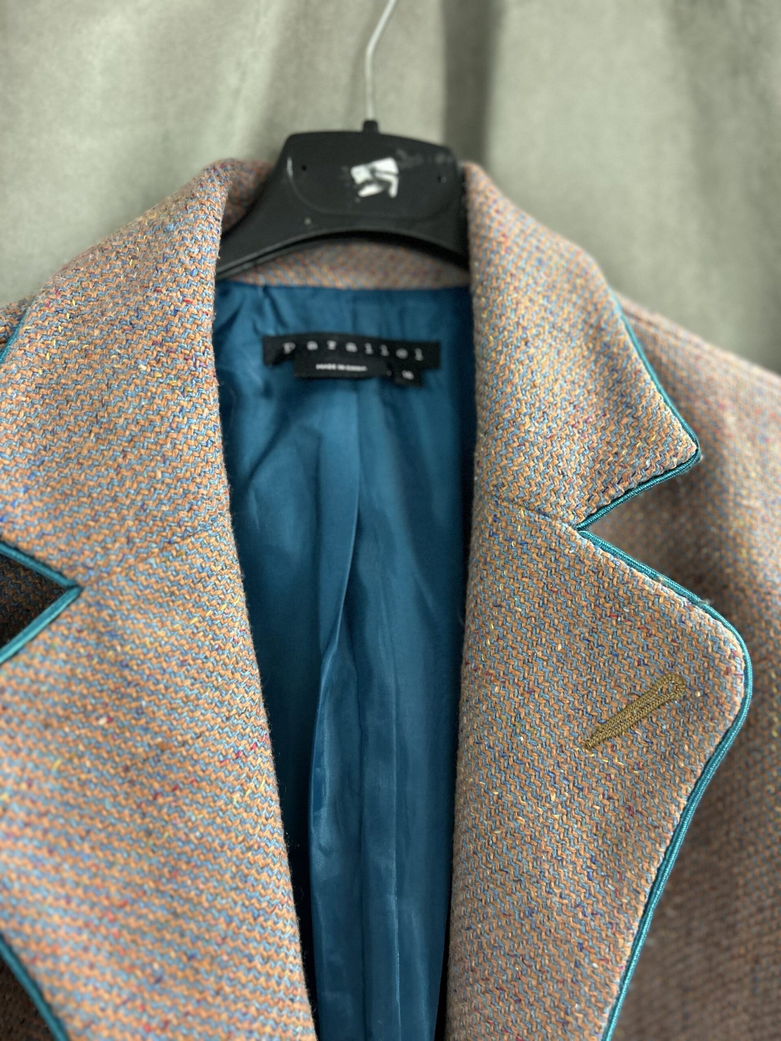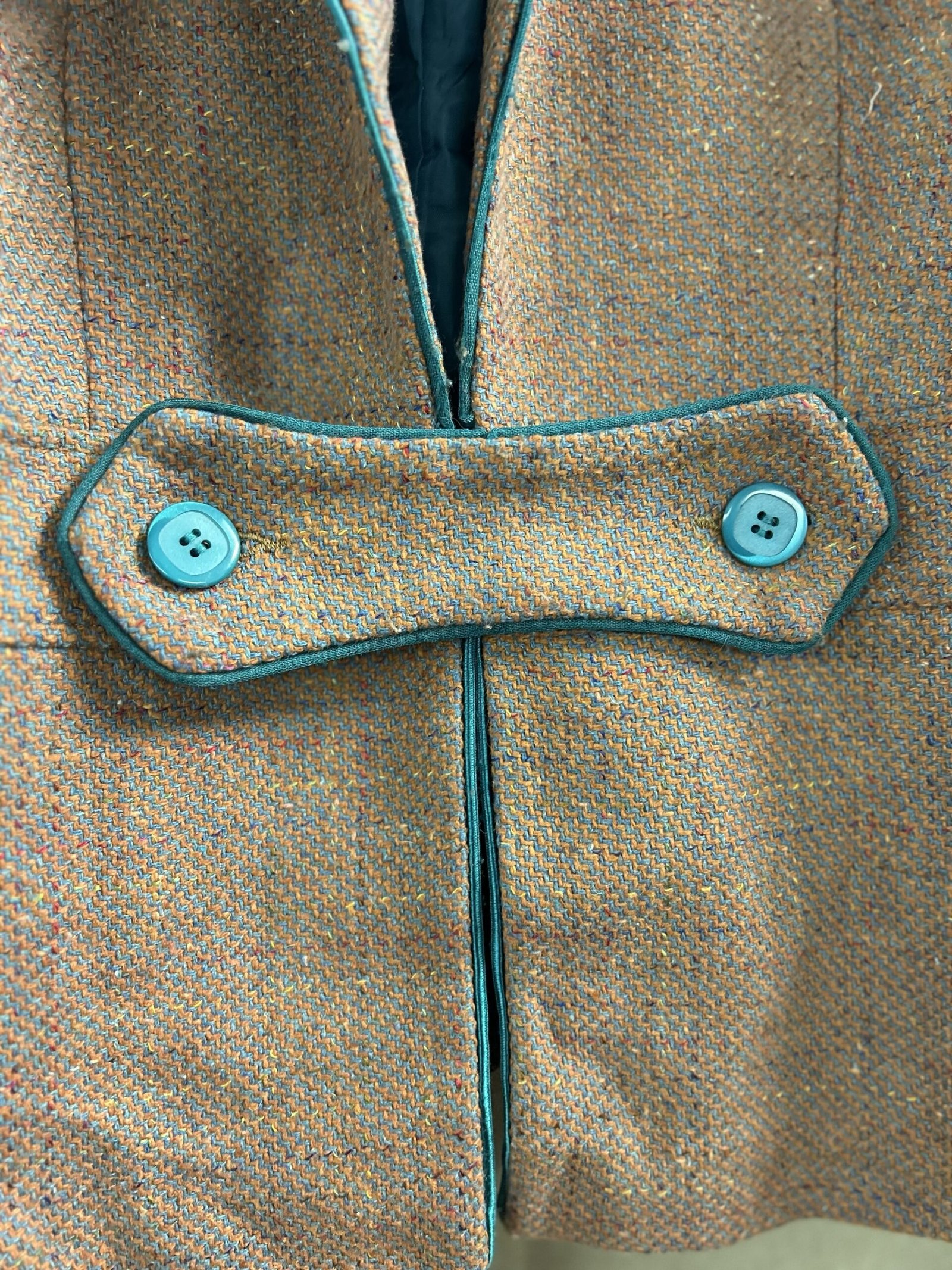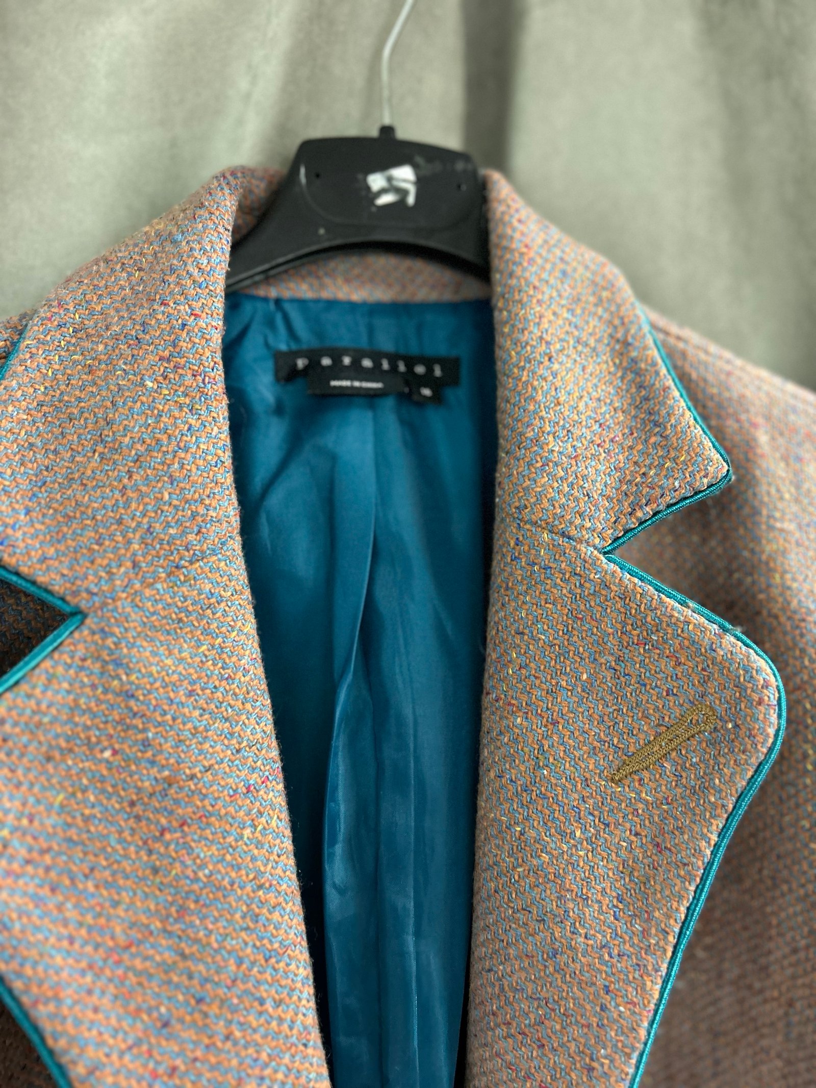 Modello di ispirazione anni ’50, con grandi revers e colletto, chiusura con ganci, coperti da patta che si può togliere e mettere tramite i bottoni turchesi che riprendono i bordi della giacca, con tasche