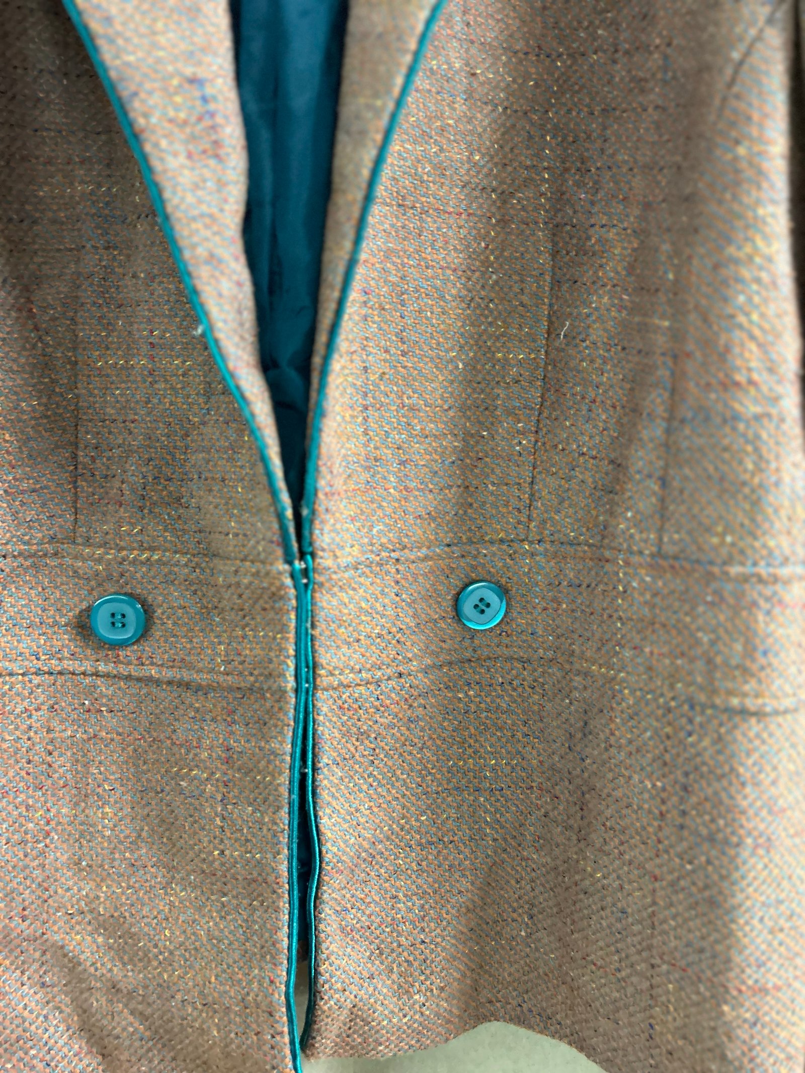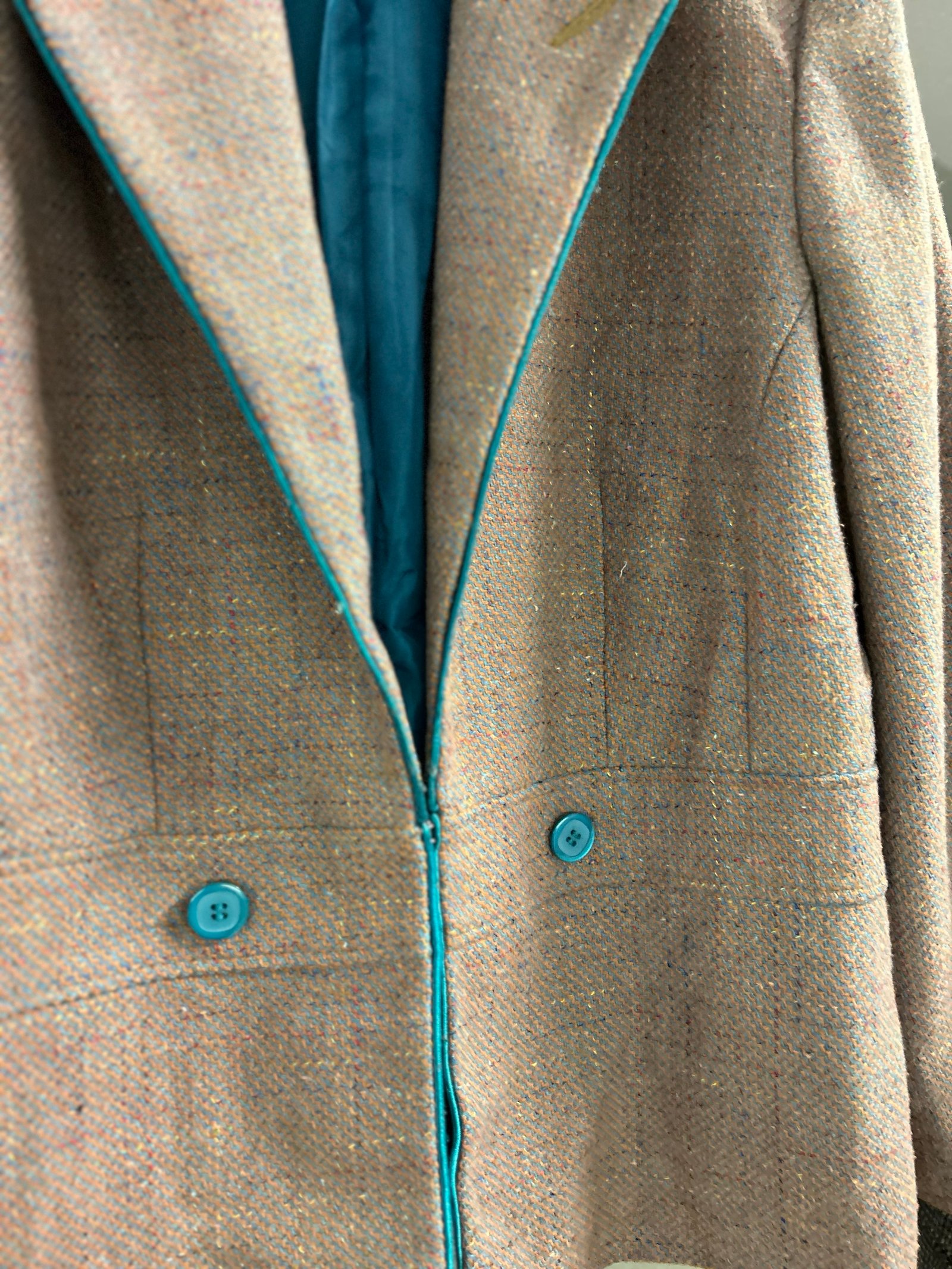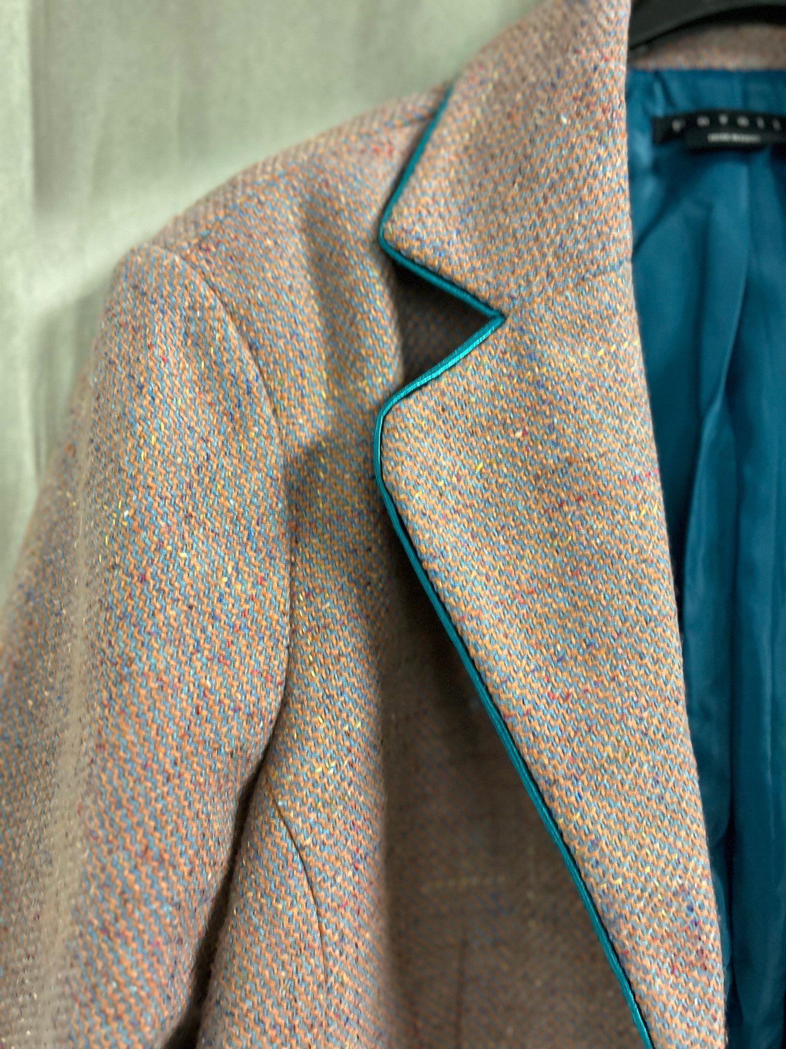 Modello di ispirazione anni ’50, con grandi revers e colletto, chiusura con ganci, coperti da patta che si può togliere e mettere tramite i bottoni turchesi che riprendono i bordi della giacca, con tasche