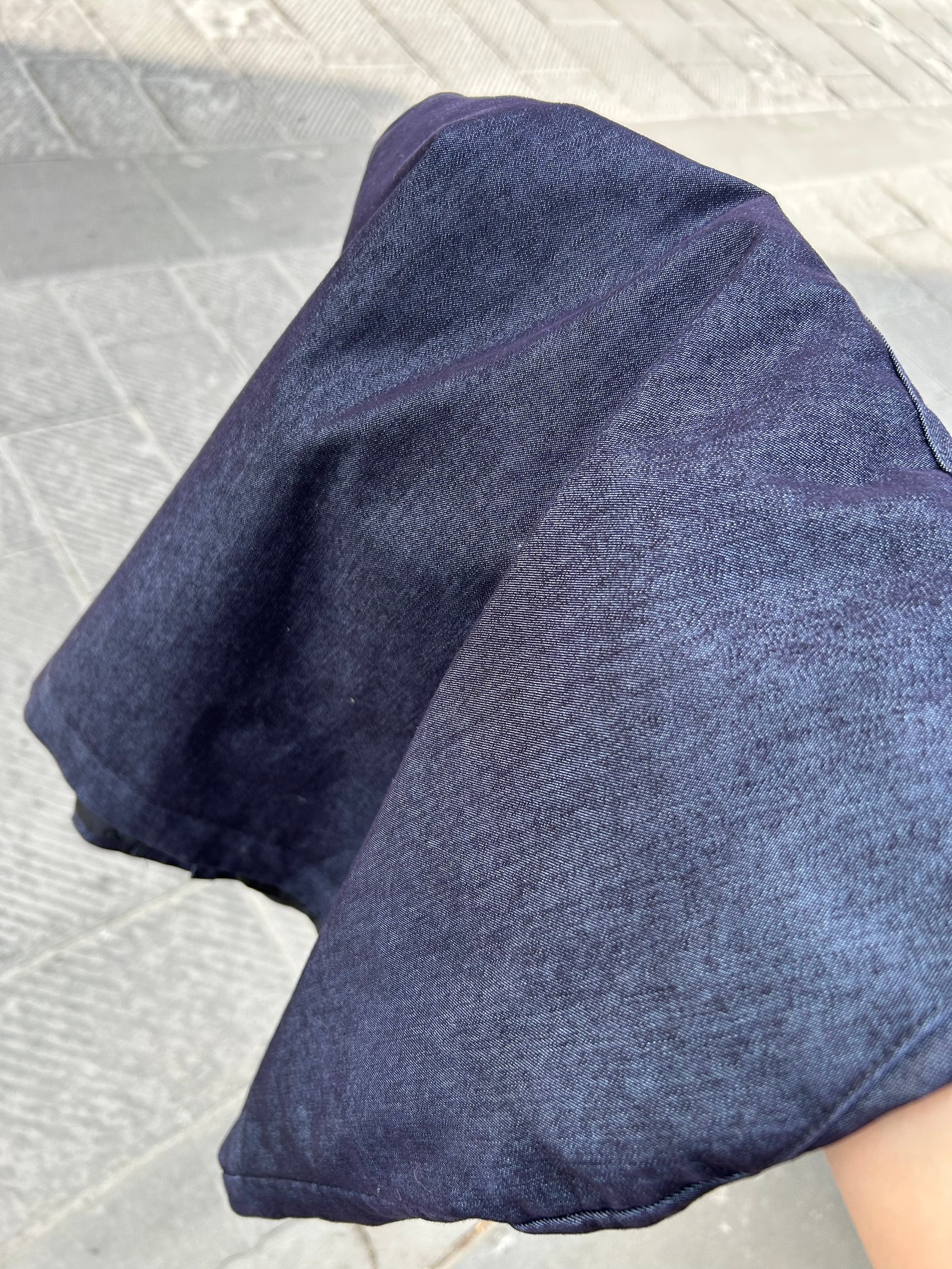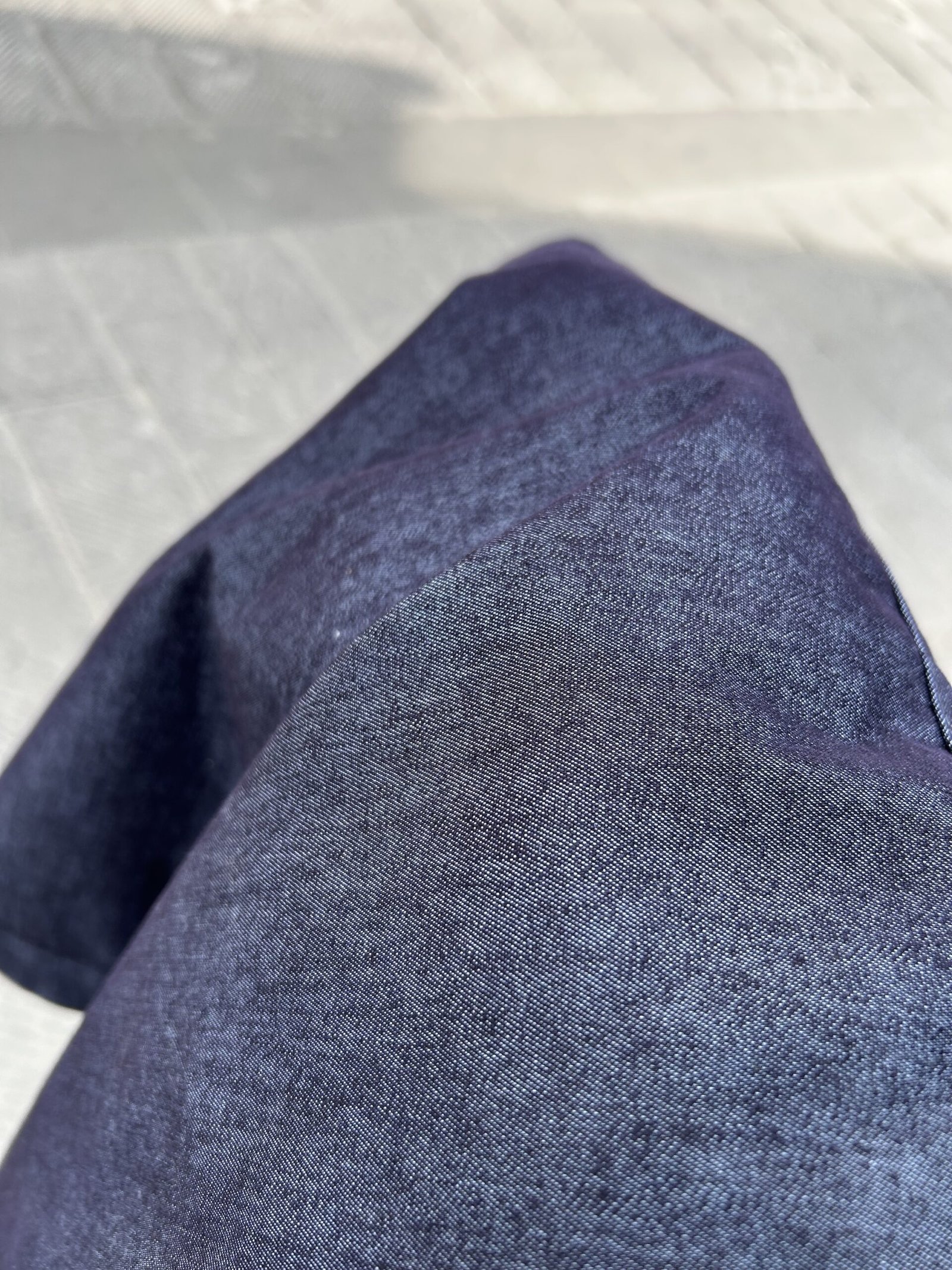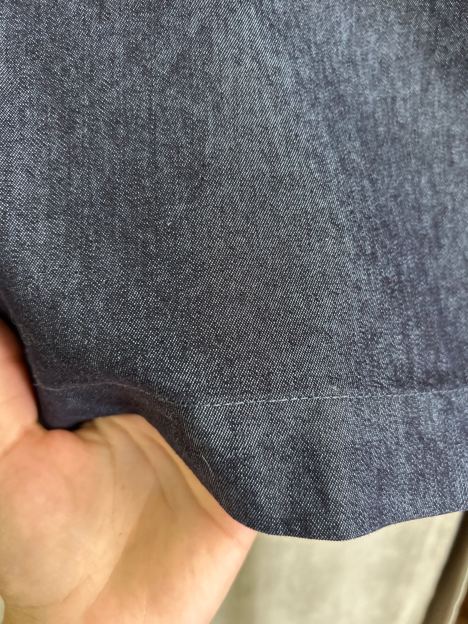 Modello dritto, di jeans scuro, con tessuto cangiante, leggermente tendente al viola con la luce, piccolo spacco dietro, tasche a filetto ancora cucite
