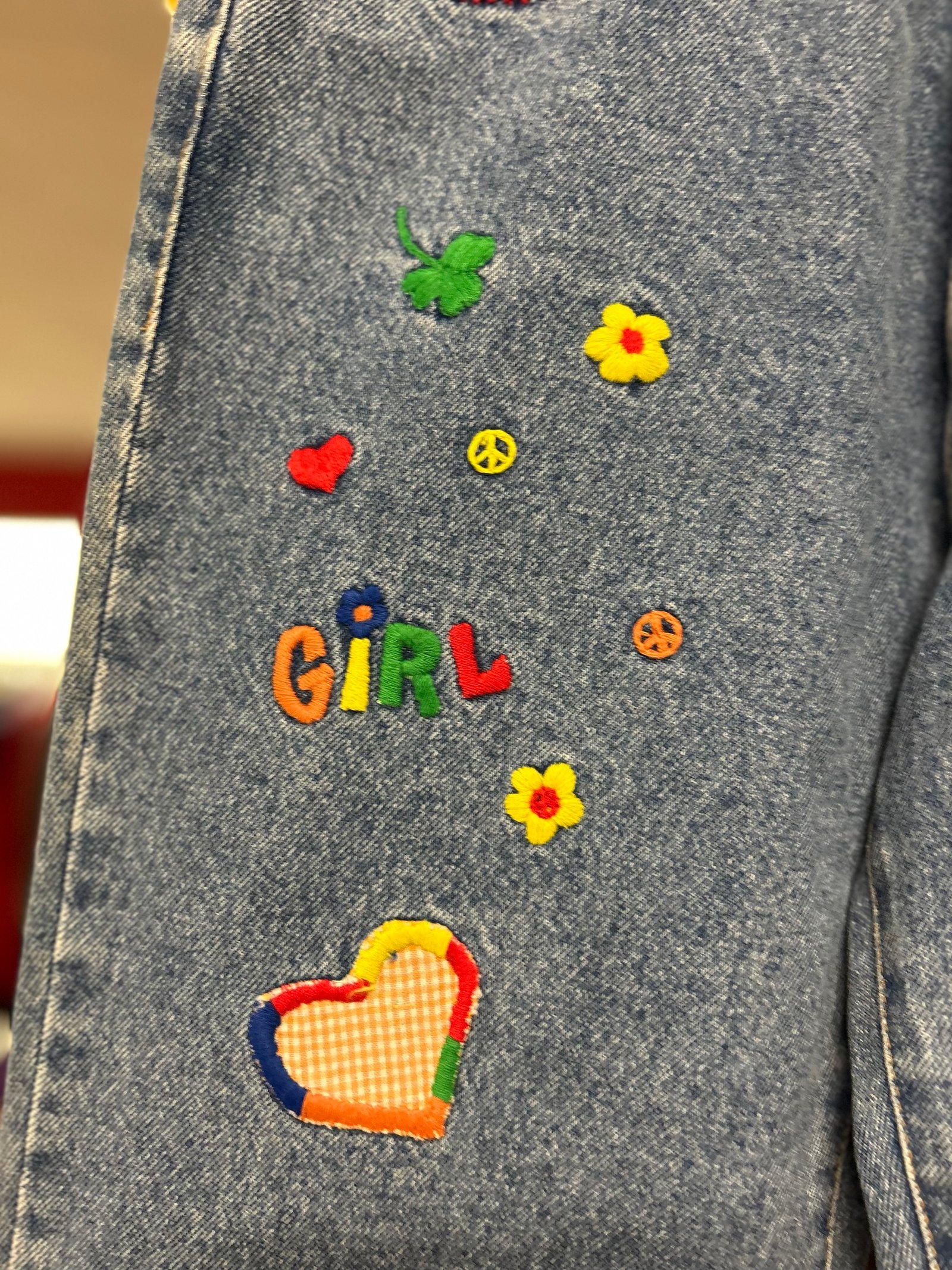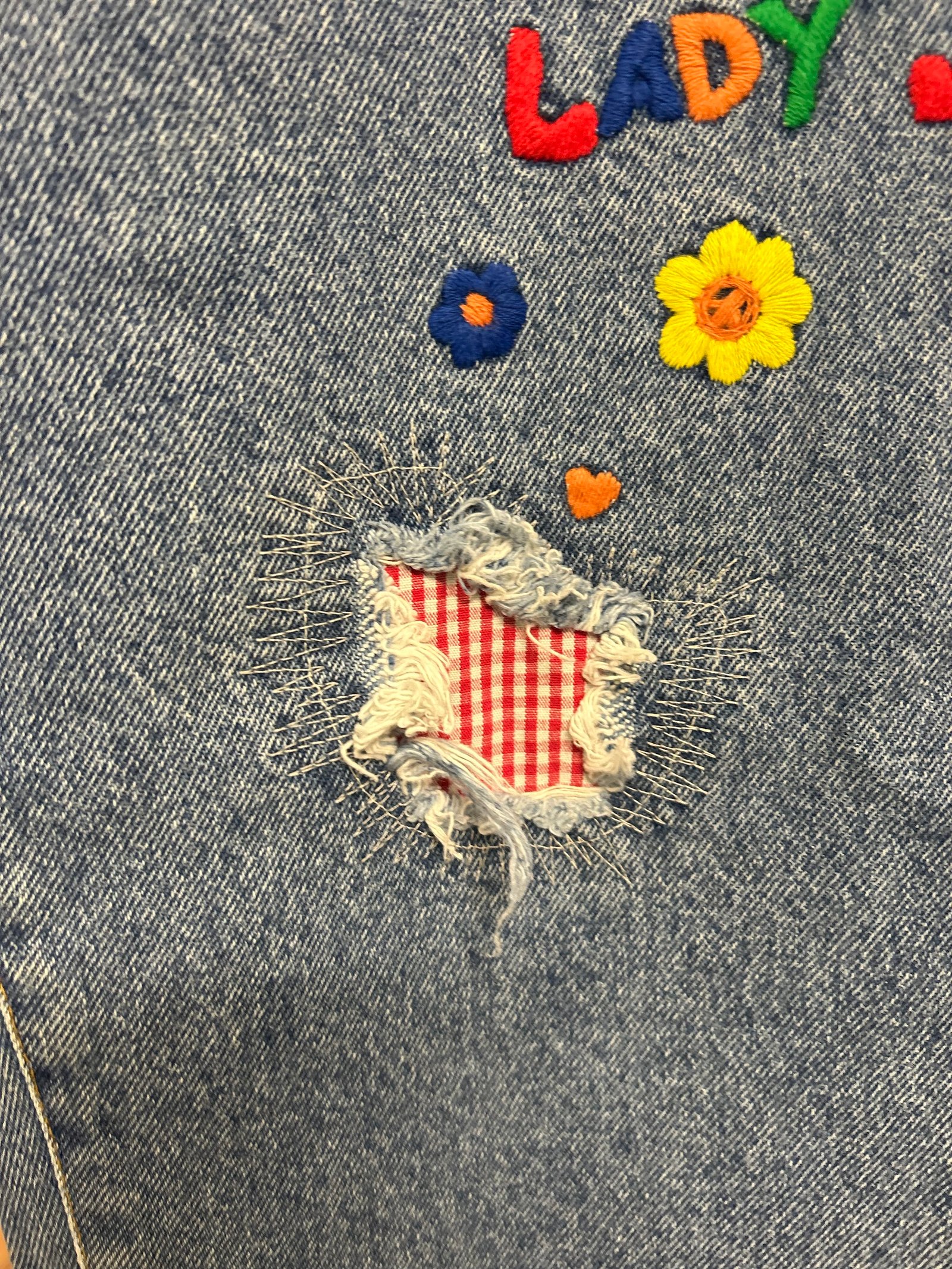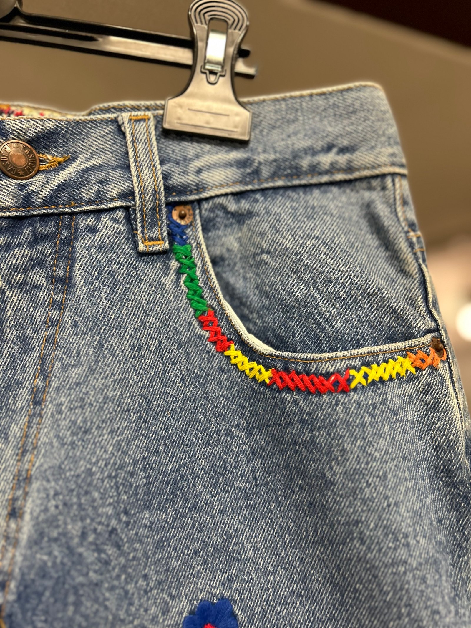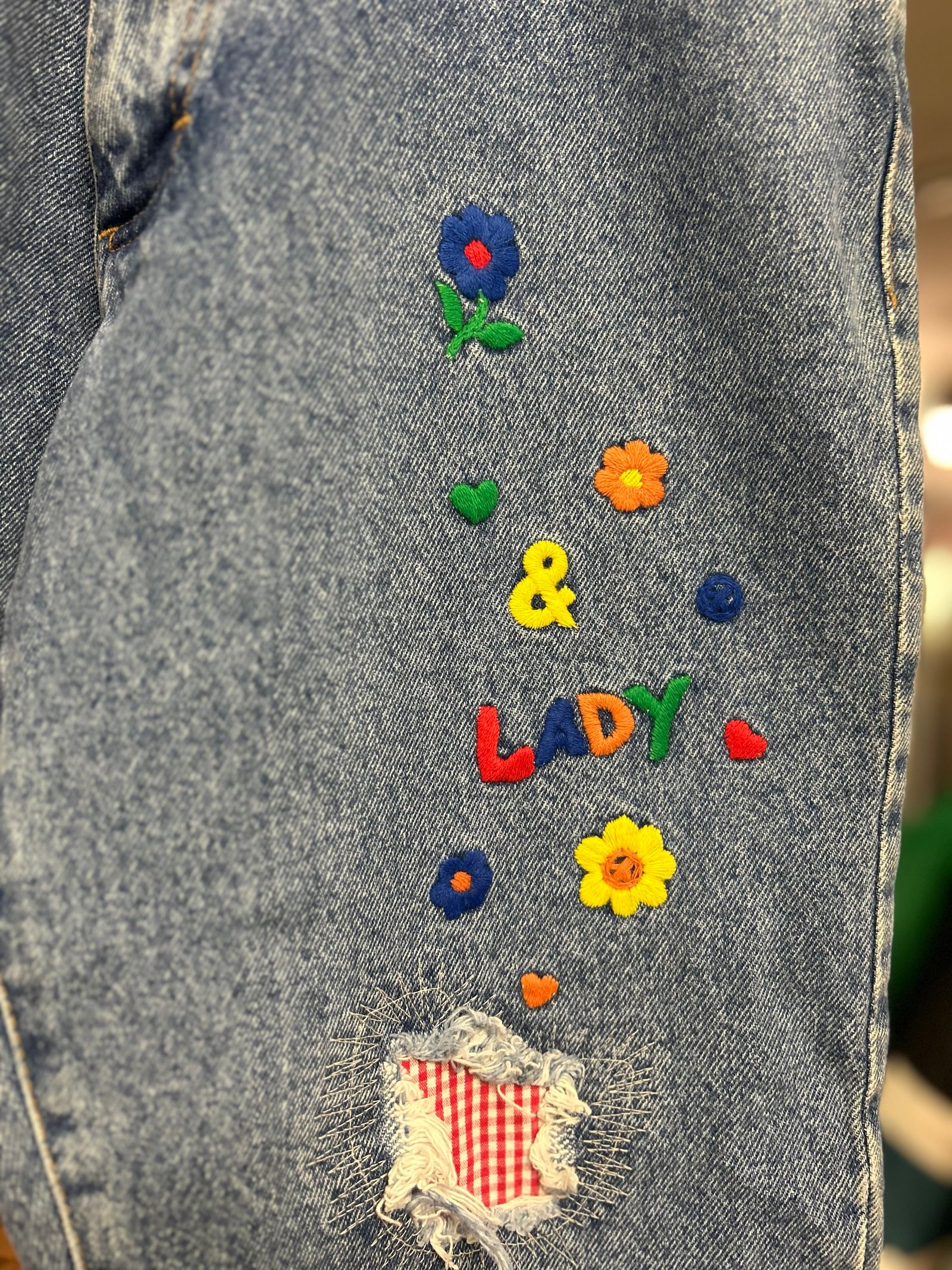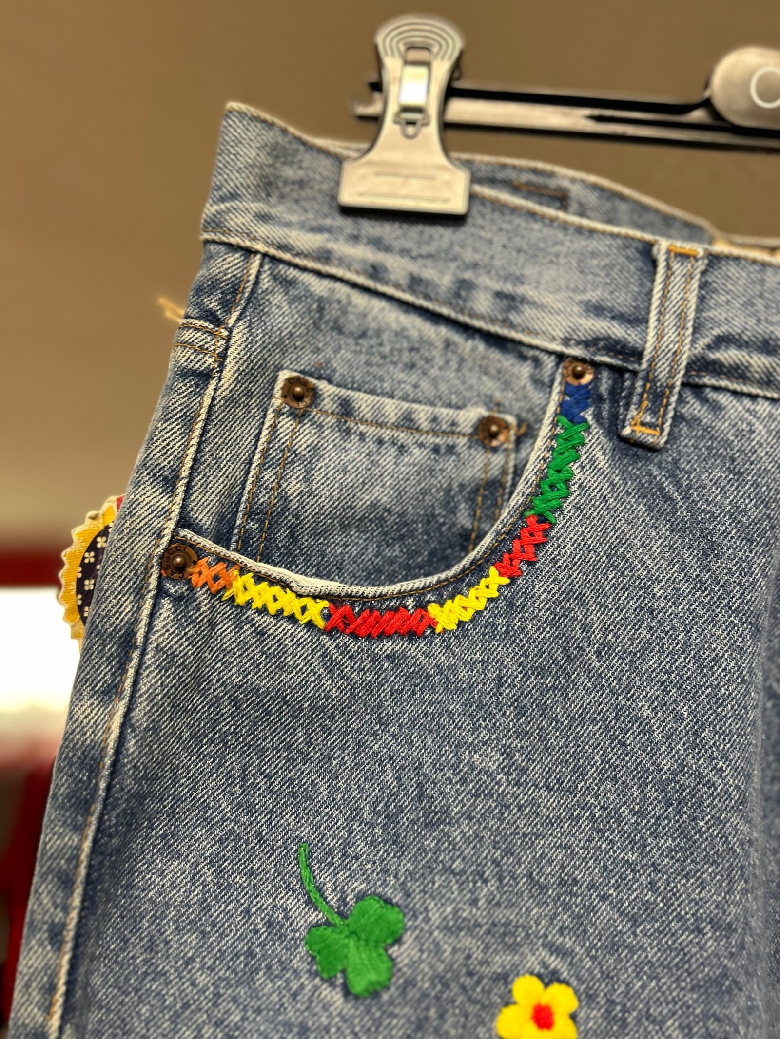 Modello a vita alta, con gamba un po’ a palloncino, lavaggio chiaro, con ricami colorati su tasche davanti e dietro e sulle cosce