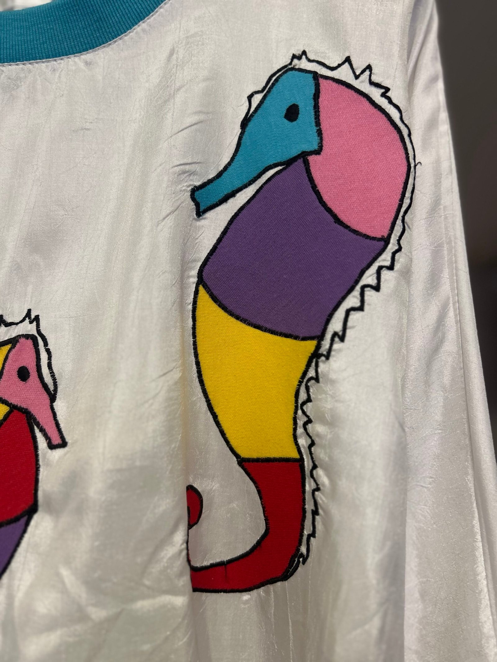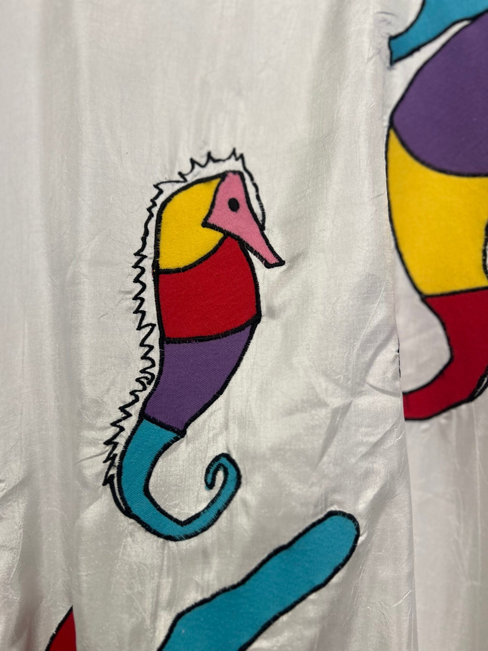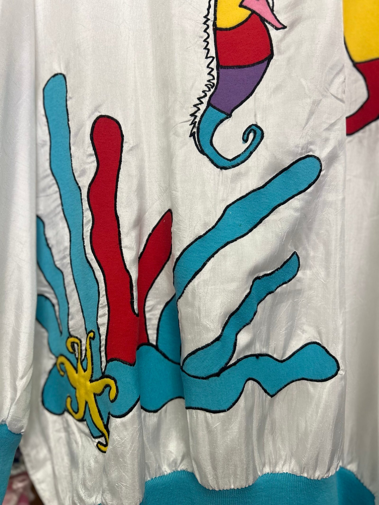 In fantasia marittima multicolor su fondo bianco, fasce elastiche azzurre sui polsini e in vita
