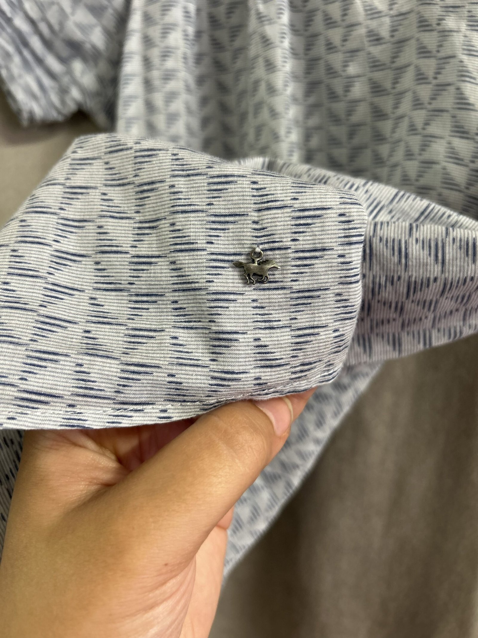 Modello collo morbido filzato con elastico, si può portare anche a barca, leggermente scocciata, in fantasia celeste e blu, con ciondolino con cavallo cucito in fondo