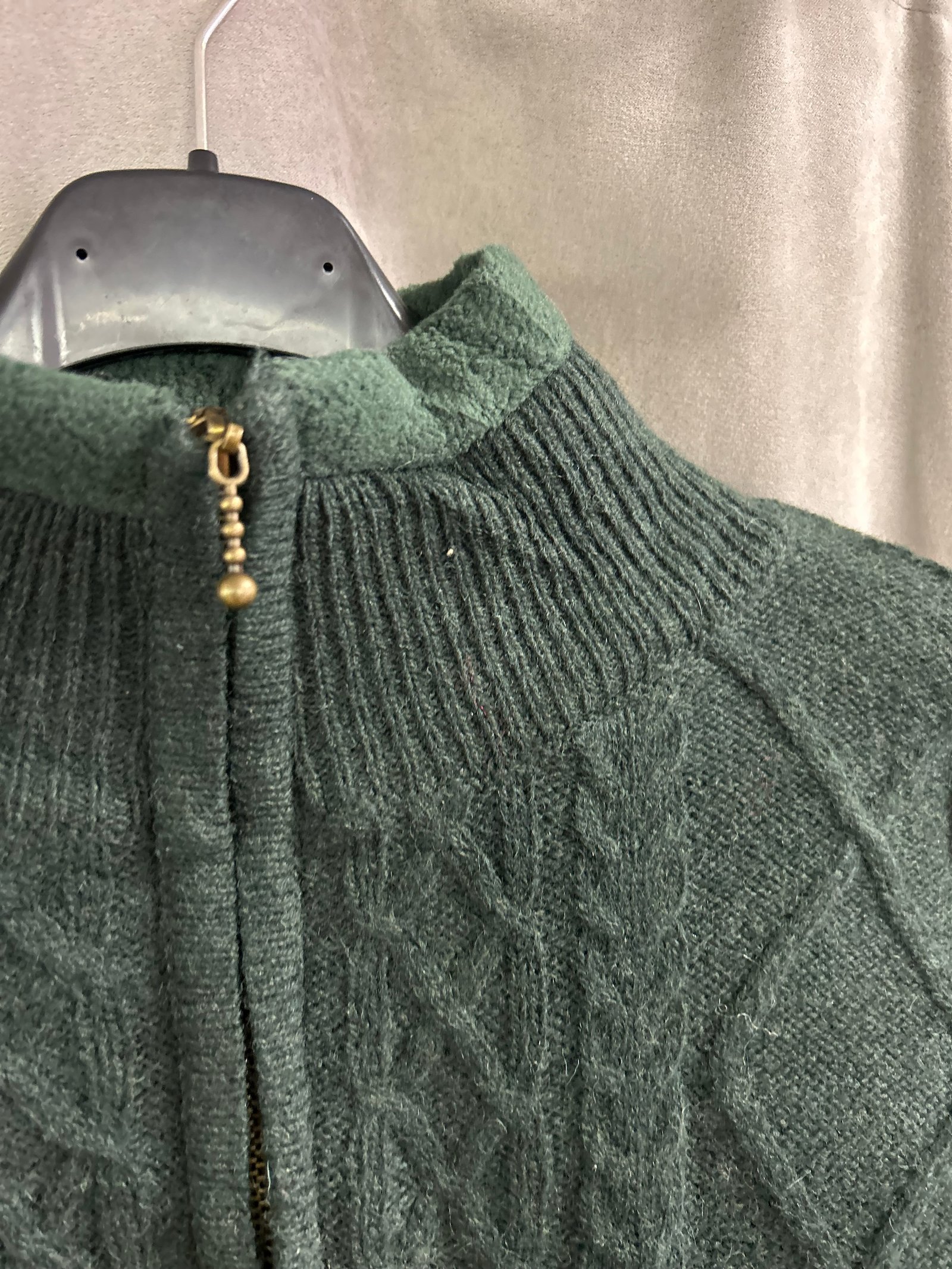 Modello cardigan, aperto con zip, in tinta unita verde bosco, con tasche, colletto con bordo in pile, internamente foderato così non pizzica anche se indossato con t-shirt