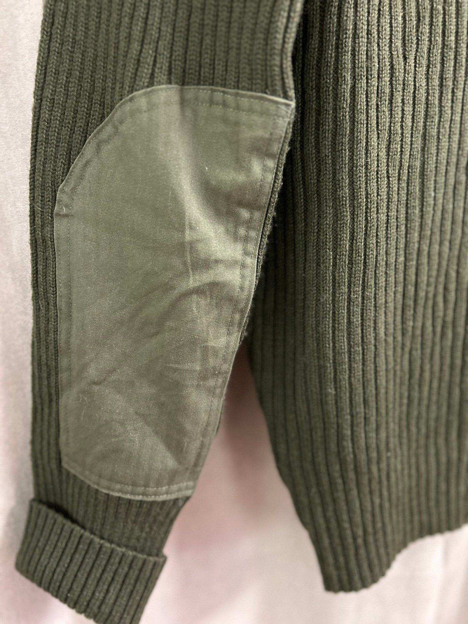 Riporta taglia 44, veste taglia L circa, in 100% pura lana vergine con toppe rinforzate su spalle e gomiti in poliestere e cotone per una maggiore resistenza e longevità