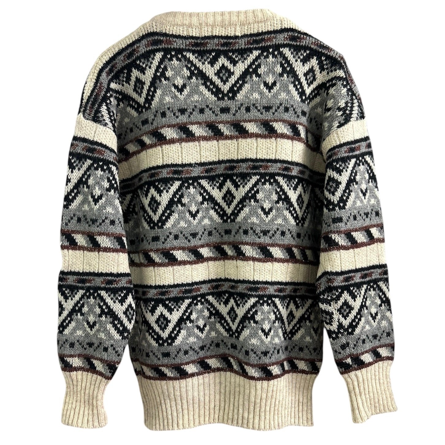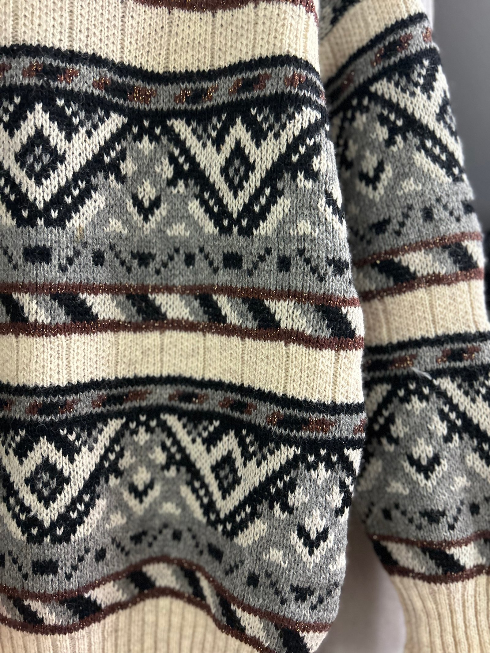 Modello girocollo, in fantasia grigia e nera, con filo lurex bronzo, alternato a fasce panna