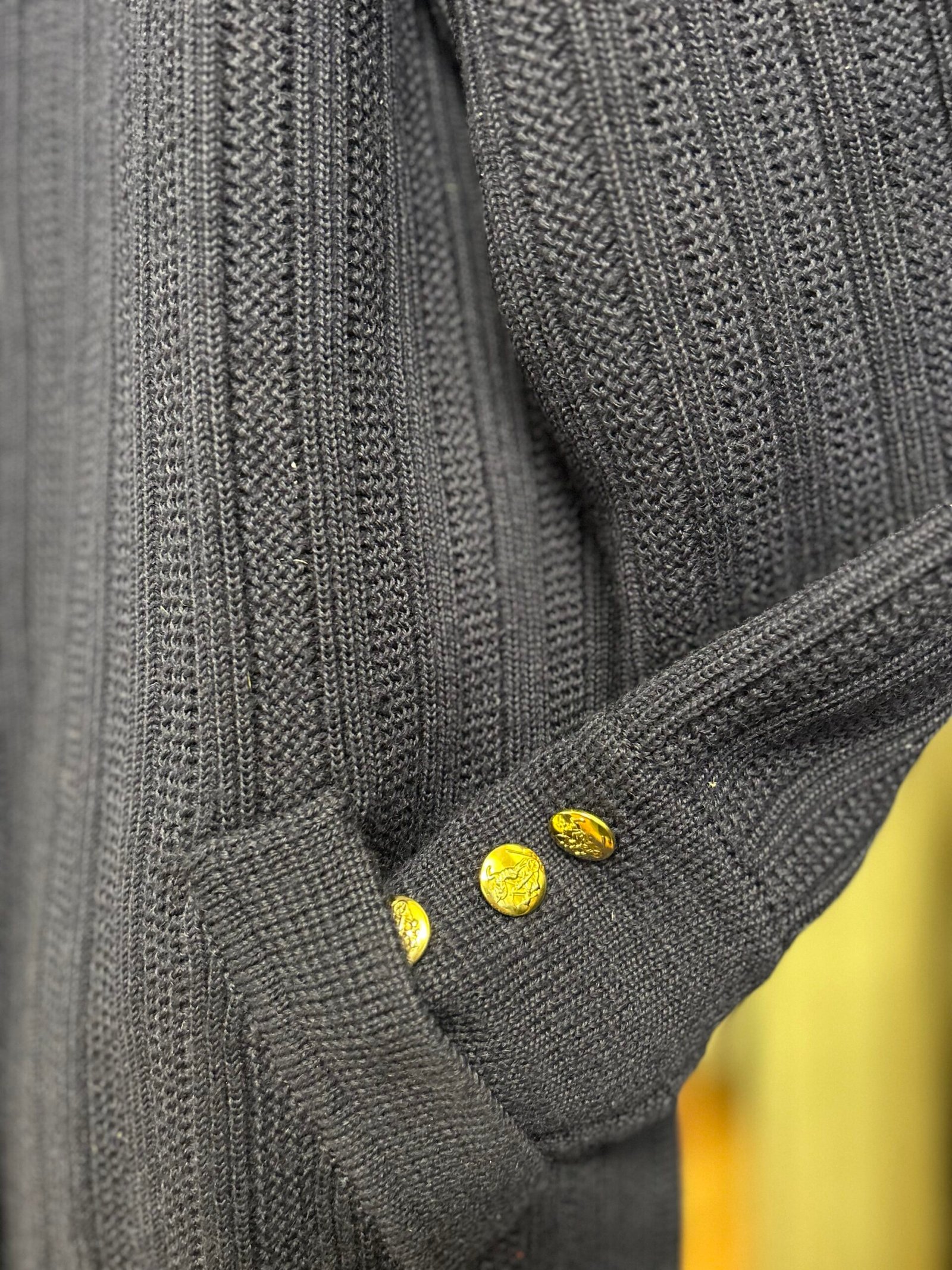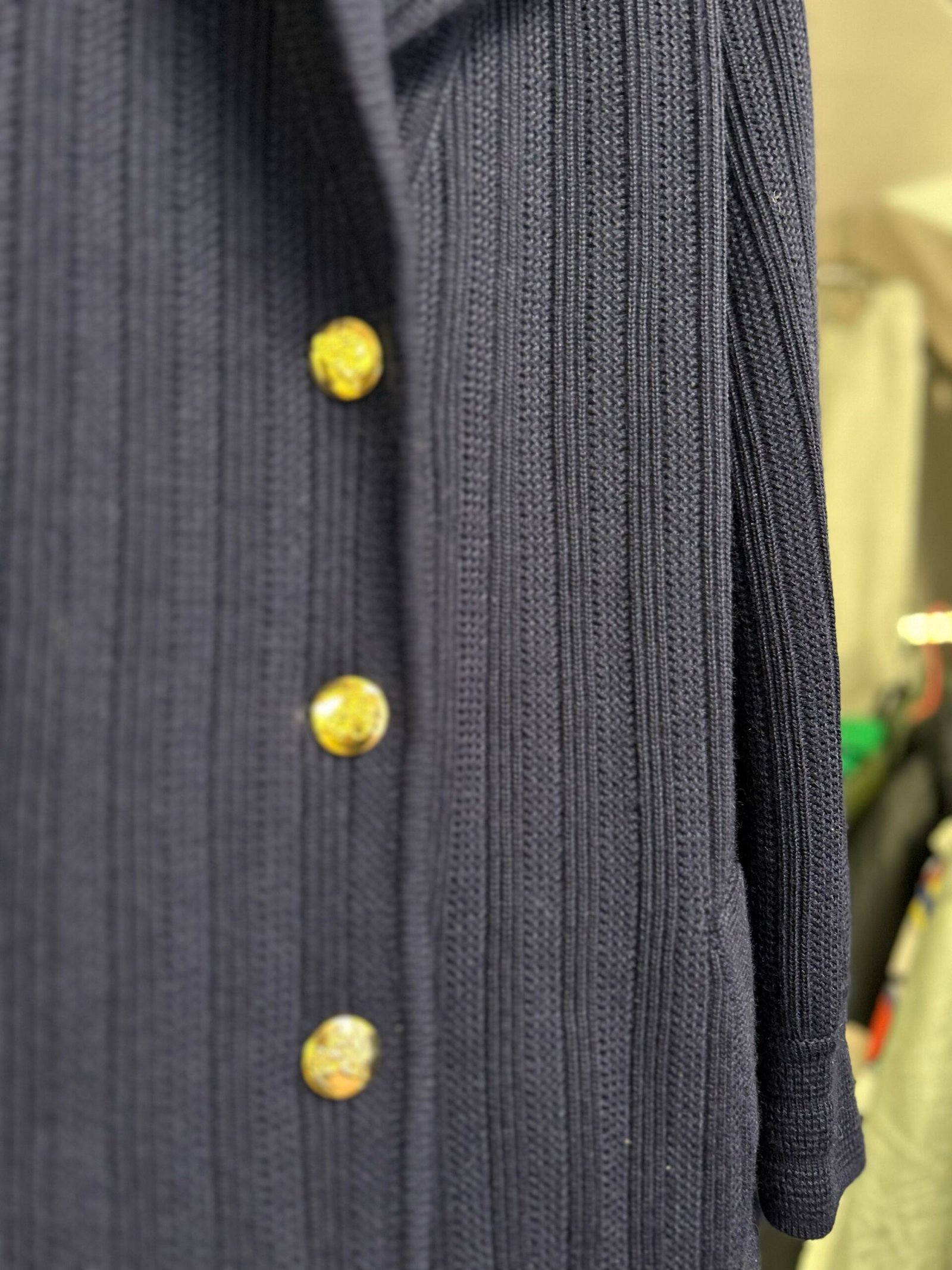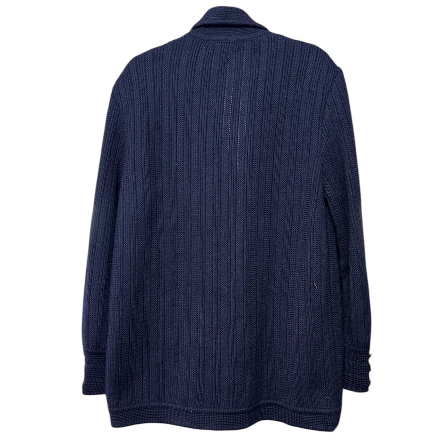 Modello cardigan, con bellissima lavorazione a maglia, scollo con revers, bottoni gioiello dorati e tasche, in tinta unita blu