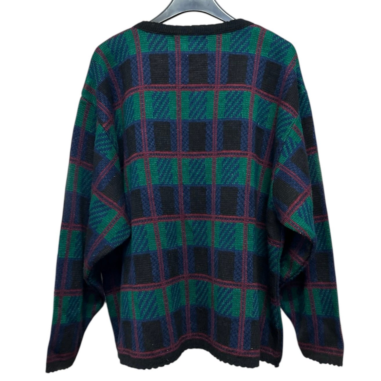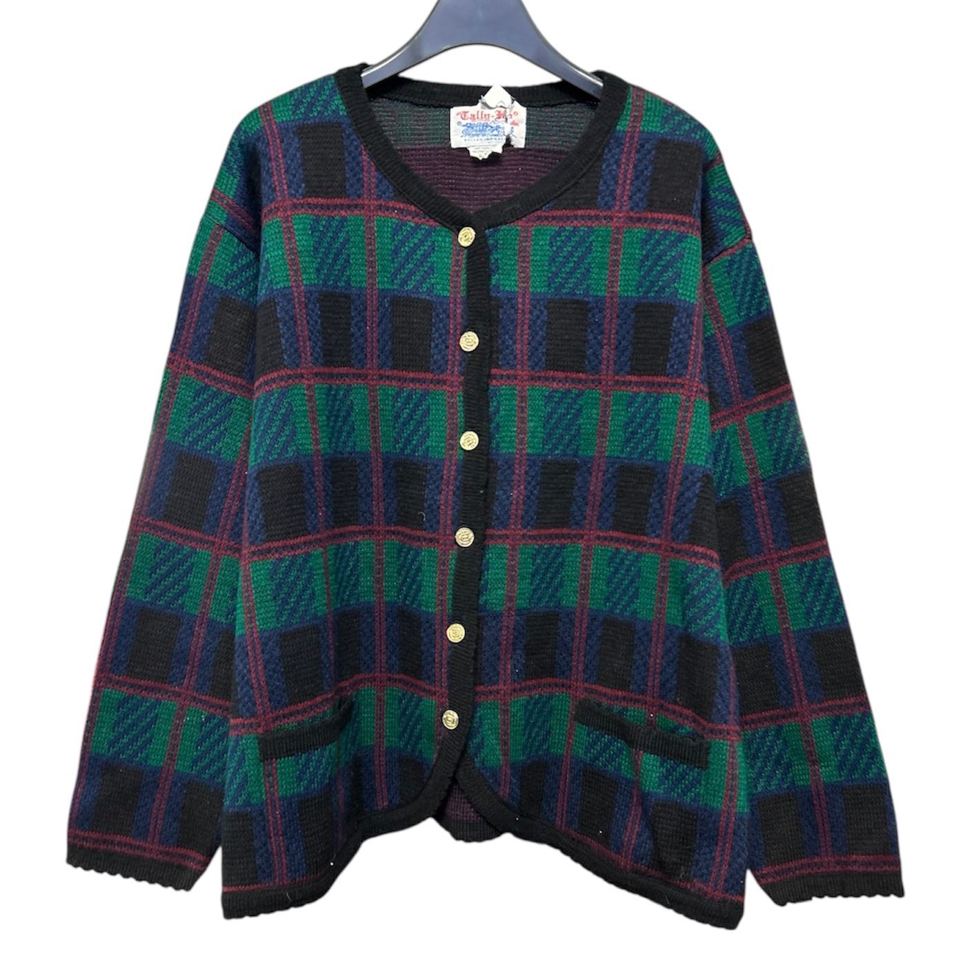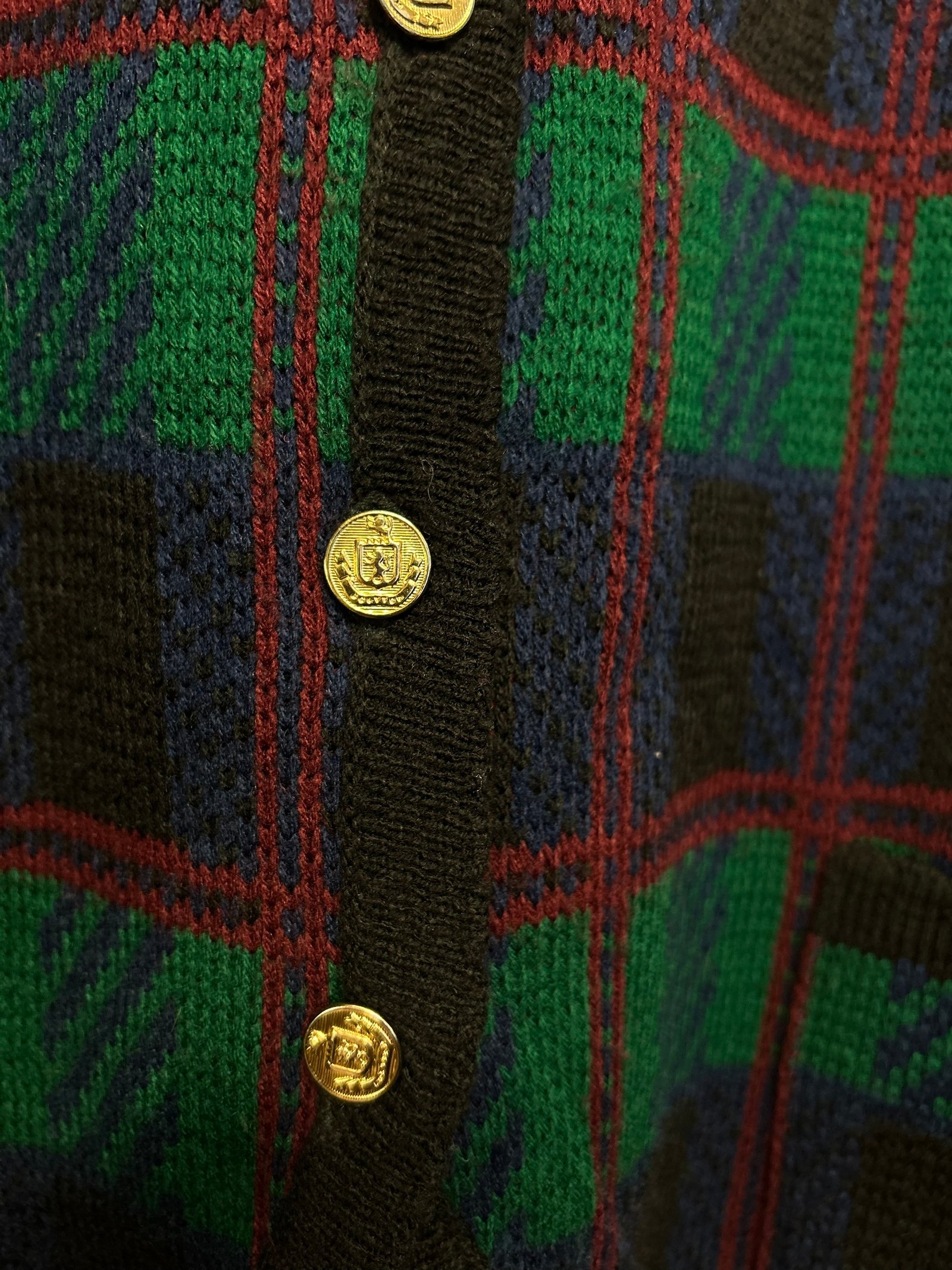 Modello cardigan, taglia XL circa, 100% acry, con bottoni gioiello dorati, in fantasia tartan sui toni del blu, verde e bordeaux, con orlo finale stondato