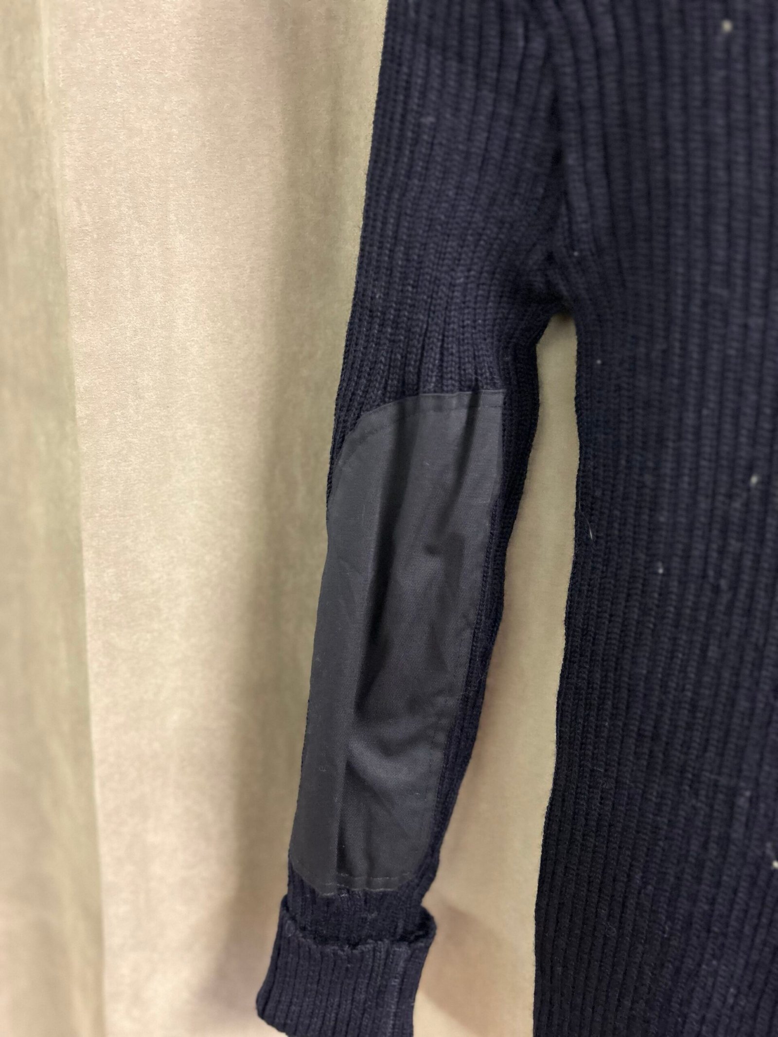 Riporta taglia 40-42 M, veste meno, in 100% pura lana vergine con toppe rinforzate su spalle e gomiti in poliestere e cotone per una maggiore resistenza e longevità