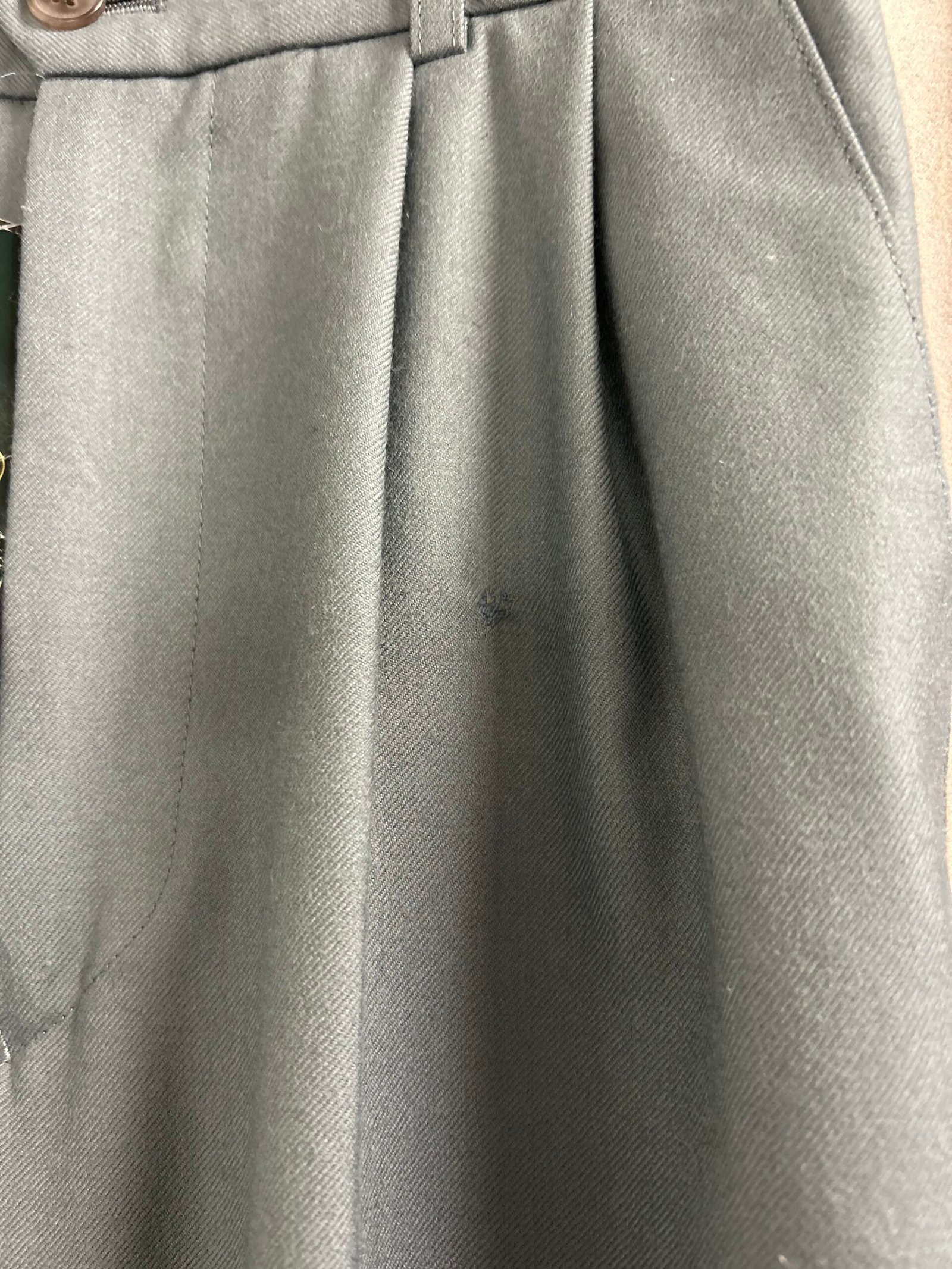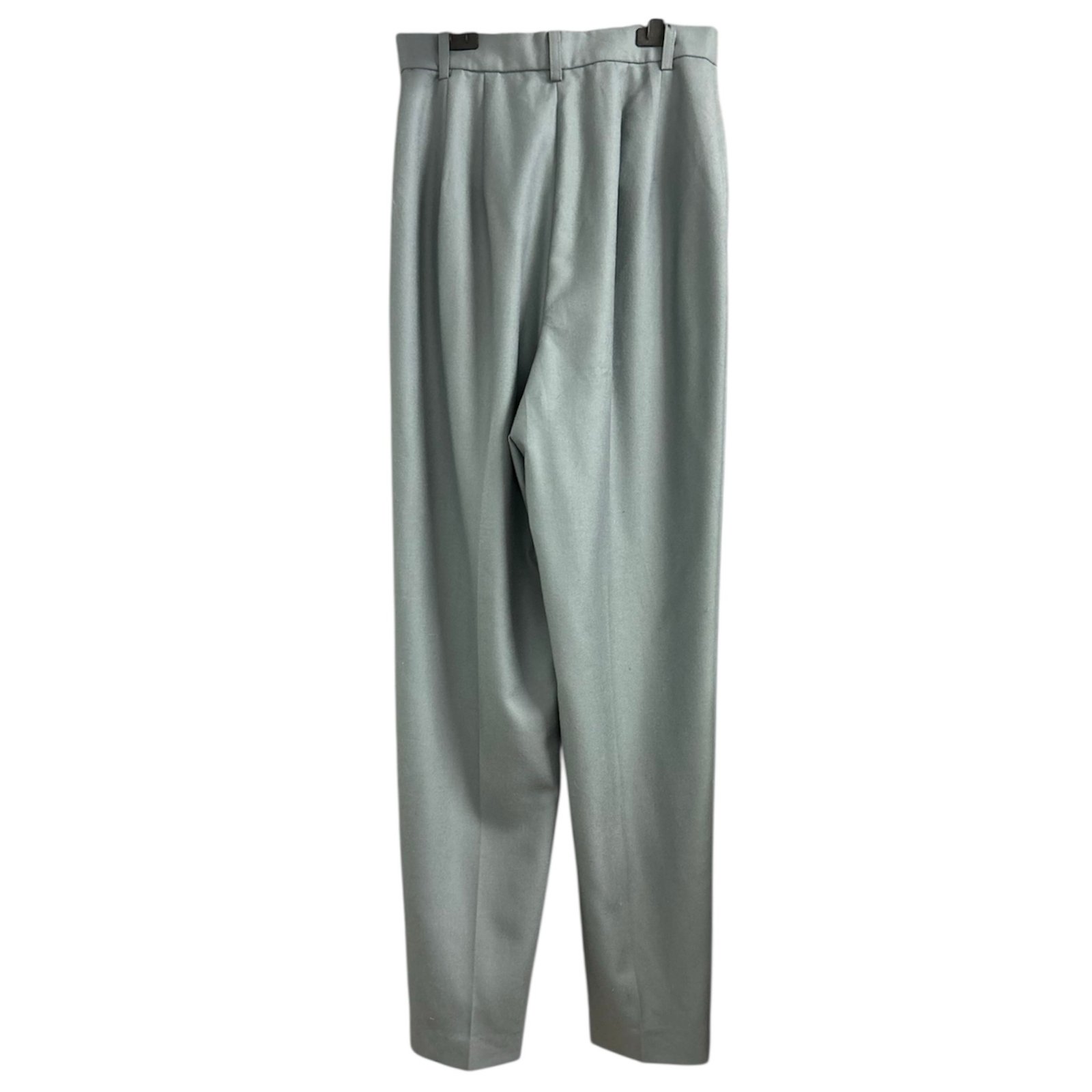 Modello a vita alta, con pences e gamba dritta ma morbida, in tinta unita grigio/celeste polvere