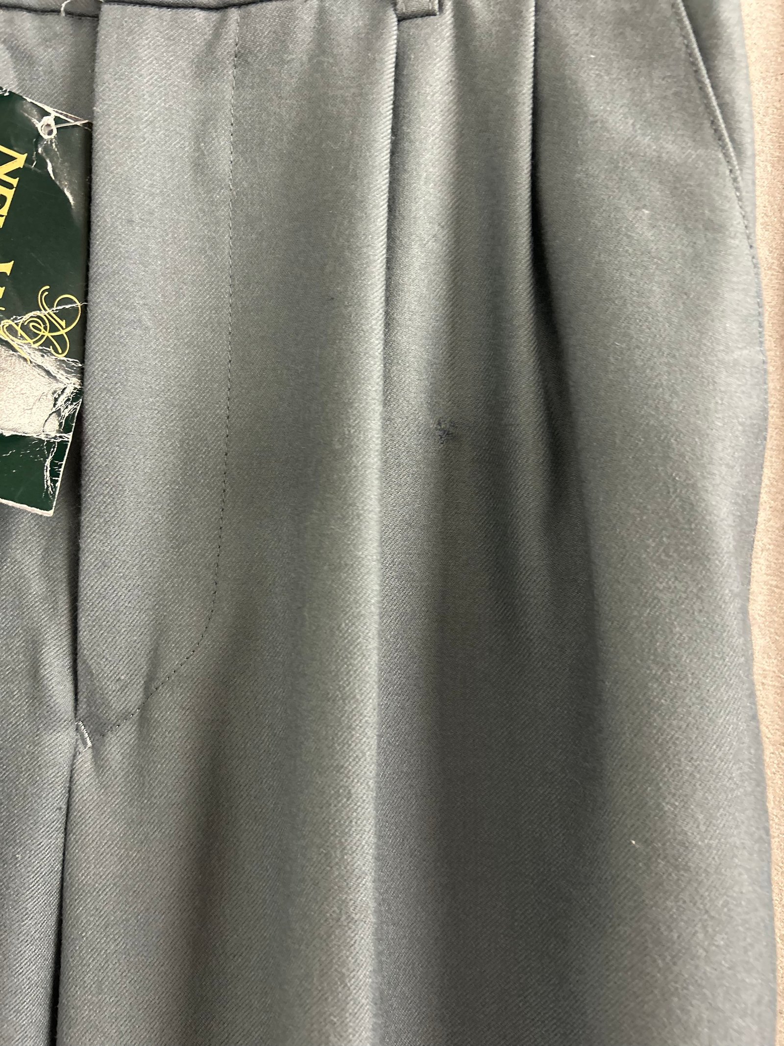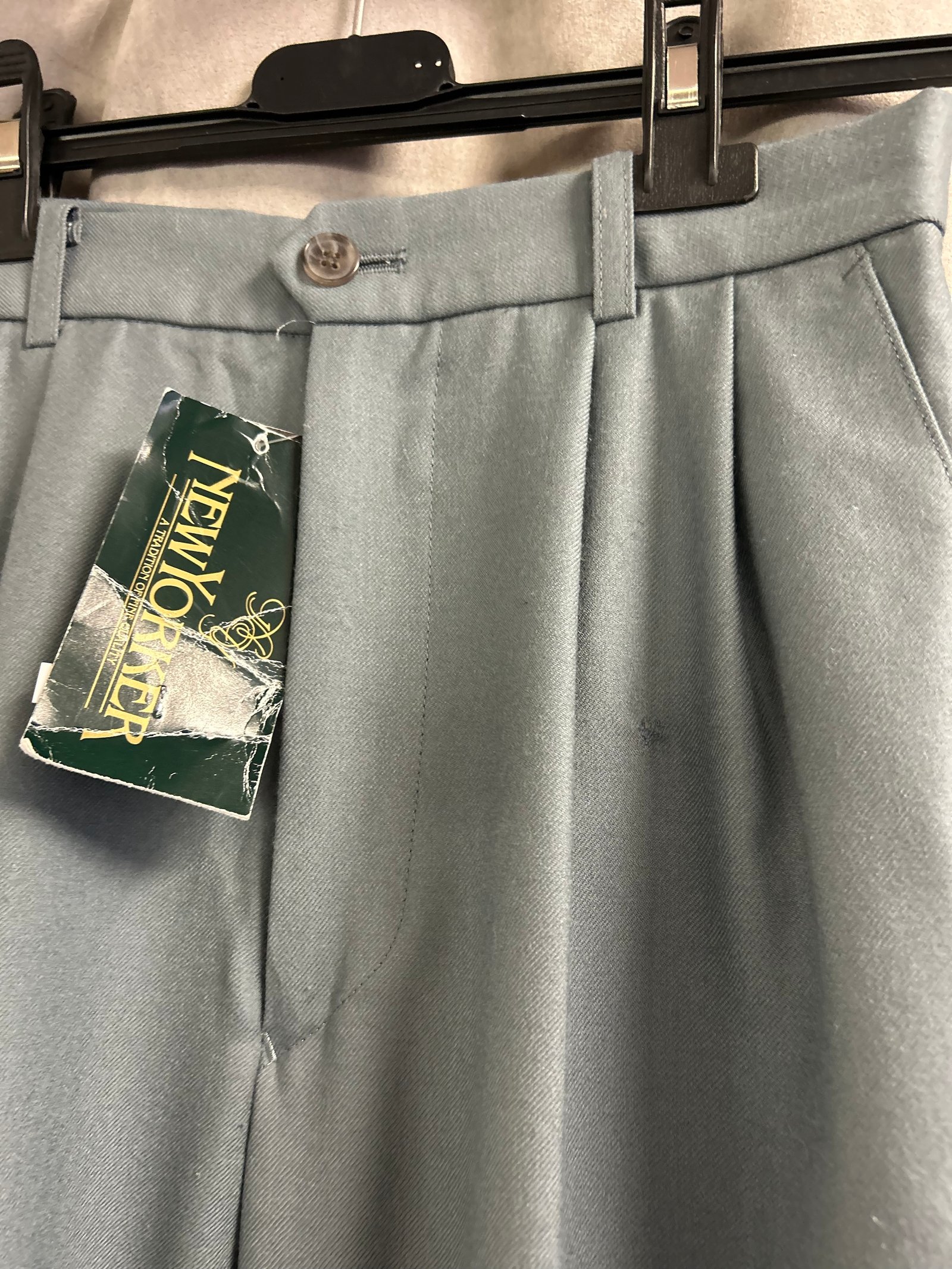 Modello a vita alta, con pences e gamba dritta ma morbida, in tinta unita grigio/celeste polvere