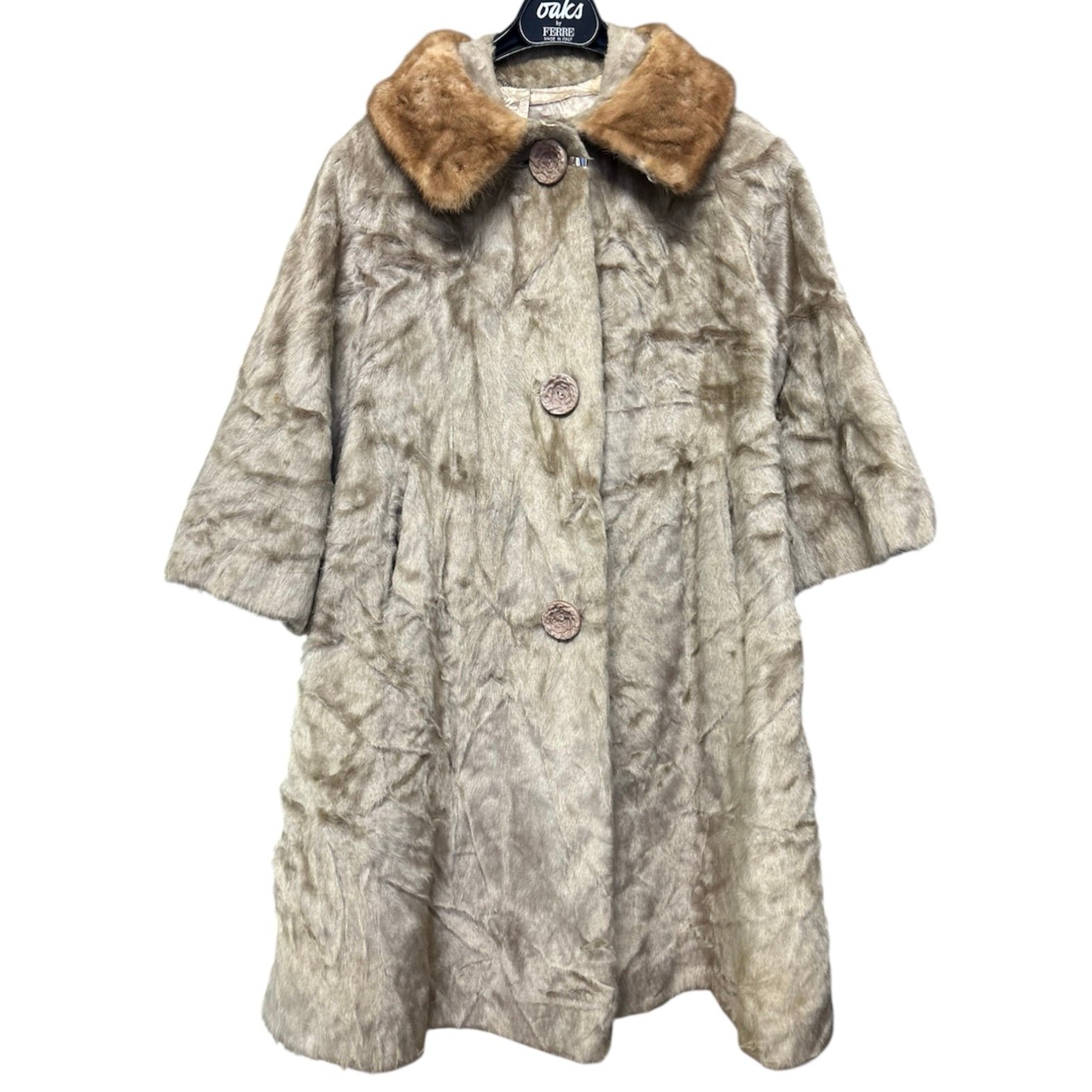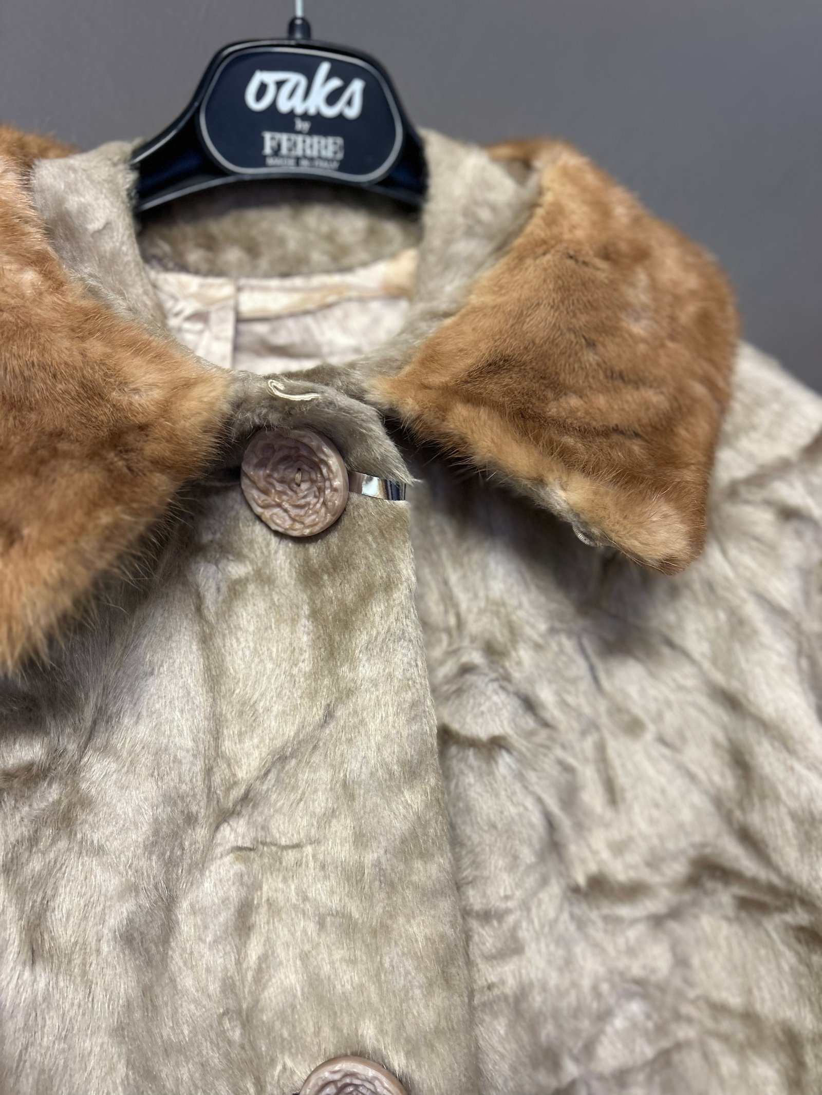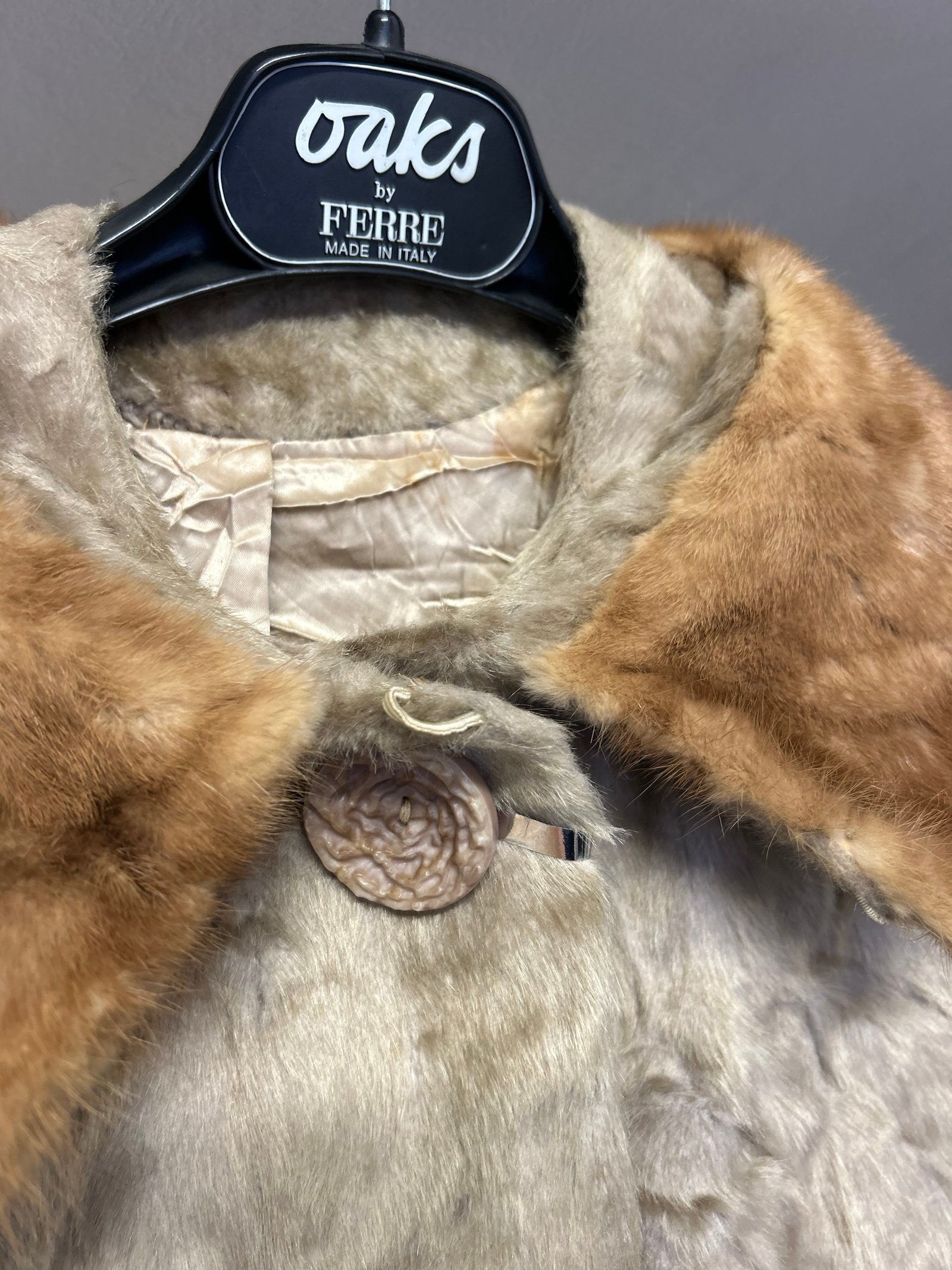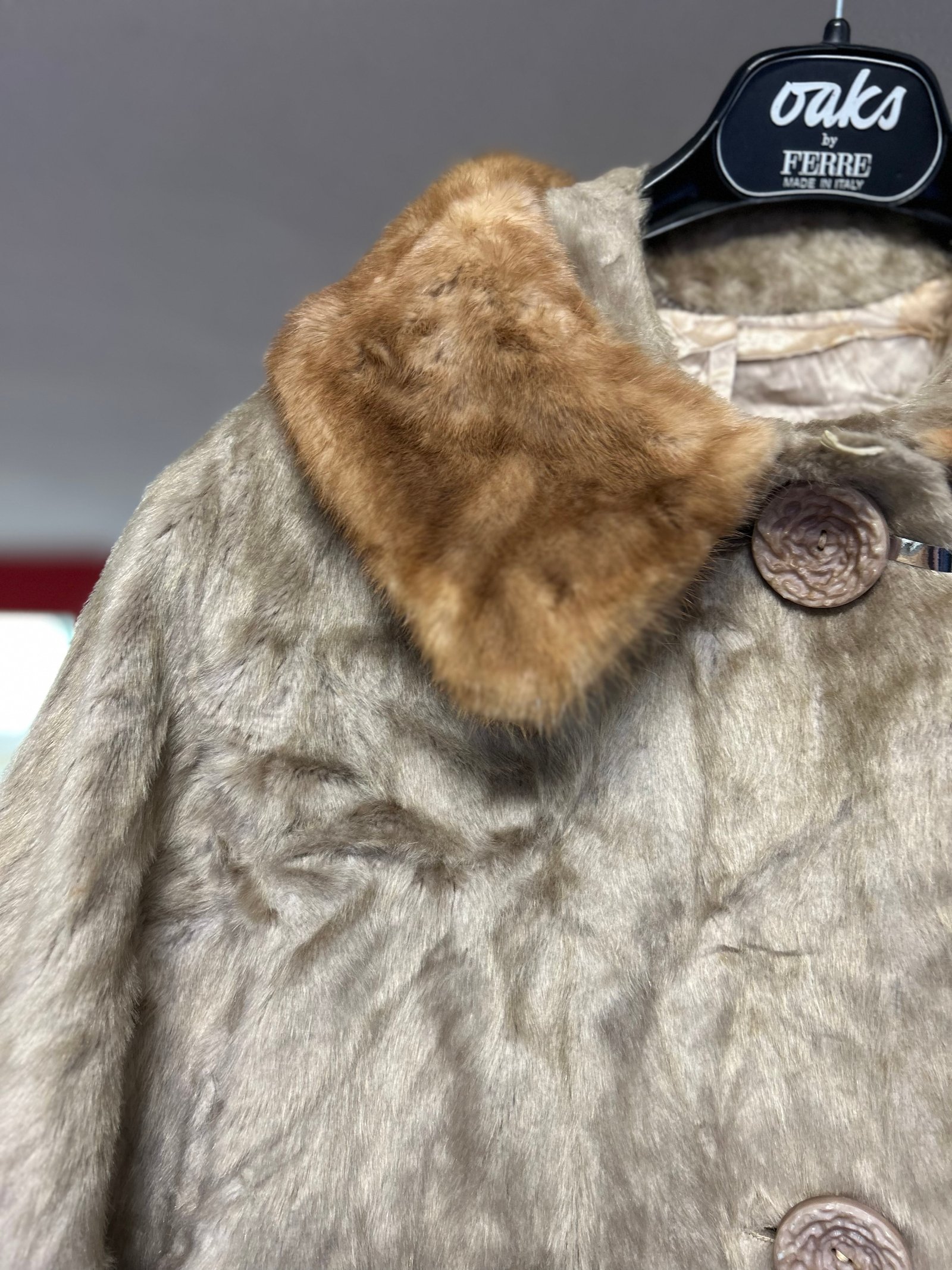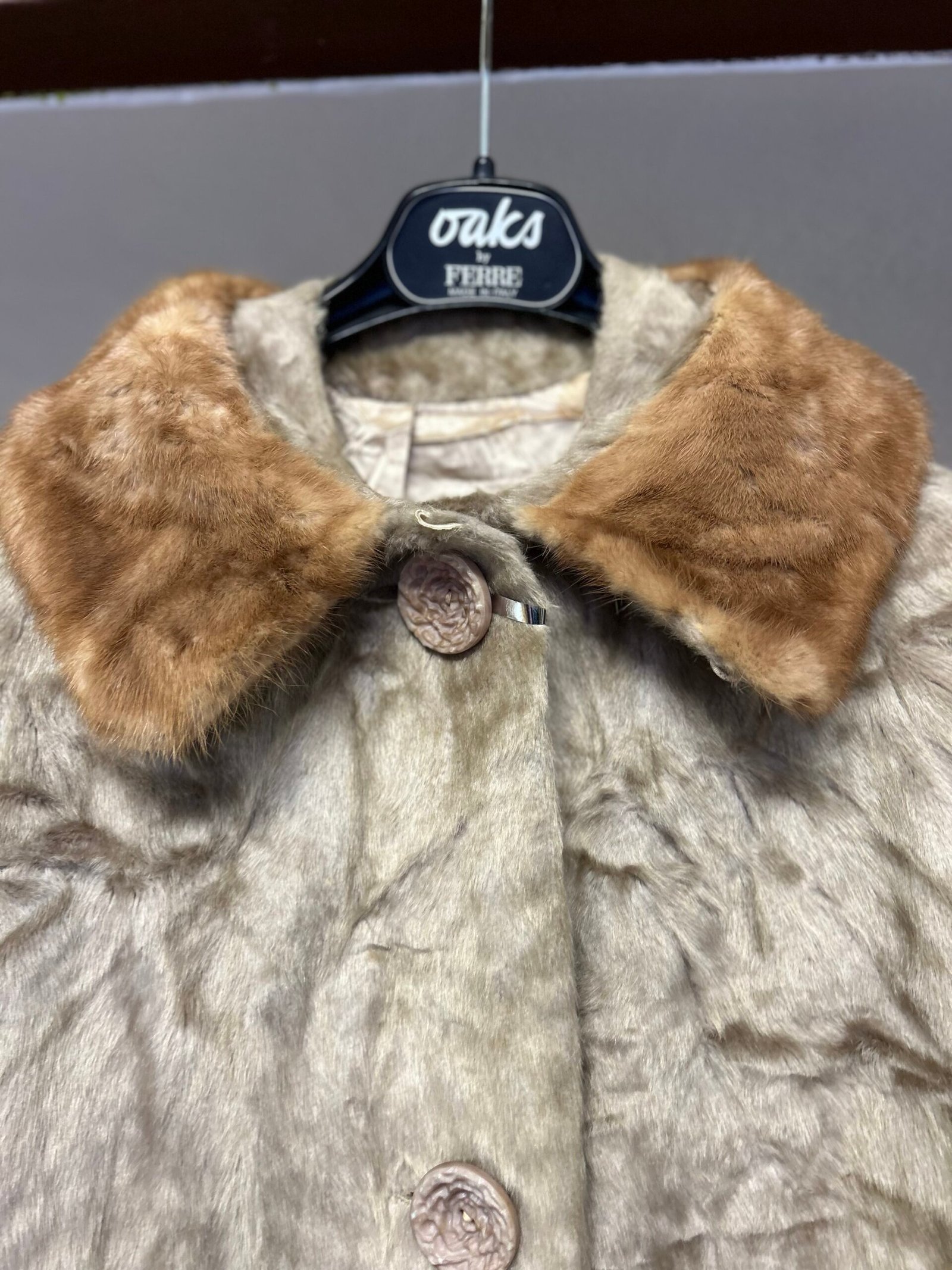 Beige chiaro con colletto color cammello, indicativamente taglia 42/44