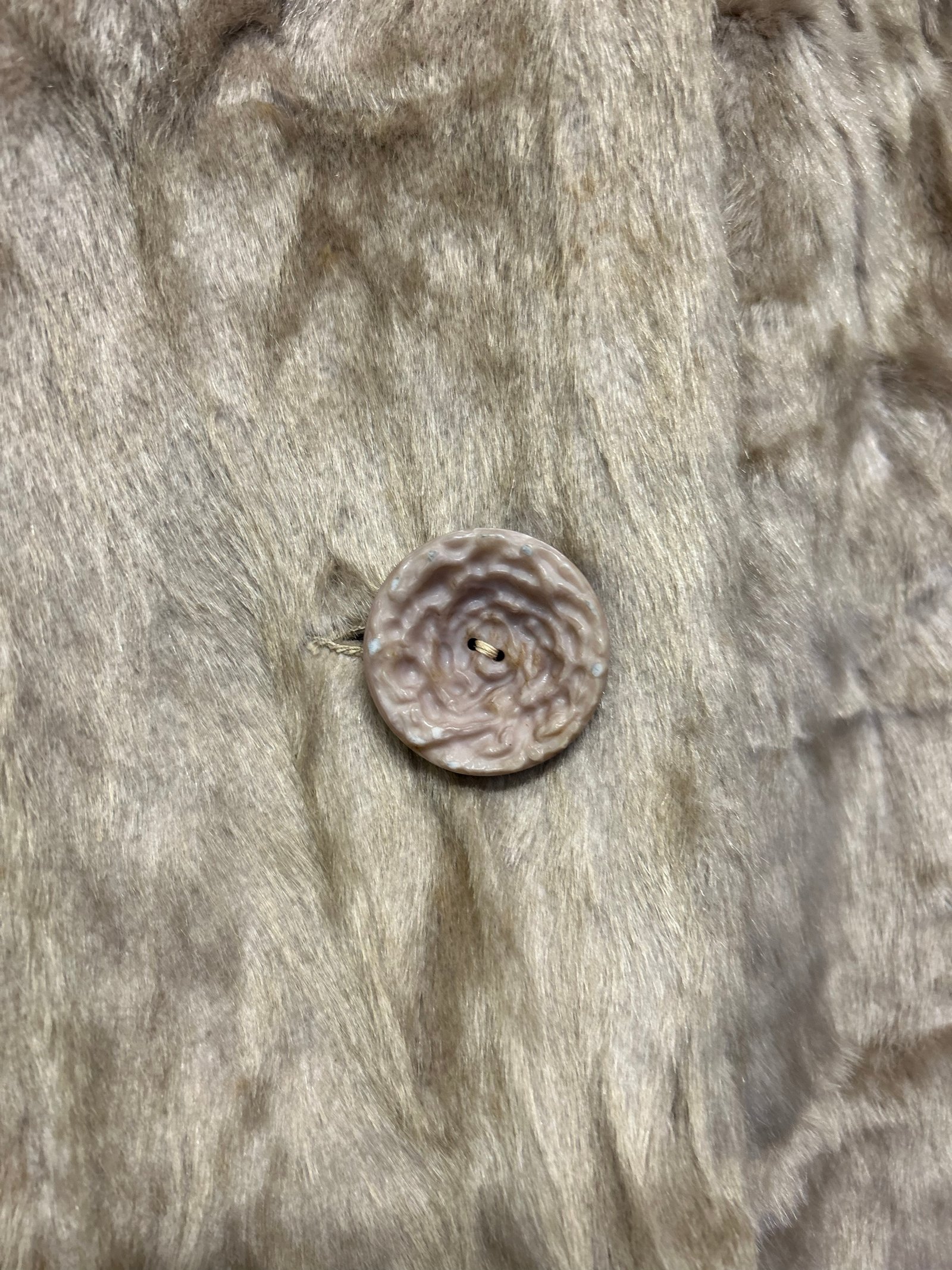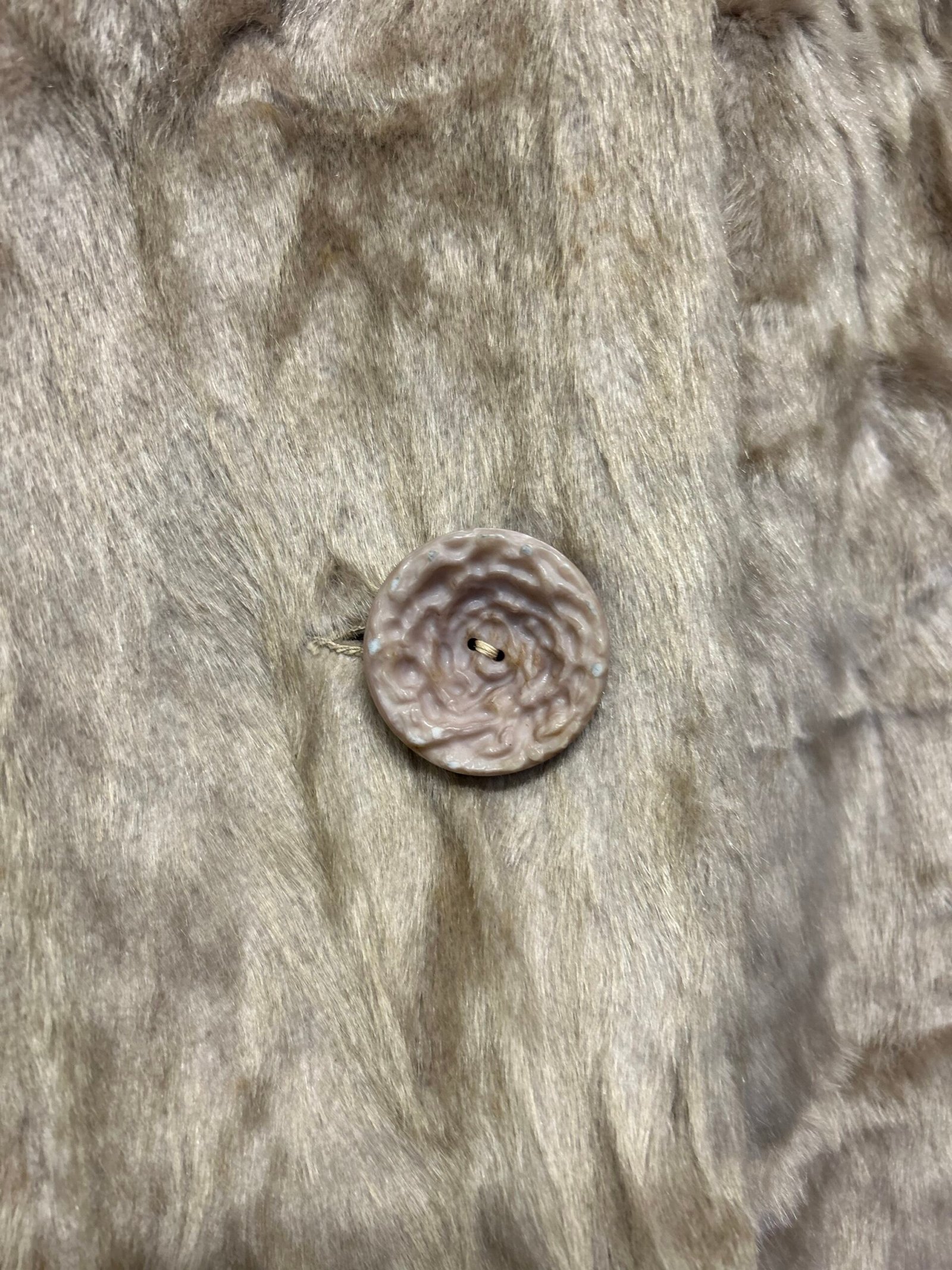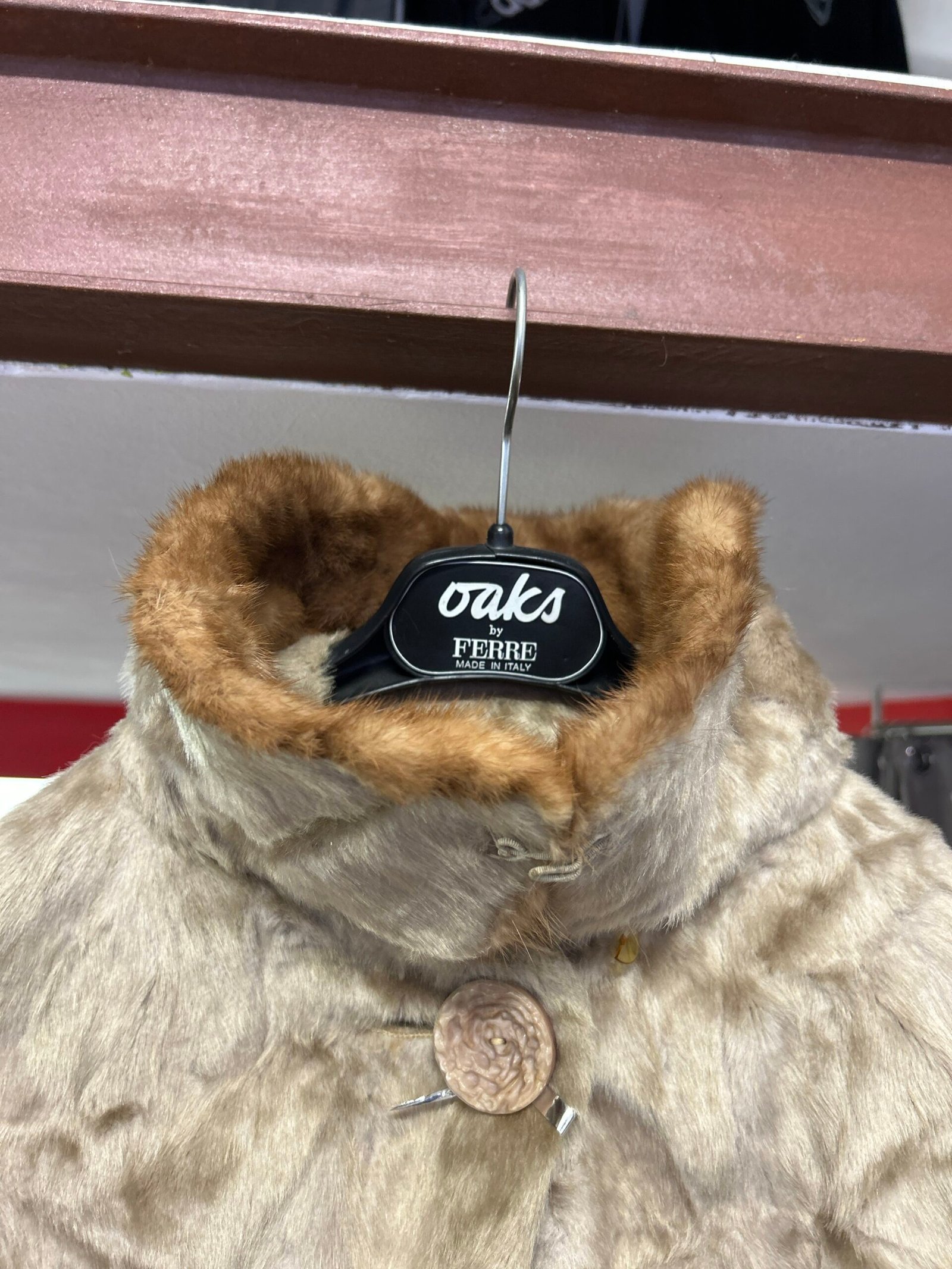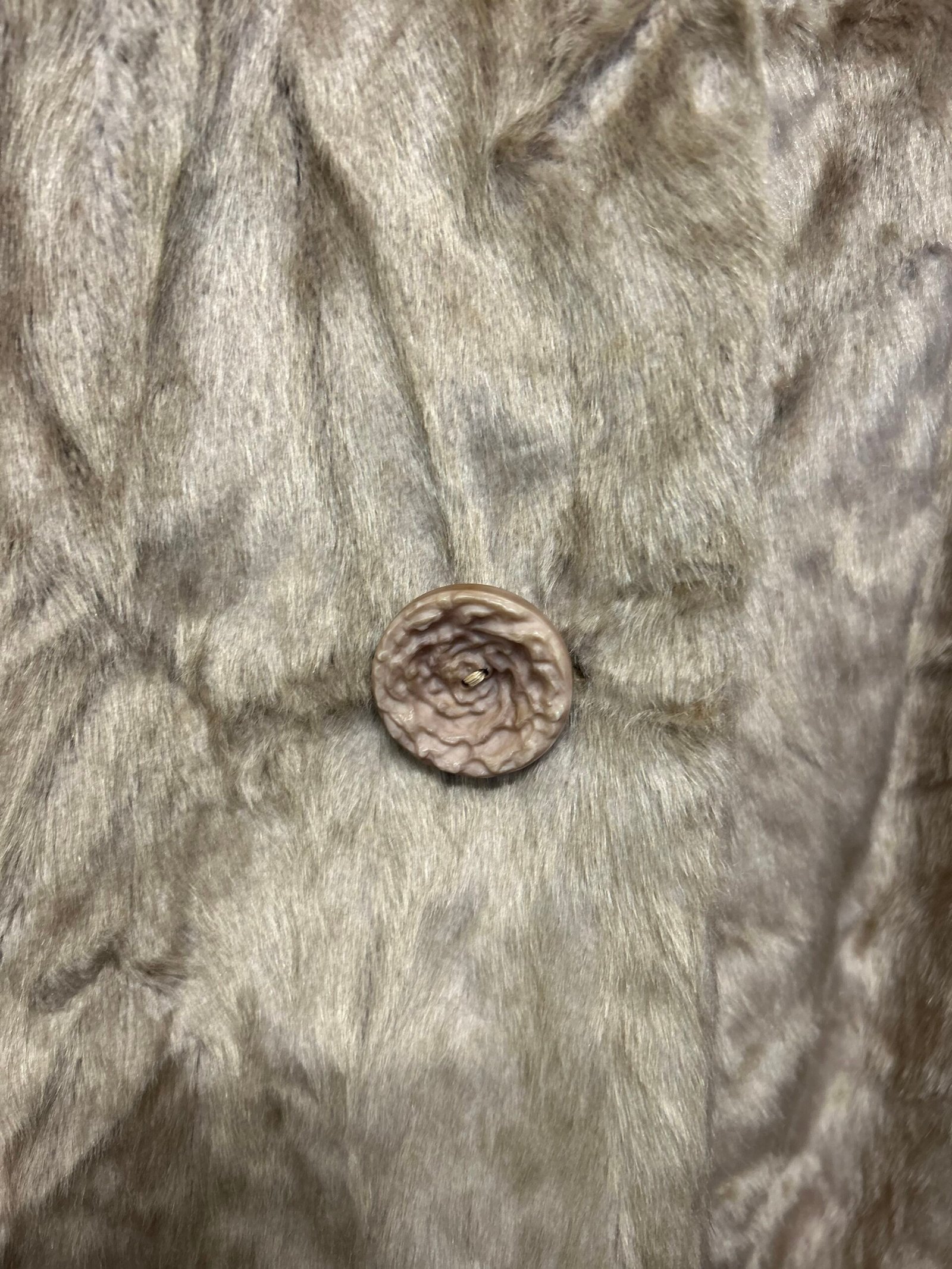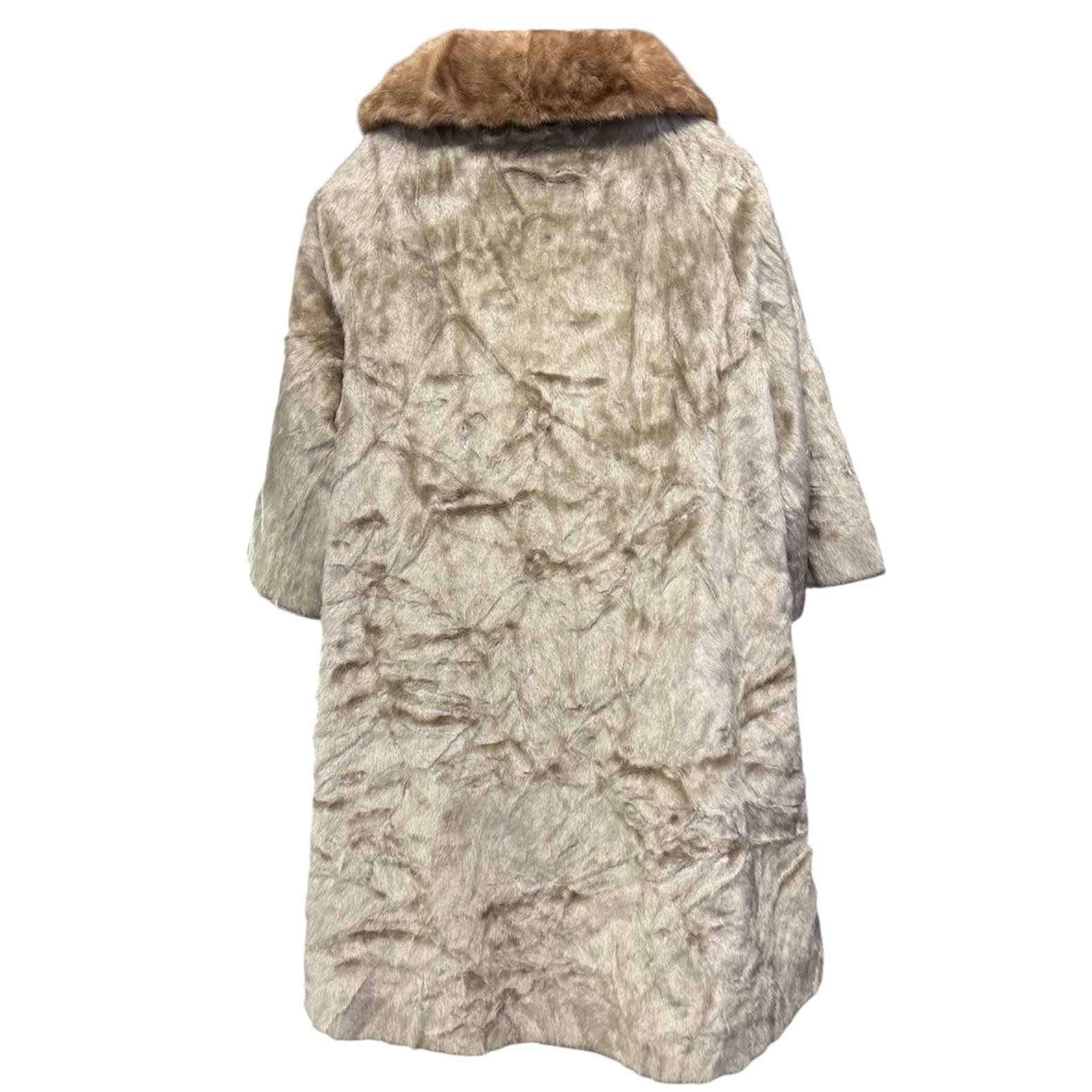 Beige chiaro con colletto color cammello, indicativamente taglia 42/44