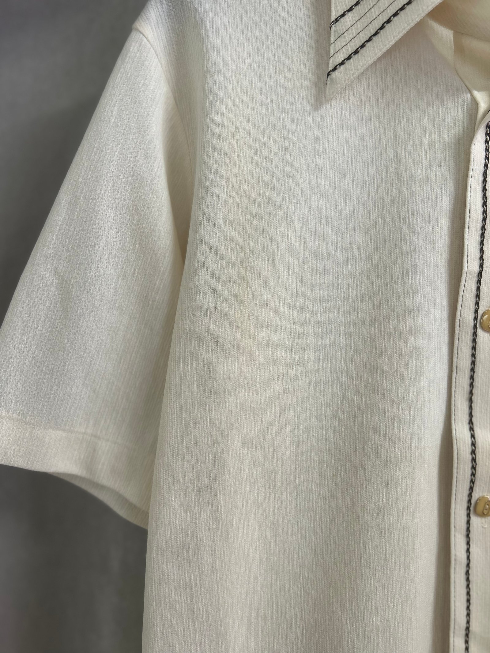 Modello tutto aperto con i bottoni, tipo camicia, con taschino sul petto, in tinta unita panna con dettagli marroni