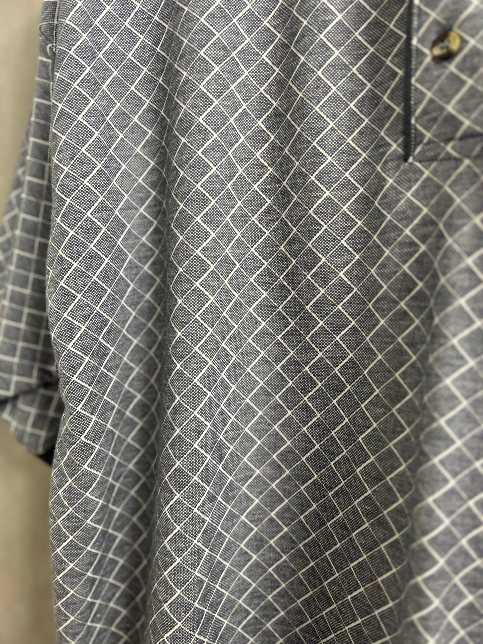 In fantasia a rombi bianchi su fondo blu jeans, con colletto e bordo della maniche blu jeans con brodo bianco