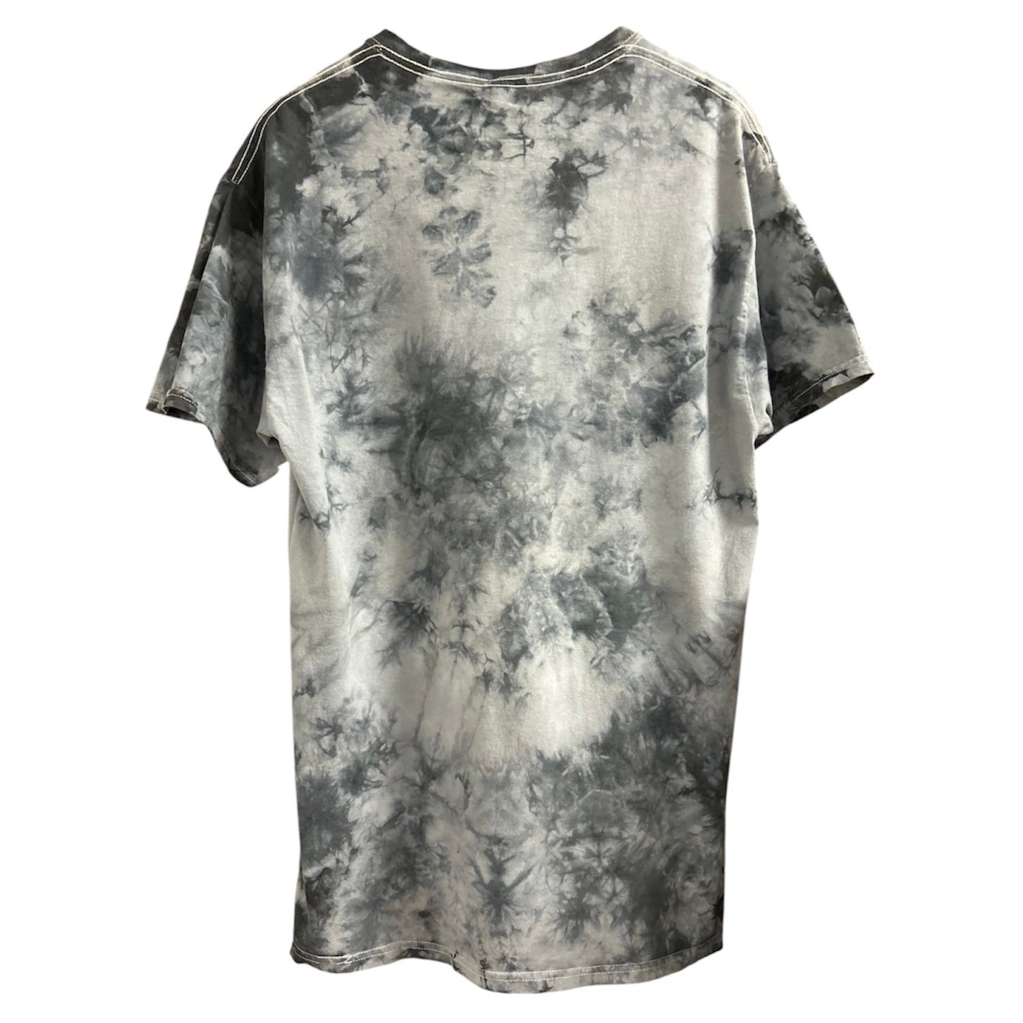 In fantasia tie dye sui toni del grigio, con stampa bianca davanti