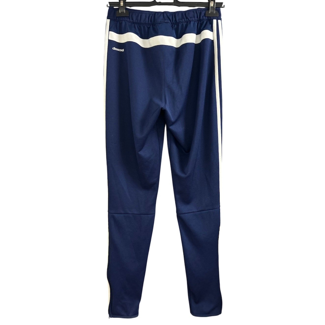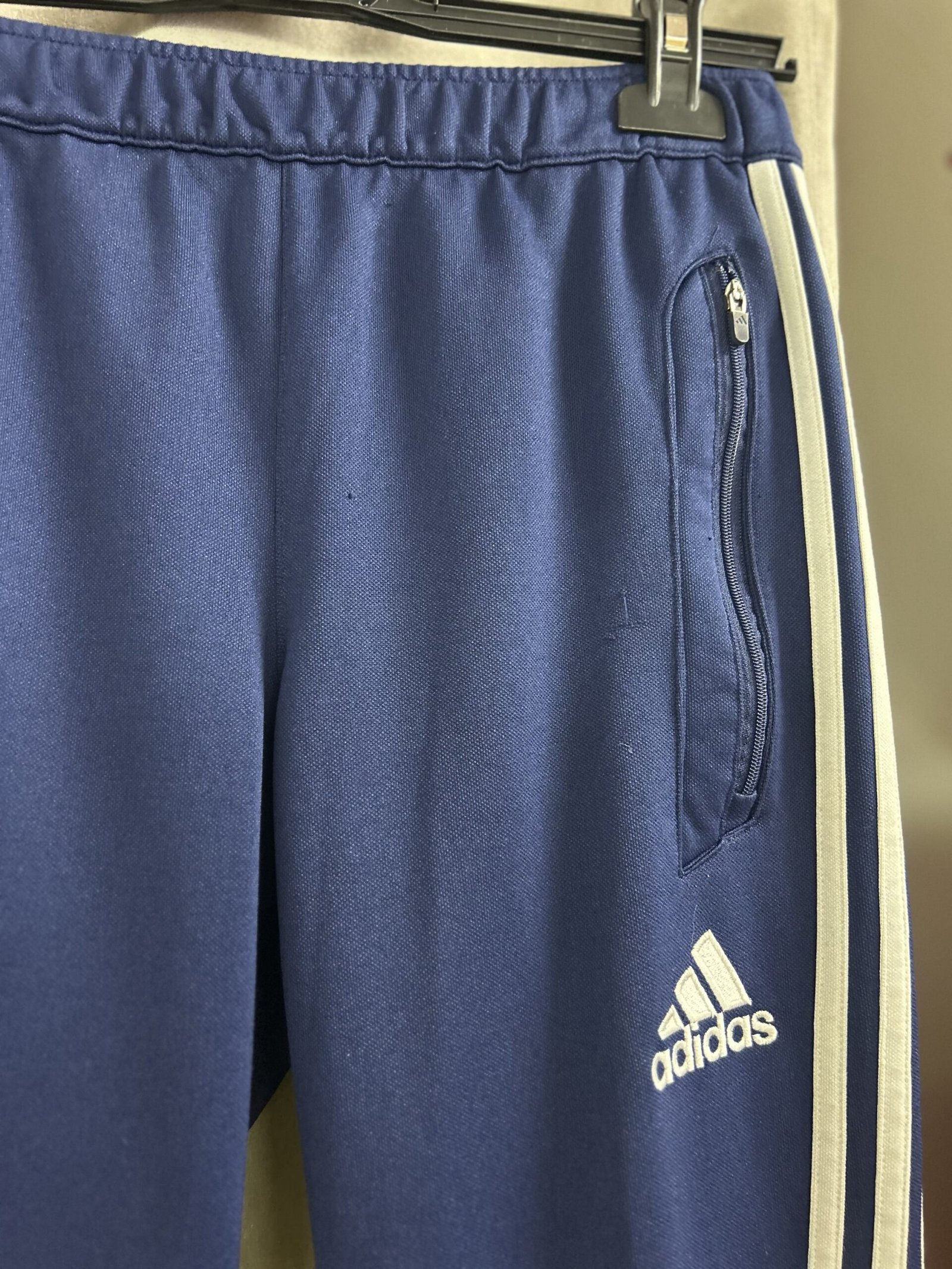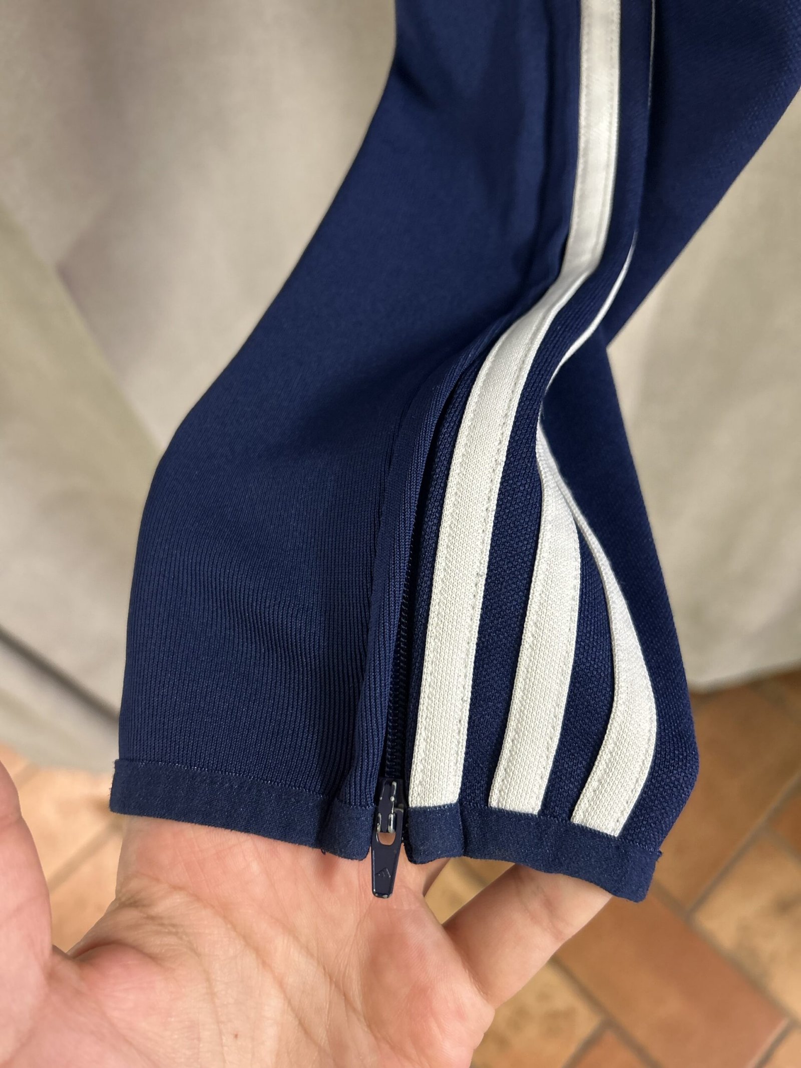 In tinta unita blu con iconiche strisce bianche laterali, con logo sulla coscia, tasche, e zip alle caviglie ed elastico in vita