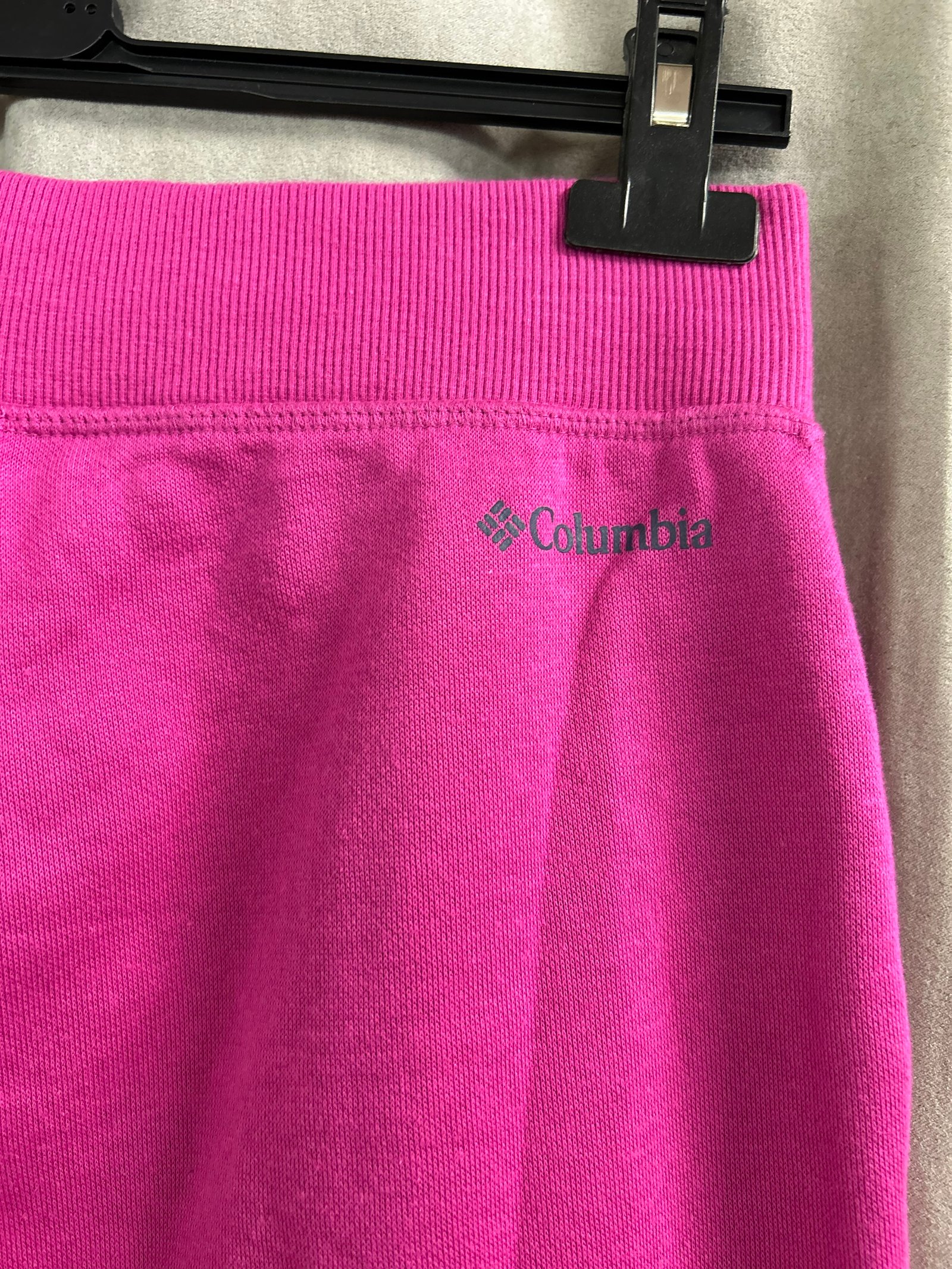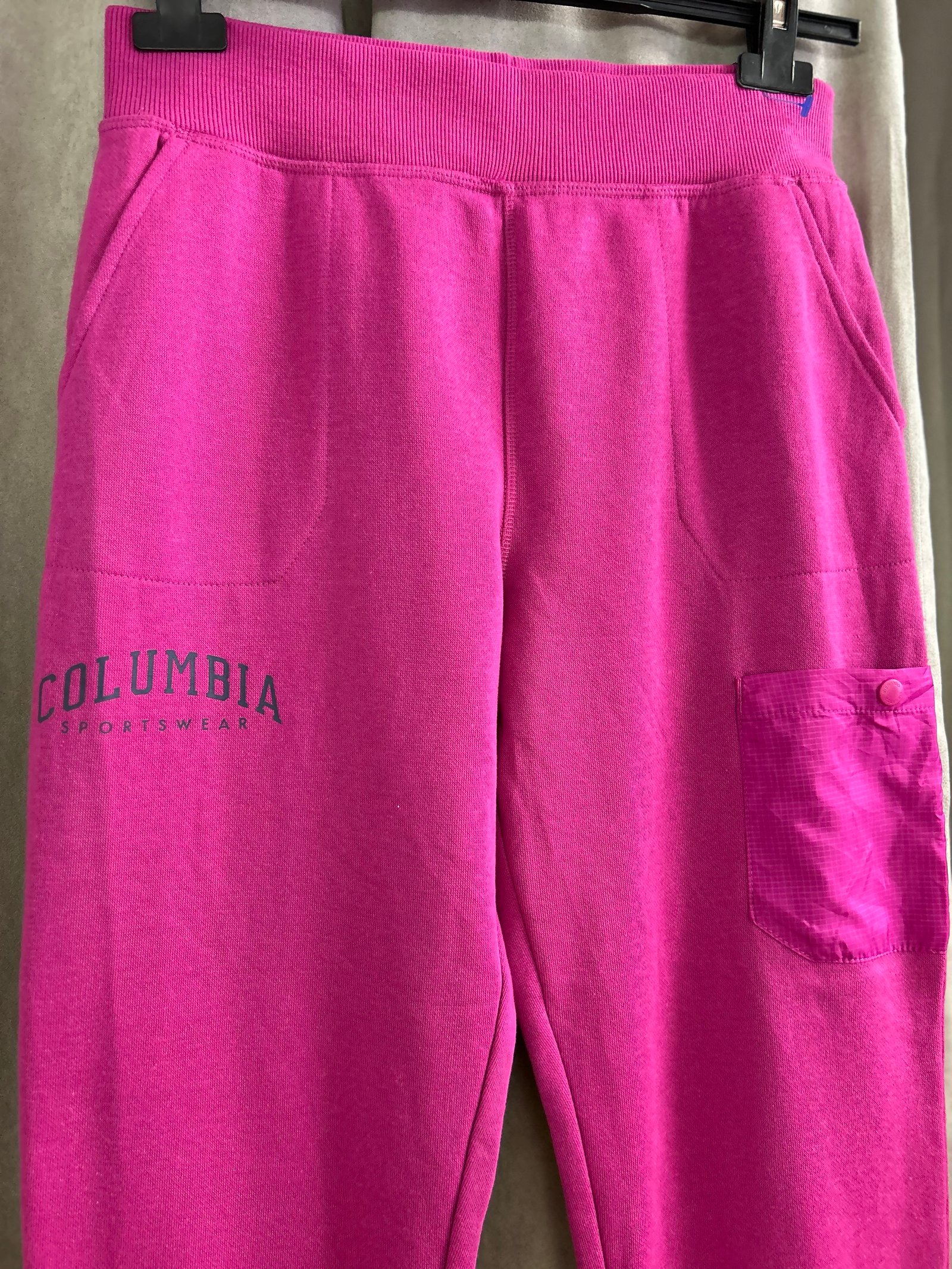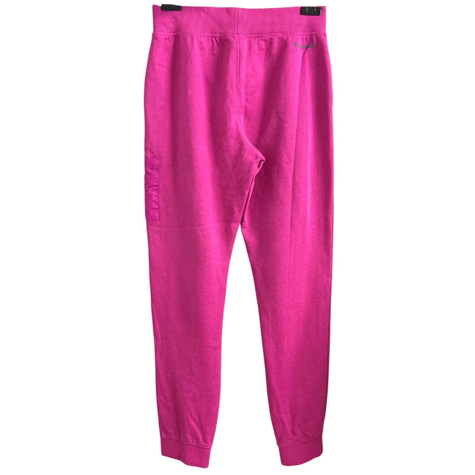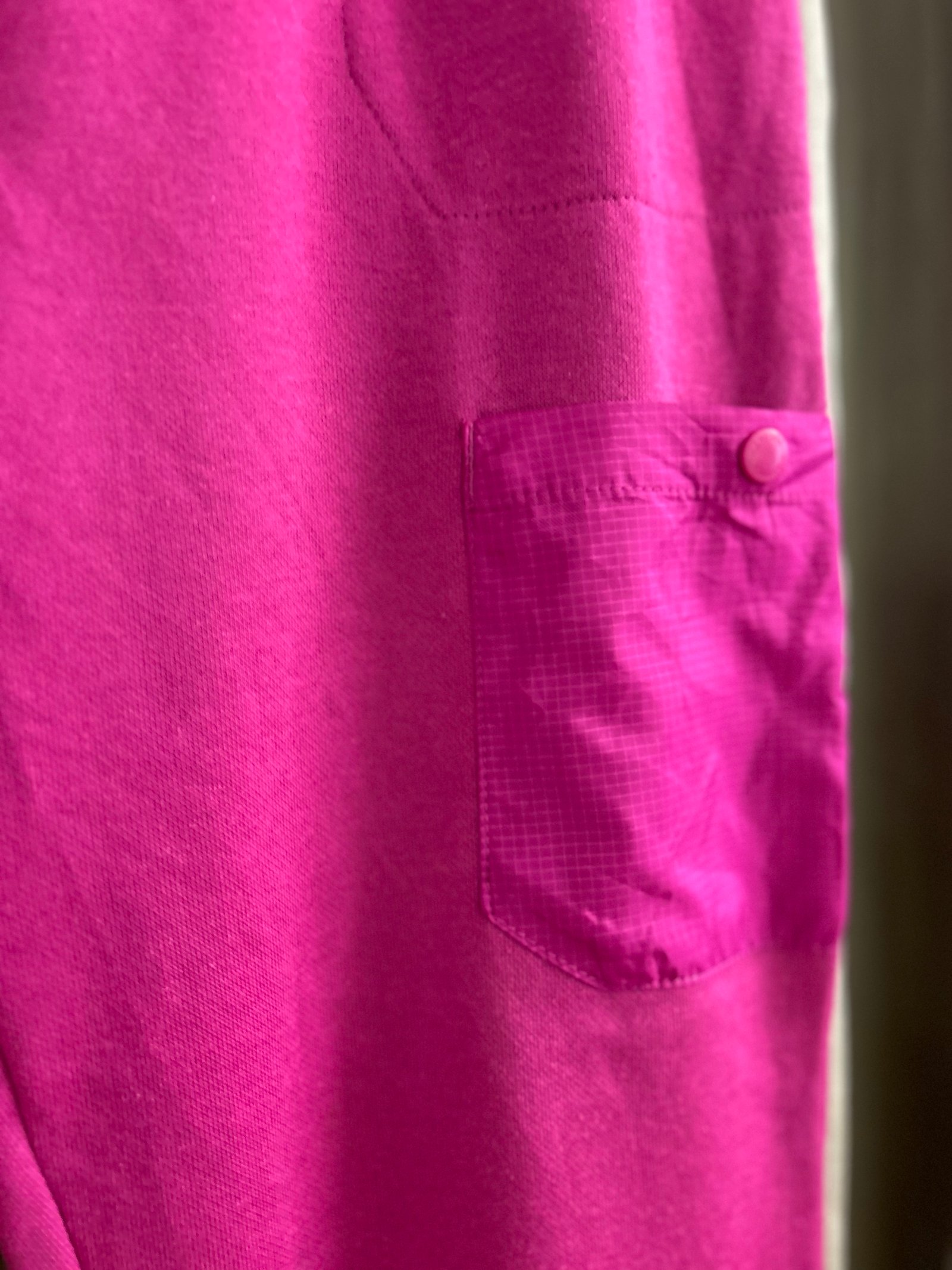 In tinta unita rosa fuxia, con elastico in vita, tasche, tasca aggiuntiva di lato in tessuto sintetico, logo sulla coscia davanti e vicino alla vita dietro, intento felpato
