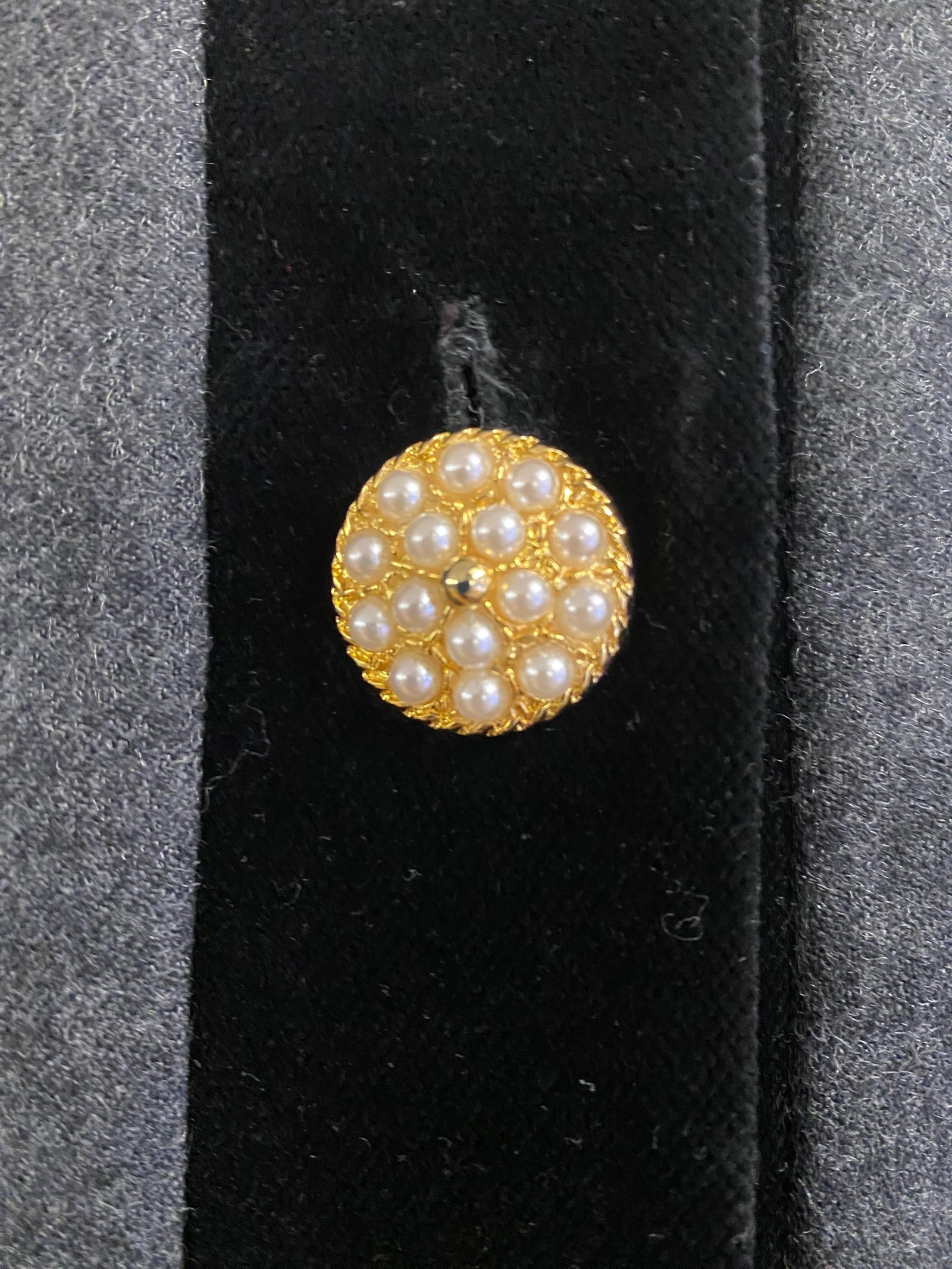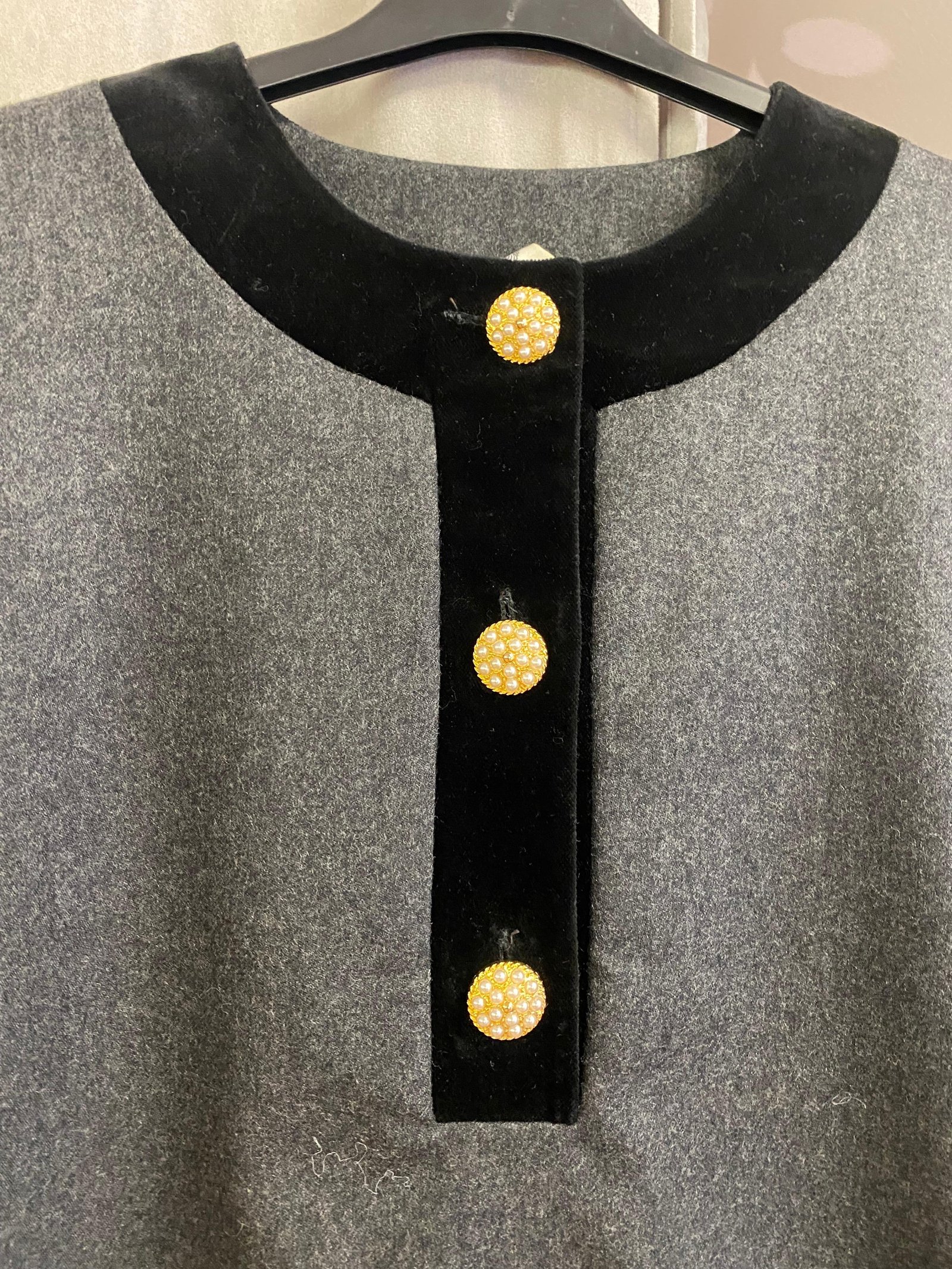 Modello dritto, in tinta unita grigio, con collo decorato con velluto nero e bottoni gioiello dorati con perline