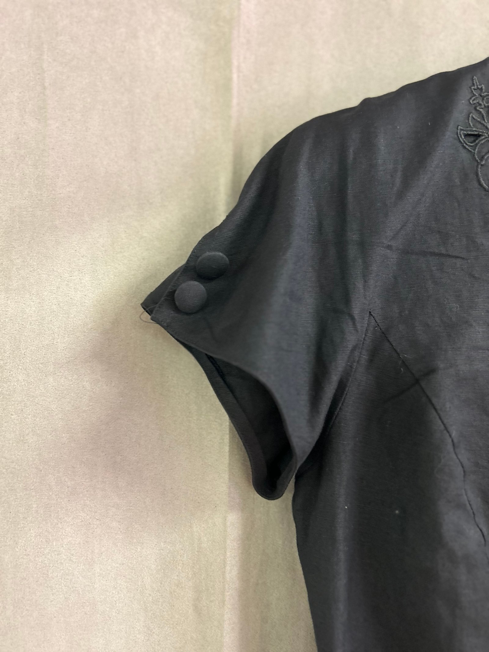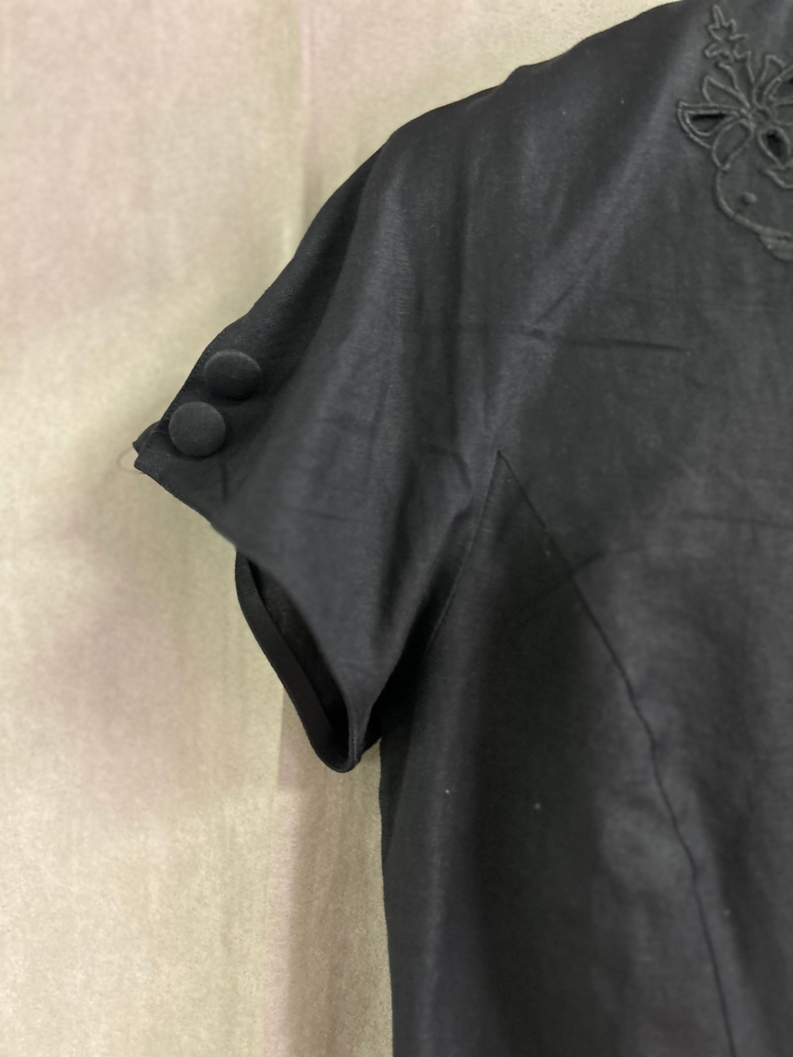 Modello simil pin up, con casacca sopra e gonna che esce sotto, la casacca รจ decorata con un ricamo traforato e i bottoni, che troviamo anche nelle maniche